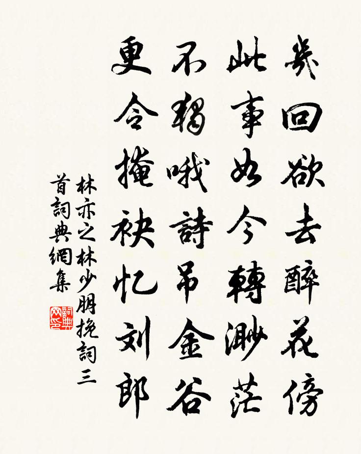 詩詞名句歷史字典書法欣賞書法字典國語詞典說文解字康熙字典古漢語字典標 題 作 者 詩 句 林少朋輓詞三首作者:林亦之 朝代:宋代林少朋輓詞三首原文幾回欲去醉花傍,此事如今轉渺茫。不獨喔詩吊金谷,更令掩袂憶劉郎。詩詞問答問:林少朋輓詞三首的作者是誰?答:林亦之問:林少朋輓詞三首寫於哪個朝代?答:宋代林亦之林少朋輓詞三首書法欣賞林少朋輓詞三首書法作品詩詞推薦寄子堂舒岳祥〔宋代〕不踐山中約,時時夢見之。況當春雨夜,正作韭虀思。種菊秋堪擷,誅茅冬未遲。人生難自料,身後要名垂。挽元寂王道士洪咨夔〔宋代〕盤隱早具眼,栗齋仍點頭。豐碑俱好在,爛醉更何求。院靜桃開落,林深鶴去留。翛然風露表,無處覓青牛。除夜徐鉉〔唐代〕寒燈耿耿漏遲遲,送故迎新了不欺。往事並隨殘曆日,春風寧識舊容儀。預慚歲酒難先飲,更對鄉儺羨小兒。吟罷頌證道歌證道歌釋印肅〔宋代〕是以禪門了知心,心心心外別無心。如今只是舊時底,不換源機放曠吟。行香退過南湖主人未起項安世〔宋代〕夢裡敲門報五更,雨中行轎到天明。若為得似張公子,臥聽穿林打葉聲。頌古一百二十一首釋宗杲〔宋代〕言無展事,語不投機。隨言者喪,滯句者學。逢人不得錯舉。夏日納涼嚴維〔唐代〕山陰過野客,鏡里接仙郎。盥漱臨寒水,褰闈入夏堂。杉松交日影,枕簟上湖光。袞袞承嘉話,清風納晚涼。偈頌一百四十一首釋師範〔宋代〕剋期取證,系縛盲驢。休夏自陳,且莫鬼語。頌古一百首釋智愚〔宋代〕以玉抵鵲,以鼠為璞。眇然視之,太虛寥廓。和遁澤初夏韻二首王柏〔宋代〕萬古南薰與舜同,何時吹入五弦中。百年喬木支秋哨,一旦新萌長露叢。世事漸如宣子日,詩情猶有大王風。來牟和微之宴張大夫家園韓維〔宋代〕郎官高會一時賢,勝踐幽棲近接聯。敢論懷黃夸故國,聊欣垂白上華筵。同心況是論交舊,二首何疑貴老年。東里小重山李彌遜〔宋代〕星斗心胸錦繡腸。厭隨塵土客,逐炎涼。江山風月伴行藏。無人識,高臥水雲鄉。肘後有仙方。假饒丹未就,壽須題僧房(一作題慈恩寺振上人院)韓翃〔唐代〕披衣聞客至,關鎖此時開。鳴磬夕陽盡,捲簾秋色來。名香連竹徑,清梵出花台。身在心無住,他方到幾回。浣溪沙(偶作)辛棄疾〔宋代〕艷杏夭桃兩行排。莫攜歌舞去相催。次第未堪供醉眼,去年栽。春意才從梅里過,人情都向柳邊來。咫尺東家還又江樓會飲對月趙汝鐩〔宋代〕層樓畫棟凌霄漢,檻外江流百頃清。無一片雲但秋色,放千里月到天明。喚舟撒網鮮鱗美,擊鼓喧汀宿鷺驚。坐上水調歌頭(壽彭守)戴翼〔宋代〕某共審:某官,瑞啟福星,祥開誕月。樓浦十萬家生齒,焚一瓣香;章江五十里附庸,上千歲壽。萬誠蕪句,申慶寓乾明觀五首楊公遠〔宋代〕月色上窗紗,移來竹影斜。夜深人已寂,更轉鼓頻撾。杜宇驚幽夢,銀釭墜細花。一時渾不記,身在羽人家。友方請贊釋妙倫〔宋代〕怒具慈悲,喜懷慘酷。指方為圓,拗曲作直。不特鑿石栽花,兼要堆雲種竹。五五合成三十六,好彩是汝不學他,種筆亭題畫高克恭〔元代〕積雨暗林屋,晚峰晴露巔。扁舟入蘋渚,浮動一溪煙。石台紀游舒岳祥〔宋代〕蒼山面長溪,勢若飲奔馬。層台跨其脊,萬古絕蕭灑。登臨惟茲時,朋從未雲寡。迢迢因榛莽,靡靡眺原野。白雲名句推薦夜深知雪重,時聞折竹聲。白居易《夜雪》 已過才追問,相看是故人。吳偉業《遇舊友》 長恨人心不如水,等閒平地起波瀾。劉禹錫《竹枝詞九首·其七》 惟將終夜常開眼,報答平生未展眉。元稹《遣悲懷三首·其三》 練於骨者,析辭必精;深乎風者,述情必顯。劉勰《文心雕龍·風骨》 夜飲東坡醒復醉,歸來仿佛三更。家童鼻息已雷鳴。蘇軾《臨江仙·夜飲東坡醒復醉》 長安故人問我,道尋常、泥酒只依然。辛棄疾《木蘭花慢·滁州送范倅》 池花春映日,窗竹夜鳴秋。李白《謝公亭·蓋謝朓范雲之所游》 春風不相識,何事入羅幃。李白《春思》 侵陵雪色還萱草,漏泄春光有柳條。杜甫《臘日》