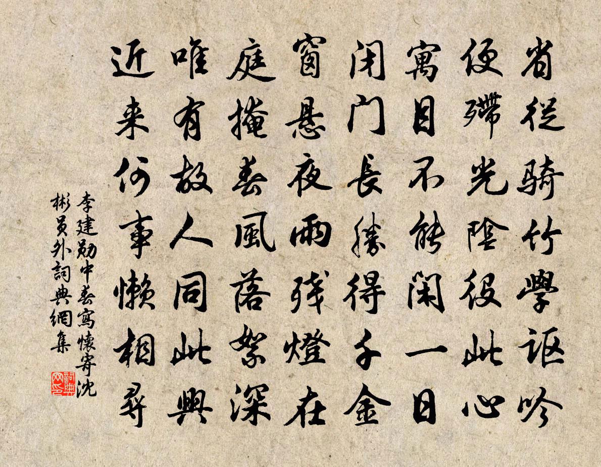 詩詞名句歷史字典書法欣賞書法字典國語詞典說文解字康熙字典古漢語字典標 題 作 者 詩 句 中春寫懷寄沈彬員外作者:李建勛 朝代:唐代中春寫懷寄沈彬員外原文省從騎竹學謳吟,便殢光陰役此心。寓目不能閒一日,閉門長勝得千金。窗懸夜雨殘燈在,庭掩春風落絮深。唯有故人同此興,近來何事懶相尋。詩詞問答問:中春寫懷寄沈彬員外的作者是誰?答:李建勛問:中春寫懷寄沈彬員外寫於哪個朝代?答:唐代問:中春寫懷寄沈彬員外是什麼體裁?答:七律李建勛中春寫懷寄沈彬員外書法欣賞中春寫懷寄沈彬員外書法作品注釋全唐詩:卷739-57詩詞推薦素風堂鄭獬〔宋代〕潁水纖纖清露石,仙翁於此買煙村。唐朝三百盛冠蓋,丞相幾家餘子孫。耀世文章雖已遠,傳家清白至今存。由來游北山王安石〔宋代〕攬轡出東城,登臨目暫明。煙雲藏古意,猿鶴弄秋聲。客坐苔紋滑,僧眠樾蔭清。賞心殊未已,山日下西榮。舒御史太夫人輓辭陳師道〔宋代〕回合江山秀,佳城去域中。佩環無曉日,苹藻自春風。斷髮人何在,捐金事已空。遂移男子孝,更作直臣忠。次韻芮漕國器憶去年上元二首周必大〔宋代〕使節番禺重,中朝社稷臣。喜沉刁斗夜,遠布玉墀春。古寺看紅葉,蕃街試幻人。餘歡曾盡否,應記繞樑塵。和十九日湖上與張集賢餞提刑張都官韻宋祁〔宋代〕共憑高榭眺雲波,使節將歸可奈何。醇酒暫留丞相飲,驪駒愁對主人歌。千岩日下催雲合,萬里風長送雁過。茲會滿江紅 玉簪次班彥功韻張雨〔元代〕玉導纖長,頓化作、雲英香莢。風弄影、錄鬟撩亂,搔頭斜插。璞小還思釵燕並,叢幽略比蕉心狹。看柔須、點綴隱居雜興楊公遠〔宋代〕一味幽閒了此生,那曾懷刺謁公卿。無官可署名雖晦,有句堪吟思自清。棋要藏機何用著,琴能識趣底須聲。何當丁宇田家有贈王維〔唐代〕〔英華作田家贈丁禹。注云。集作丁宇。誤也。〕君心尚棲隱。久欲傍歸路。在朝每為言。解印果成趣。晨雞鳴鄰和姚山長一甫陳杰〔宋代〕潭影悠悠白日閒,千年如畫此江山。高人徐孺死已朽,上疏梅仙去不還。底是憂堪埋地下,誰能遠不在人間。相逢贈休齋沈老丈葛紹體〔宋代〕澉浦東南海面橫,慣看潮落又潮生。嫌渠萬里風波險,心地一生平處行。次韻受益苦雨二首方回〔宋代〕甘澤關民命,隨時不在多。滴穿檐下石,爛倒水中荷。天有凶荒歲,人無政事科。誠心能撫字,乖氣轉為和。水調歌頭(項平甫大卿索賦武昌凱歌)張鎡〔宋代〕忠肝貫日月,浩氣抉雲霓。詩書名帥,談笑果勝棘門兒。牛弩旁穿七札,虎將分行十道,先解近城圍。一騎夜飛火書感陸游〔宋代〕衰顏非復昔年朱,幾過黃公舊酒壚。成敗只堪三太息,是非終付一胡盧。連天菸草迷歸夢,動地風波歷畏途。辛苦和鄧慎思未試即事難書率用秋日同文館為首句耿南仲〔宋代〕大軸累千箱,鳧中見鶴長。靜臨窗幾讀,爽入肺肝涼。夸咤爭求勝,疲勞忽自忘。由來京邑貢,正合冠多方。踏莎行(題團扇)蔡伸〔宋代〕落日歸雲,寒空斷雁。吳波淺淡山平遠。丹青寫出在霜縑,佳人特地栽團扇。漁艇孤煙,酒旗幽院。些兒景趣君休庭中種花蘇轍〔宋代〕空庭一無有,初種六株花。青桐綠楊柳,相映成田家。春雨散膏油,朝暾發萌牙。造物知我心,初來盡枯槎。開花雪趙希逢〔宋代〕雲雪商量未了天,模糊遠近色相兼。白呵凍手拈詩筆,青向誰家認酒帘。散亂飛花刀旋剪,須臾平地尺誰添。也知恩敕尚書省僚宴昆明池應制(同用堯字)張嘉貞〔唐代〕靈沼初開漢,神池舊浴堯。昔人徒習武,明代此聞韶。地脈山川勝,天恩雨露饒。時光牽利舸,春淑覆柔條。芳醞文昌橋邱泰〔宋代〕玉馬橫江直接艫,青鰲長此鎮名都。川雲占路通三峽,豀雪沖瀾出五湖。不愧授書初志遂,每思題柱此才無。未須送道士曾昭瑩沈麟〔唐代〕南北東西事,人間會也無。昔曾棲玉笥,今也返玄都。雪片隨天闊,泉聲落石孤。丹霄人有約,去採石菖蒲。名句推薦好問則裕,自用則小。佚名《尚書正義·卷八·仲虺之誥》 西子蒙不潔,則人皆掩鼻而過之。雖有惡人,齊戒沐浴,則可以祀上帝。孟子《孟子·離婁章句下·第二十五節》 平生塞北江南,歸來華發蒼顏。辛棄疾《清平樂·獨宿博山王氏庵》 一溪煙柳萬絲垂,無因系得蘭舟住。周紫芝《踏莎行·情似遊絲》 知我者,謂我心憂;不知我者,謂我何求。佚名《黍離》 野戰格鬥死,敗馬號鳴向天悲。李白《戰城南》 洞房昨夜停紅燭,待曉堂前拜舅姑。朱慶餘《近試上張籍水部 / 近試上張水部 / 閨意獻張水部》 佳人彩雲里,欲贈隔遠天。李白《折荷有贈》 天若有情天亦老,搖搖幽恨難禁。孫洙《河滿子·秋怨》 穿花蛺蝶深深見,點水蜻蜓款款飛杜甫《曲江二首》