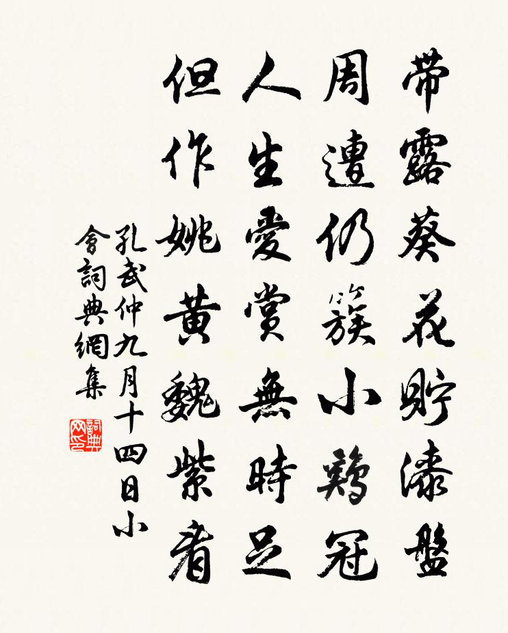 詩詞名句歷史字典書法欣賞書法字典國語詞典說文解字康熙字典古漢語字典標 題 作 者 詩 句 九月十四日小會作者:孔武仲 朝代:宋代九月十四日小會原文帶露葵花貯漆盤,周遭仍簇小雞冠。人生愛賞無時足,但作姚黃魏紫看。詩詞問答問:九月十四日小會的作者是誰?答:孔武仲問:九月十四日小會寫於哪個朝代?答:宋代孔武仲九月十四日小會書法欣賞九月十四日小會書法作品詩詞推薦辛卯元日三首方回〔宋代〕十年爭席聽漁樵,辦著心情耐寂寥。老覺歲華殊易邁,愁嫌日晷似難消。縱無詩句題桃板,也有春光到柳條。何限再和晁說之〔宋代〕官共狐裘三十年,紛紛南北笑鶯遷。未施雲外射鵰手,且作山中騎虎仙。南歌子溫庭筠〔唐代〕臉上金霞細,眉間翠鈿深。欹枕覆鴛衾。隔簾鶯百囀,感君心。謁金門(春恨)王平子〔宋代〕舊一紙。小砑吳箋香細。讀到別來心下事。蹙殘眉上翠。怕落傍人眼底。握向抹胸兒里。針線不忺收拾起。和衣和庵中雜書陸游〔宋代〕蒲龕坐久暖如春,紙被無聲白似雲。除卻放生並施藥,更無一事累天君。西江月李洪〔宋代〕渺渺長汀遠壑,蕭蕭雨葉風枝。幾回臨水送將歸。客里暗添憔悴。門枕數峰滴翠,舟橫幾度漣漪。綠秧深處鷺于飛憶秦娥曾覿〔宋代〕正飛雪。園林一樣梨花白。梨花白。畫堂簾卷,暖生春色。嵇康轉軸聲幽噎。新來多病嬌無力。嬌無力。淺紅轉黛望海潮(四之二)秦觀〔宋代〕秦峰蒼翠,耶溪瀟灑,千岩萬壑爭流。鴛瓦雉城,譙門畫戟,蓬萊燕閣三休。天際識歸舟,泛五湖煙月,西子同游老梅晦父改韻見貽走筆奉和曹彥約〔宋代〕有酒且莫斟,聽我歌一曲。所歌無長語,江梅倚修竹。炯炯寒露冰,皎皎白駒谷。粲粲能賦人,日日對高躅。詩如五仙觀方信孺〔宋代〕蹁躚天上五仙人,羊駕何年到海濱。晉漢相傳羊無有,觀中遺石自輪囷。偈頌十二首釋原妙〔宋代〕者個,爭得那個。既得那個,忘卻者個。箜篌引姜夔〔宋代〕箜篌且勿彈,老夫不要聽。河邊風浪起,亦作箜篌聲。古人抱恨死,今人抱恨生。南鄰賣妻者,秋夜難為情。長安冬日雜興六首張耒〔宋代〕空山身欲老,徂歲臘還來。愁怯年年柳,傷心處處梅。綠蔬挑甲短,紅蠟點花開。冰雪知何有,東風日夜回。尋陽送弟昌峒鄱陽司馬作李白〔唐代〕桑落洲渚連,滄江無雲煙。尋陽非剡水,忽見子猷船。飄然欲相近,來遲杳若仙。人乘海上月,帆落湖中天。一睹風雨中過龍洞閣陸游〔宋代〕飄然醉袖怒人扶,個裡何曾有畏塗。捲地黑風吹慘澹,半天朱閣插虛無。闌邊歸鶴如爭捷,雲表飛仙定可呼。莫怪烈祖佚名〔先秦〕嗟嗟烈祖!有秩斯祜。申錫無疆,及爾斯所。既載清酤,賚我思成。亦有和羹,既戒既平。鬷假無言,時靡有爭。睢陽贈李司倉劉長卿〔唐代〕白露變時候,蛩聲暮啾啾。飄飄洛陽客,惆悵梁園秋。只為乏生計,爾來成遠遊。一身不家食,萬事從人求。且喜漢陽峰曹龍樹〔清代〕東南屏翰聳崔巍,一柄芙蓉頂上栽。四面水光隨地繞,萬層峰色倚天開。當頭紅日遲遲轉,俯首青雲得得來。到此菩薩蠻(賞梅)趙長卿〔宋代〕梅花有意舒香粉。舒香已得先春信。香與露華清。露濃愁 * 。酒多愁愈重。此意誰能共。淚濕染衣斑。夜霜金縷歲晏黎廷瑞〔宋代〕歲晏甘離索,山扉午不開。凍蜂粘病菊,飢雀啄疏梅。美睡拋書冊,清齋遠酒杯。殷勤謝塵客,無事莫頻來。名句推薦人法地,地法天,天法道,道法自然。老子《老子·道經·第二十五章》 南朝四百八十寺,多少樓台煙雨中。杜牧《江南春》 清秋幕府井梧寒,獨宿江城蠟炬殘。杜甫《宿府》 相思了無益,悔當初相見。朱彝尊《憶少年·飛花時節》 知人既以為難,自知誠亦不易。吳兢《貞觀政要·卷三·論擇官》 刻舟求劍,固而不通;膠柱鼓瑟,拘而不化。程登吉《幼學瓊林·卷三·器用》 春風依舊。著意隨堤柳。趙令畤《清平樂·春風依舊》 若待明朝風雨過,人在天涯!春在天涯。虞集《南鄉一剪梅·招熊少府》 誤落塵網中,一去三十年。陶淵明《歸園田居·其一》 昨日鄰家乞新火,曉窗分與讀書燈。王禹偁《清明》