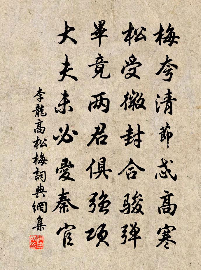 詩詞名句歷史字典書法欣賞書法字典國語詞典說文解字康熙字典古漢語字典標 題 作 者 詩 句 松梅作者:李龍高 朝代:宋代松梅原文梅夸清節忒高寒,松受微封合駿彈。畢竟兩君俱強項,大夫未必愛秦官。詩詞問答問:松梅的作者是誰?答:李龍高問:松梅寫於哪個朝代?答:宋代李龍高松梅書法欣賞松梅書法作品詩詞推薦句楊諤〔宋代〕遙觀一郡色,盡得二江聲。又送劉著作文同〔宋代〕北地戎馬後,凋殘今幾年。邊民此天幸,縣令若君賢。況自儲蓄久,定知摩撫全。好須圖善政,能為作詩傳。題浯溪胡寅〔宋代〕戎馬胡為踐神京,翠華東巡朝太清。扶桑大明涌少海,虎符百萬屯雲興。皇威意無窮髮北,老傅坐籌自巾幗。謀臣賀淮南節度盧員外賜緋羅隱〔唐代〕儉蓮高貴九霄聞,粲粲朱衣降五雲。驄馬早年曾避路,銀魚今日且從軍。御題彩服垂天眷,袍展花心透縠紋。應笑同辛簿簡仰酬思玄上人林泉四首駱賓王〔唐代〕聞君招隱地,仿佛武陵春。緝芰知還楚,披榛似避秦。崩查年祀積,幽草歲時新。一謝滄浪水,安知有逸人。芳晨柏石圖詩(並敘)蘇軾〔宋代〕陳公弼家藏《柏石圖》,其子慥季常傳寶之。東坡居士作詩,以為之銘。柏生兩石間,天命本如此。雖雲生之艱,偈頌七十八首釋正覺〔宋代〕衲僧只麽是家風,隱顯磨礱入混融。歸子返擲全歸火,羚羊掛角不同功。逍遙陸游〔宋代〕台省諸公日造朝,放慵別駕媿逍遙。州如斗大真無事,日抵年長未易消。午坐焚香常寂寂,晨興署字亦寥寥。時平偈頌四十一首釋普寧〔宋代〕梁渚溪邊下直鉤,波翻浪輥費牽抽。六年用心腕頭力,收卷絲綸憑性游。不著此岸,不著彼岸,不滯中流,欸乃一南歌子王吉昌〔元代〕絕念驅群醜,澄心剿萬緣。內樞橐龠息綿綿。一貫三宮,經緯契周天。火力溫金鼎,明循六百篇。烹成二八體方圓和樂天早春見寄元稹〔唐代〕雨香雲澹覺微和,誰送春聲入棹歌。萱近北堂穿土早,柳偏東面受風多。湖添水色消殘雪,江送潮頭涌漫波。同受自玉山歸竹隱投宿廣平院趙蕃〔宋代〕久客倦城市,薄言歸田廬。秣馬待日斂,顛風忽來俱。橫策徑成去,撲撲埃滿須。晴雷隱虛空,數雨如投珠。渴甚觀蘇仲南詩卷張耒〔宋代〕蘇子詩如刃發硎,十章入耳韻泠泠。文章三昧無多子,只守君家舊典刑。秋山圖王冕〔元代〕前年放船九江口,秋風獵獵吹蒲柳。買魚沽酒待月明,不知江上青山走。三更吹笛欲喚人,□□白露依衣巾。故鄉次韻李校書雨中至四聖觀三絕句項安世〔宋代〕花片灑行廓,苔痕上赭牆。阜陵游幸處,花草亦悲涼。種菊吟金朋說〔宋代〕眾卉競春妍,芬芳無彼此。霜寒搖落時,獨秀何如爾。新涼五言呈尤延之楊萬里〔宋代〕暑極無可增,夏余亦復幾。幽人暍欲臘,日日望秋至。秋至涼不隨,夏去熱未已。一夕睡美余,秋從簟波起。新涼禪人並化主寫真求贊釋正覺〔宋代〕寒箸蒼山之骨,雪壓老松之顛。形氣清而有像,心跡泯而亡緣。諸塵不受,一印周旋。大大小小兮方方圓圓。神觀東魯門泛舟其二李白〔唐代〕水作青龍盤石堤。桃花夾岸魯門西。若教月下乘舟去。何啻風流到剡溪。衰疾幾半月梅已空杏花亦爛漫矣忽往一觀成古張鎡〔宋代〕年前約園梅,梅開主人病。初英僅一窺,旋遭風雨橫。瑰奇恥浪設,收卷歸盡淨。追攀夢中事,詎復形嘯詠。連朝名句推薦夫禮之初,始諸飲食戴聖《禮記·禮運》 大兒鋤豆溪東,中兒正織雞籠。辛棄疾《清平樂·村居》 地下千年骨,誰為輔佐臣。戎昱《詠史 / 和蕃》 知一切法無我。得成於忍。鳩摩羅什譯《金剛經·不受不貪》 吳姬越艷楚王妃,爭弄蓮舟水濕衣。王昌齡《採蓮曲二首》 闌風伏雨催寒食,櫻桃一夜花狼藉。納蘭性德《菩薩蠻·闌風伏雨催寒食》 致虛極;守靜篤。老子《老子·道經·第十六章》 梅花雪,梨花月,總相思。張惠言《相見歡·年年負卻花期》 秋風蕭瑟天氣涼,草木搖落露為霜,群燕辭歸鵠南翔。曹丕《燕歌行二首·其一》 立身不高一步立,如塵里振衣、泥中濯足,如何超達?洪應明《菜根譚·概論》