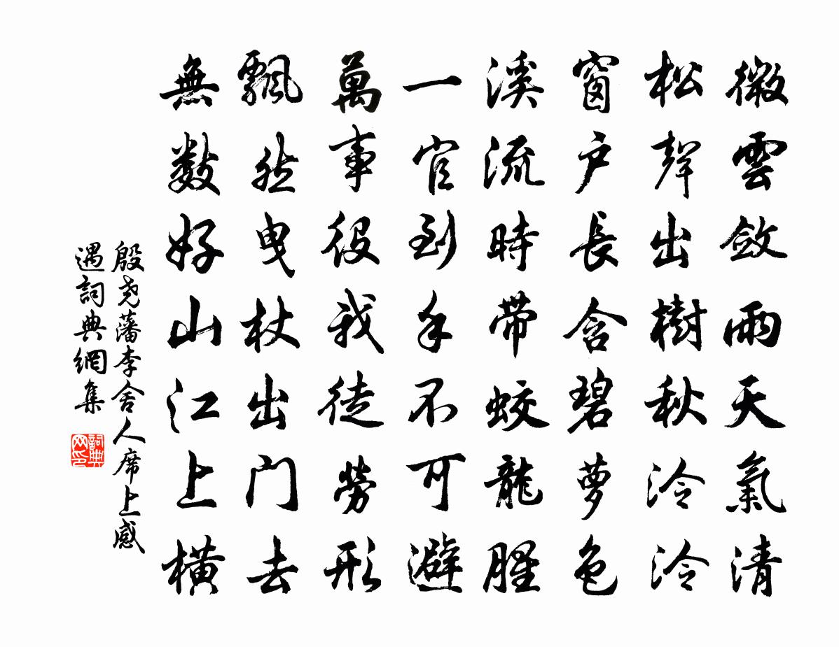 詩詞名句歷史字典書法欣賞書法字典國語詞典說文解字康熙字典古漢語字典標 題 作 者 詩 句 李舍人席上感遇作者:殷堯藩 朝代:唐代李舍人席上感遇原文微雲斂雨天氣清,松聲出樹秋泠泠。窗戶長含碧蘿色,溪流時帶蛟龍腥。一官到手不可避,萬事役我徒勞形。飄然曳杖出門去,無數好山江上橫。詩詞問答問:李舍人席上感遇的作者是誰?答:殷堯藩問:李舍人席上感遇寫於哪個朝代?答:唐代問:李舍人席上感遇是什麼體裁?答:七律殷堯藩李舍人席上感遇書法欣賞李舍人席上感遇書法作品注釋全唐詩:卷492-39詩詞推薦玉樓春梅堯臣〔宋代〕天然不比花含粉。約月眉黃春色嫩。小橋低映欲迷人,閒倚東風無奈困。煙姿最與章台近。冉冉千絲誰結恨。狂鶯偈頌一百零九首釋可湘〔宋代〕春山疊亂青,春水湛虛碧。豁開樓閣門,分身千百憶。一念差,雲羃羃,善財無路尋知識。雪裘萬頃〔宋代〕天花一夜泄春機,飛墜人間片片奇。有色有光欺柳絮,無聲無臭點梅枝。縱橫萬舞風回處,表里雙清月霽時。此景減字木蘭花張孝祥〔宋代〕愛而不見。立馬章台空便面。想像娉婷。只恐丹青畫不成。詩人老去。恰要鶯鶯相伴住。試與平章。歲晚教人枉斷至節前一日六首方回〔宋代〕蓴羹鱸膾鑑湖風,想像依稀老放翁。惜為平原多一出,詩名元已擅無窮。嘉興尉府教閱即事葛紹體〔宋代〕輕風盪宿氛,薄日籠曉晴。草嫩芟鋤易,沙軟蹙踏輕。軍容壯而肅,兵器老以剛。震動擊鼓鼙,節止鳴鐃鈣。前行游善權洞蔡肇〔宋代〕陰風漠漠護崔嵬,激澗修篁翠壑開。何處人天盡回向,於今龍象亦堪哀。常星曉掛層台冷,隕石宵飛夏屋摧。岩屍筋竹這新居僧居邠錄寄寺中留題次孫溫叟所用趙蕃〔宋代〕夢向清江不見涯,覺來身乃太行車。新居寄我山中集,倦枕渾忘午後茶。愛此好風當北牖,待來明月望西斜。但憐雜曲歌辭。水調歌第四佚名〔唐代〕隴頭一段氣長秋,舉目蕭條總是愁。只為征人多下淚,年年添作斷腸流。御箭連中雙兔蘇頲〔唐代〕宸游經上苑,羽獵向閒田。狡兔初迷窟,纖驪詎著鞭。三驅仍百步,一發遂雙連。影射含霜草,魂消向月弦。歡聲送王性之子仲言粹公赴泰州釋寶曇〔宋代〕山陰故侯家,受射幾世世。袖有換鵝經,父子固多藝。日高臥東床,吾祖得佳婿。春風鏡湖波,一夜雨新霽。得句食荀釋慧空〔宋代〕機泉擣秔炊明璣,竹根燒筍然竹枝。錦繃稚子犢獻角,玉版阿師囊穎錐。同槃若覺風味好,對客不知寒涕垂。古來九日廿二日西館雨中作孔武仲〔宋代〕西館蕭然擁罽裘,渾無桃李似潘侯。路多綠竹遮欄雨,池有殘荷掩映秋。蠻獠謳歌逢樂歲,江湖風景憶扁舟。衣冠承議郎王東起輓辭二首晁說之〔宋代〕三十年來夢,王郎歌哭情。桂亭看躍馬,蒿里望銘旌。廢相存亡托,孤兒內外並。休論書數萬,色色負平生。烏夜啼辛棄疾〔宋代〕晚花露葉風條。燕飛高。行過長廊西畔、小紅橋。歌再起,人再舞,酒才消。更把一杯重勸、摘櫻桃。病中逢秋,招客夜酌白居易〔唐代〕不見詩酒客,臥來半月余。合和新藥草,尋檢舊方書。晚霽煙景度,早涼窗戶虛。雪生衰鬢久,秋入病心初。臥簟流水詩唐寅〔明代〕淺淺水,長悠悠,來無盡,去無休。曲曲折折向東流,山山嶺嶺難阻留。 問伊奔騰何時歇,不到大海不回頭。 謁金門晏幾道〔宋代〕溪聲急,無數落花漂出。燕子分泥蜂釀蜜,遲遲艷風日。須信芳菲隨失,況復佳期難必。擬把此情書萬一,愁多翻秋山白居易〔唐代〕久病曠心賞,今朝一登山。山秋雲物冷,稱我清羸顏。白石臥可枕,青蘿行可攀。意中如有得,盡日不欲還。人生秋興陸游〔宋代〕歛盡殘雲見夕陽,門前罷亞漸登場。經年都得幾回醉,一雨頓驚如許涼。耐事尚能心似鐵,放歌仍忘發成霜。頤生名句推薦能近取譬,可謂仁之方也已。孔子弟子《論語·雍也篇》 多才之士,才儲八斗;博學之德,學富五車。程登吉《幼學瓊林·卷四·文事》 君子以儉德辟難,不可榮以祿。佚名《易傳·象傳上·否》 瓊樓玉宇。分明不受人間暑。尋常豈是無三五。郭應祥《醉落魄·丙寅中秋》 無處不傷心,輕塵在玉琴。納蘭性德《菩薩蠻·蕭蕭幾葉風兼雨》 日射紗窗風撼扉,香羅拭手春事違。李商隱《日射》 平生多感激,忠義非外獎。李白《酬裴侍御對雨感時見贈》 高齋今夜雨,獨臥武昌城。徐禎卿《在武昌作》 留春不住,費盡鶯兒語。王安國《清平樂·春晚》 松江上,念故人老矣,甘臥閒雲。吳文英《沁園春·送翁賓暘游鄂渚》