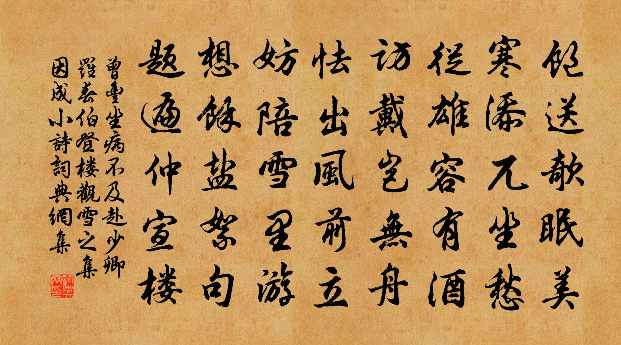 詩詞名句歷史字典書法欣賞書法字典國語詞典說文解字康熙字典古漢語字典標 題 作 者 詩 句 坐病不及赴少卿羅春伯登樓觀雪之集因成小詩作者:曾豐 朝代:宋代原文飽送欹眠美,寒添兀坐愁。從雄容有酒,訪戴豈無舟。怯出風前立,妨陪雪裡游。想余鹽絮句,題遍仲宣樓。詩詞問答問:《坐病不及赴少卿羅春伯登樓觀雪之集因成小詩》的作者是誰?答:曾豐問:該詩寫於哪個朝代?答:宋代書法欣賞坐病不及赴少卿羅春伯登樓觀雪之集因成小詩書法作品詩文賞析【原題】:坐病不及赴少卿羅春伯登樓觀雪之集因成小詩馳呈兼簡何同叔判院徐用之帳乾詩詞推薦與談命鄭柯山汪應辰〔宋代〕柯山落魄一仙翁,二十八宿羅胸中。學術該通明若鑒,襟期豁達氣如虹。醺醺痛飲一樓月,落落高談千古風。一本送蕙坡趙富陽赴高郵元幕見次武衍〔宋代〕相逢客里便相嘆,握手真能出肺肝。買得酒尊曾共酌,帶來詩卷每容看。舊聞遊宦多知己,今喜公朝與好官。一片何子應金華書院寄題張嵲〔宋代〕平生子何子,自贊如柳州。昨緣功名迕,悞落西南陬。借宅備三徑,讀書窮九丘。身與蒼梧閒,心同湘水悠。時為尚書新造花箋徐寅〔唐代〕濃染紅桃二月花,只看神筆縱龍蛇。淺澄秋水看雲母,擊碎輕苔間粉霞。寫賦好追陳後寵,題詩堪送竇滔家。使君六月二十一日早行十六首吳芾〔宋代〕病軀終日困驕陽,正慮行行去路長。多謝天公憐此意,時飛疏雨作清涼。瞿塘神君歌周文璞〔宋代〕黃衫紗帽佳少年,炯然餓虎窮山淵。不居秦鹿祖龍畔,卻走碧雞金馬邊。左手斜執巨靈鑿,右手敬抱禹貢篇。離堆題鄭侍郎岩隱(一作隱岩)十韻許棠〔唐代〕朝退常歸隱,真修大隱情。園林應得趣,岩谷自為名。野步難尋寺,閒吟少在城。樹藏幽洞黑,花照遠村明。海石東坡引辛棄疾〔宋代〕花梢紅未足。條破驚新綠。重簾下遍闌乾曲。有人春睡熟。有人春睡熟。鳴禽破夢,雲偏目蹙。起來香腮褪紅玉。次韻叔孝郎中送游黃山見一老之作二首李彌遜〔宋代〕居士逢場了世終,卻尋機語凋天然。我來不問三三句,乘覓康壺炷暖泉。題李公麟山莊圖其五發真塢蘇轍〔宋代〕山開稍有路,水放亦成川。遊人得所息,真意方澹然。次無咎凝祥春遊三首孔武仲〔宋代〕奉靈池館鎖幽深,遺蹟淒涼故老心。維岳雲車時一下,直疑弦管有來音。水琴趙汝鐩〔宋代〕盎缶停涵水一泓,中存雅意超器形。欲滴未滴天地寂,須臾宮商若相賡。妙趣不勞徽外索,泛聲不自弦上生。小點賜樞密院樓炤宋高宗〔宋代〕聯念邦家歷萬幾,幸卿相與久維持。孜孜廣道諏詢處,蹇蹇封章納誨時。半世奇勳惟我重,一生忠節自天知。南歸下第集句石延年〔宋代〕一生不得文章力,欲上青雲未有因。聖主不勞千里召,嫦娥何惜一枝春。鳳凰語下雖沾命,豺虎叢中也立身。啼得春旱二首張耒〔宋代〕大野拱連山,晴空轉規日。青春散坱莽,積水中盪潏。欣欣見群動,咄咄爭湧出。滯留無好懷,風景獨蕭瑟。離群呈唐德輿兼寄呈可久三首趙蕃〔宋代〕敬作沙隨問,歸來安穩不。一官成棄卻,微恙想今瘳。詩篋猶堪倒,錢囊不用謀。更思從二老,何日具扁舟。青玉案(重九憶羅舜舉)廖行之〔宋代〕家山此去無多路。久沒個、音書去。一別而今佳節度。黃花開未,白衣到否,籬落荒涼處。崢嶸歲月遠秋暮。空腹樂府雜曲。鼓吹曲辭。巫山高於濆〔唐代〕何山無朝雲,彼雲亦悠揚。何山無暮雨,彼雨亦蒼茫。宋玉恃才者,憑雲構高唐。自重文賦名,荒淫歸楚襄。峨峨長江二首蘇泂〔宋代〕處暑無三日,新涼直萬金。白頭更世事,青草印禪心。放鶴婆娑舞,聽蛩斷續吟。極知仁者壽,未必海之深。送董正字歸覲毗陵無可〔唐代〕暫辭讎校去,未發見新鴻。路入江波上,人歸楚邑東。山遙晴出樹,野極暮連空。何以念兄弟,應思潔膳同。名句推薦草木秋死,松柏獨在劉向《說苑·談叢》 相思已是不曾閒,又那得、工夫咒你。蜀妓《鵲橋仙·說盟說誓》 黃鶯也愛新涼好,飛過青山影里啼。徐璣《新涼》 漁父天寒網罟凍,莫徭射雁鳴桑弓。杜甫《歲晏行》 竹柏皆凍死,況彼無衣民。白居易《村居苦寒》 酷憐嬌易散,燕子學偎紅。納蘭性德《臨江仙·絲雨如塵雲著水》 一身報國有萬死,雙鬢向人無再青。陸游《夜泊水村》 兒孫自有兒孫福,莫為兒孫做馬牛。佚名《增廣賢文·上集》 昭君拂玉鞍,上馬啼紅頰。李白《王昭君二首》 古人忠孝,不離心頭,今人忠孝,不離口頭,此是何等志量。王永彬《圍爐夜話·第二三則》