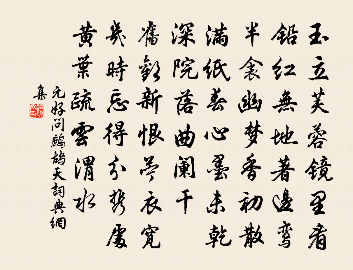 詩詞名句歷史字典書法欣賞書法字典國語詞典說文解字康熙字典古漢語字典標 題 作 者 詩 句 鷓鴣天作者:元好問 朝代:金代鷓鴣天原文玉立芙蓉鏡里看。鉛紅無地著邊鸞。半衾幽夢香初散,滿紙春心墨未乾。深院落,曲闌乾。舊歡新恨薴衣寬。幾時忘得分攜處,黃葉疏雲渭水詩詞問答問:鷓鴣天的作者是誰?答:元好問問:鷓鴣天寫於哪個朝代?答:金代問:鷓鴣天是什麼體裁?答:詞問:元好問的名句有哪些?答:元好問名句大全元好問鷓鴣天書法欣賞鷓鴣天書法作品詩詞推薦頌古一百首釋智愚〔宋代〕融峰強萬丈,未話足先酸。若不緣雲去,那知星斗寒。鷓鴣天(漫壽)米芾〔宋代〕雲液無聲白似銀。紅霞一抹百花新。觴多莫壓頻頻勸,一片段預告飛減卻春。蜂翅亂,蝶眉顰。花間啼鳥勸遊人。人生北高峰屢欲登而輟方回〔宋代〕擬上高峰最上頭,籃輿已賃又還休。舊來詩眼如今別,添與江南一段愁。除夕陸游〔宋代〕熾炭爐中百藥香,屠蘇煎酒代椒觴。明朝賴是無來客,雪後泥深一尺強。題簡齋袁說友〔宋代〕胸中元自有江山,故向巴丘見一斑。明月清風收拾盡,簡齋詩遂滿人間。次胡仲方東湖送別韻項安世〔宋代〕只知白下棠花白,不記湖邊草色新。鬱郁樓台籠戍柳,荒荒苔蘚畫游舲。重來老子慚無恨,徉臥尊前醉不醒。投曉酬成賢良陳起〔宋代〕獻璞無成喜弄璋,世間得失事相參。劉蕡不得言時事,半為當時記朴庵。鏡湖張惟中〔宋代〕昔年曾過賀家湖,今日煙波太半無。惟有一天秋夜月,不隨田畝入官租。如占城經吳川極浦亭陳宜中〔宋代〕顛風吹雨過吳川,極浦亭前望遠天。有路可通環嶼外,無山堪並首陽巔。溪雲起處潮初長,夜月高時人未眠。異日朝中措(山樊)趙師俠〔宋代〕亂山春過雪成堆。七里遞香回。蕊簇玲瓏金粟,花裝碎屑玫瑰。蘭衰梅謝,桃粗李俗,誰與追隨。清絕殿春仙侶,金剛隨機無盡頌妙行無住分第四釋印肅〔宋代〕諸塵勿易難,那個別歸關。可憐迷妄者,橫錫步雲山。和襲美松江早春陸龜蒙〔唐代〕柳下江餐待好風,暫時還得狎漁翁。一生無事煙波足,唯有沙邊水勃公。冬日即事張耒〔宋代〕郡閒多暇日,況乃值清冬。風葉已成掃,霜蕪猶復重。佛香留夜火,蔬飯候晨鐘。誰信二千石,心如一衲翁。鳳歸雲二首佚名〔唐代〕金井欄邊見羽儀,梧桐枝上宿寒枝。五陵公子憐文彩,畫與佳人刺繡衣。飲啄蓬山最上頭,和煙飛下禁城秋。曾將大別山彭天益〔宋代〕江漢西南萬里來,雙流合處聳崔巍。神鰲載得蓬瀛去,金粟擎將世界回。呈屯田強至〔宋代〕溪水日夜落,稍稍露沙面。經旬更不雨,深處亦成澱。巨篙架空航,澀若泝淺澱。況乃載百指,數纜安可縴。念此送李秘書卻赴南中劉長卿〔唐代〕卻到番禺日,應傷昔所依。炎洲百口住,故國幾人歸。路識梅花在,家存棣萼稀。獨逢回雁去,猶作舊行飛。寒食日經秀上人房鄭文寶〔宋代〕花時懶看花,來訪野僧家。勞師擊新火,勸我雨前茶。和司令洪文詠梅花兩絕句程公許〔宋代〕舊遊無處問芳華,身似禪僧處處家。聊共梅花娛歲晚,又催元日頌椒花。中秋不見月次韻元衡十四夜江乾步月五言趙蕃〔宋代〕月待今宵滿,秋空此夕中。與君俱客路,而我欠詩工。短髮添新白,頹顏失舊紅。波長嬉屬玉,渚遠愴賓鴻。名句推薦無田似我猶欣舞,何況田間望歲心。曾幾《蘇秀道中》 玉容寂寞淚闌乾,梨花一枝春帶雨。白居易《長恨歌》 善游者溺,善騎者墮,各以所好反自為禍。文子《文子·卷四·符言》 獨坐幽篁里,彈琴復長嘯。王維《竹里館》 未收天子河湟地,不擬回頭望故鄉。令狐楚《少年行四首·其三》 海燕歲微渺,乘春亦暫來。張九齡《歸燕詩》 颯颯東風細雨來,芙蓉塘外有輕雷。李商隱《無題·颯颯東風細雨來》 奢侈者鮮有不敗李大師、李延壽《南史·列傳·卷四十五》 白髮三千丈,緣愁似個長。李白《秋浦歌十七首》 有弗學,學之弗能,弗措也。有弗問,問之弗知,弗措也。有弗思,思之弗得,弗措也。有弗辨,辨之弗明,弗措子思《中庸·第二十章》