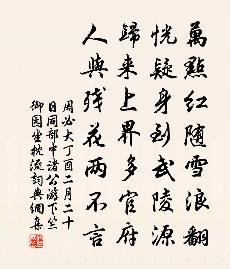 詩詞名句歷史字典書法欣賞書法字典國語詞典說文解字康熙字典古漢語字典標 題 作 者 詩 句 丁酉二月二十日同部中諸公游下竺御園坐枕流作者:周必大 朝代:宋代原文萬點紅隨雪浪翻,恍疑身到武陵源。歸來上界多官府,人與殘花兩不言。詩詞問答問:《丁酉二月二十日同部中諸公游下竺御園坐枕流》的作者是誰?答:周必大問:該詩寫於哪個朝代?答:宋代書法欣賞丁酉二月二十日同部中諸公游下竺御園坐枕流書法作品詩文賞析【原題】:丁酉二月二十日同部中諸公游下竺御園坐枕流亭觀放閘桃花數萬點隨流而下繼至集芳亦禁峑也海棠滿山郁李繞檻殆不類人間世明日入部而桃花數枝伶俜窗外未時內直則海棠郁李各一株方開遂賦二絕句詩詞推薦書意陸游〔宋代〕一鳴輒斥不鳴烹,禍福元知未易評。湖海淒涼身跌宕,杯觴豪舉筆縱橫。敢希二頃成高臥,但願諸公致太平。波暖相和歌辭。婕妤怨翁綬〔唐代〕讒謗潛來起百憂,朝承恩寵暮仇讎。火燒白玉非因玷,霜翦紅蘭不待秋。花落昭陽誰共輦,月明長信獨登樓。繁華夜宿解田偶成釋曇華〔宋代〕夜宿西山居士家,圍爐相對話生涯。從來無一絲頭許,自是勞生眼裹花。和程德裕頌五首黃庭堅〔宋代〕貧子還家作富兒,糞箕苕帚未曾遺。人人慾問草書意,懷素從來自不知。玉女詞張安石〔唐代〕綺薦銀屏空積塵,柳眉桃臉暗銷春。不須更學陽台女,為雨為雲趁惱人。乾寒拾贊釋心月〔宋代〕對面撫掌,兩鏡相照。雙磵與五峰,冷地齊失笑。喚作普賢還料掉。皇太子生辰二首張鎡〔宋代〕無射吹銅恰四萱,紫微深處粲前星。木行襲慶聯三合,火德漢光共一丁。玩鶴怡神資葆毓,聞雞為善想儀刑。豐年天華寺亭二首馮時行〔宋代〕一亭開浩蕩,千載納幽閒。日色射丹巘,秋姿凝翠鬟。人家屏上見,鷺點鏡中還。冷宦驚人眼,無妨飽看山。又次韻樓鑰〔宋代〕投老歸稱前進士,時與田夫相汝爾。淵明賦歸何敢望,曼容自免差可擬。門前爵羅真可設,老圃灌畦聊自比。恕齋鵲橋仙(以酒果為黃子默壽)張孝祥〔宋代〕南州名酒,北園珍果,都與黃香為壽。風流文物是家傳,睨血指、旁觀袖手。東風訊息,西山爽氣,總聚君家戶牖送惠縣丞之官袁說友〔宋代〕立之何事屈藍田,隱忍功名古已然。預信鵷鴻只他日,莫嫌鳧鶩尚頻年。征帆夜濕三更雨,去路人欣八月天。話別奉和武功學士舍人紀贈文懿大師淨公徐鉉〔唐代〕霜髯病叟掩閒扃,禪客相尋有故情。每憶江南初識面,至今猶得愛才名。寒食日送李公佐歸漢東宋祁〔宋代〕有客改南轅,春郊駐祖筵。罇寒禁火國,風暖浴沂天。茂草平無際,殘花慘更妍。鹿鳴偕計近,簪盍約初年。句黃景說〔宋代〕儂是水仙鴻雁行。七夕舒岳祥〔宋代〕河似琉璃底,水行空影中。槎浮應恍惚,星會恐朦朧。七月初七夜,一年須一逢。經躔那有此,吾欲問天公。被酒劉克莊〔宋代〕酒戶當年頗著聲,可堪病起困飛觥。醉呼褚令為傖父,狂喚桓公作老兵。舊有崢嶸皆鏟去,新無壘塊可澆平。投床和李上舍冬日書事韓駒〔宋代〕北風吹日晝多陰,日暮擁階黃葉深。倦鵲繞枝翻凍影,飛鴻摩月墮孤音。推愁不去如相覓,與老無期稍見侵。顧藉和周記室從駕曉發合璧宮李嶠〔唐代〕濯龍春苑曙,翠鳳曉旗舒。野色開煙後,山光澹月餘。風長笳煙咽,川迥騎行疏。珠履陪仙駕,金聲振屬車。追和隱淵明詠貧士趙處澹〔宋代〕嗟予薄羅衲,孑孑將疇依。晨炊井已凍,夜鑿鄰無輝。蒼苔鳥跡絕,臥看孤雲飛。老力出市米,溪寒莫忘歸。纖纖冬日野外宋祁〔宋代〕朔吹低凝野,層陰迥匝天。葉飄霜外柳,煙山燒餘田。晼晚流芳後,崢嶸急景前。平生魚鳥志,寧免為留連。名句推薦去年射虎南山秋,夜歸急雪滿貂裘。陸游《三月十七日夜醉中作》 眼覷著災傷教我沒是處,只落得雪滿頭顱。張養浩《一枝花·詠喜雨》 恨無千日酒,空斷九迴腸。劉彤《臨江仙·千里長安名利客》 重幃深下莫愁堂,臥後清宵細細長。李商隱《無題·重幃深下莫愁堂》 遙知湖上一樽酒,能憶天涯萬里人。歐陽修《春日西湖寄謝法曹歌》 楊柳乍如絲,故園春盡時。納蘭性德《菩薩蠻·問君何事輕離別》 盡人事以聽天命。李汝珍《鏡花緣·第六回》 問姓驚初見,稱名憶舊容。李益《喜見外弟又言別》 一別都門三改火,天涯踏盡紅塵。蘇軾《臨江仙·送錢穆父》 萋萋芳草憶王孫。柳外樓高空斷魂。李重元《憶王孫·春詞》
