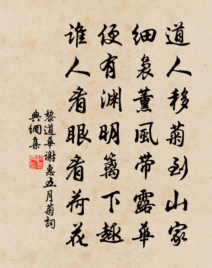 詩詞名句歷史字典書法欣賞書法字典國語詞典說文解字康熙字典古漢語字典標 題 作 者 詩 句 謝惠五月菊作者:黎道華 朝代:宋代謝惠五月菊原文道人移菊到山家,細裊薰風帶露華。便有淵明籬下趣,誰人看眼看荷花。詩詞問答問:謝惠五月菊的作者是誰?答:黎道華問:謝惠五月菊寫於哪個朝代?答:宋代黎道華謝惠五月菊書法欣賞謝惠五月菊書法作品詩詞推薦贈嵩山焦鍊師李白〔唐代〕二室凌青天,三花含紫煙。中有蓬海客,宛疑 * 仙。道在喧莫染,跡高想已綿。時餐金鵝蕊,屢讀青苔篇。八極麗人行楊維楨〔元代〕楊白花飛愁 * ,美人如華不勝春。錦韉馱起雙鳳縷,黃門挾飛五花雲。白日雷霆夾城道,樂遊園里春正好。就中夜飲以白糖嚼梅花楊萬里〔宋代〕剪雪作梅只堪嗅,點蜜如霜新可口。一花自可咽一杯,嚼盡寒花幾杯酒。先生清貧似飢蚊,饞涎流到瘦脛根。贛江覽古四十二首 其十二楊維楨〔元代〕漢廷古遺直,免官歸田園。已聞御史奏,嚴李有飛言。矯制獨無罪,加冠禮終存。誰謂淮陽召,淮陽為寡恩。都大華文監丞權府事之明年天子詔將直禁近邦吳泳〔宋代〕短短菰蒲洲,陰陰葭菼陂。有斐嘉芙蓉,雙蒂媚漣漪。如龍舒兩娥,如沅湘二妃。豈伊玉池種,而乃生污泥。斑然興慶池禊冥董士廉〔宋代〕歲和事簡正韶春,興慶池邊樂眾賓。尋勝此時追曲水,賞芳良會屬平津。映花語笑鞦韆女,隔岸絲簧祓禊人。深愧有感陸游〔宋代〕雲崦重重不易尋,庖廚性命走山林。但令有月同幽夢,更用何人識苦心。流輩漸稀知死近,鬢毛無色覺愁侵。平生讀後漢書陸游〔宋代〕季英行年九十八,猶灌園蔬授六經。我欲圖之置齋壁,世無顧陸善丹青。梁國惠康公主輓歌詞二首(駙馬即司空於公之子)羊士諤〔唐代〕湯沐成陳跡,山林遂寂寥。鵲飛應織素,鳳起獨 * 。玉殿中參罷,雲輧上漢遙。皇情非不極,空輟未央朝。授冊頌古三十一首釋如本〔宋代〕草戶柴門謝子來,躬身下拜笑眉開。深深密密親分付,莫道寶山空手回。憂旱李呂〔宋代〕田圃如燔木葉黃,火輪從早出扶桑。佇觀罪已侔湯德,更願求言舉漢章。冤死豈能無孝婦,當烹應復有弘羊。可憐偈三十五首釋祖珍〔宋代〕向上一路,千聖不傳。恁麽明得,十萬八千。桃紅李白薔薇紫,問著春風總不知。春雨陸游〔宋代〕疏點空階雨,長明古殿燈。廬山岑寂夜,我是定中僧。送韓梓秀才十八韻陸游〔宋代〕束髮走場屋,始得從君游。燈火都城夜,風雨湖上秋,追隨不隔日,岩窮探搜,摩挲石屋背,搖兀闇門舟。酒酣耳酬和知制誥孫舍人見寄魏野〔宋代〕也知皇宋足名人,至論誰堪繼後塵。已見世傳元相制,將聞詔寫白公真。紫微星宿雖潛望,紅藥階除豈易親。野客和晏相公泛南湖韋家園過西溪至許家園韓維〔宋代〕湖心點點生圓荷,黃花白花滿晴皮,環堤客樹垂婆娑。魚沉鷺矯各自得,人生不樂其謂何。南塘過盡西溪綠,上下山居李新〔宋代〕綠樹初浮光,嘉禽自行樂。廚煙續雲根,澗水斷冰腳。徜徉一樽酒,坐看山花落。日暮歸去來,嫣香裛羅幕。逍遙詠宋太宗〔宋代〕逍遙通大道,物象古從今。一氣無窮極,三才妙更深。愚迷皆自縛,聖境可周尋。訊息存亡理,先憂力不任。七哀詩楊維楨〔元代〕貧者欲無壽,富嬰願期頤。慘慘里門道,哭聲一何悲。白頭灑慈淚,紅顏服嫠衰。借問送車人,共惜紈絝兒。問齒白鶴寺作戴栩〔宋代〕子晉昔游處,平台片石成。寺名猶記鶴,松響卻疑笙。岩壁飛雙瀑,金沙照一泓。野人豈仙伴,隨鹿過溪行。名句推薦東風漸綠西湖柳,雁已還、人未南歸。周密《高陽台·送陳君衡被召》 春風十里揚州路,卷上珠簾總不如。杜牧《贈別》 細看茱萸一笑,詩翁健似常年。張可久《風入松·九日》 十五彩衣年,承歡慈母前。孟浩然《送張參明經舉兼向涇州覲省》 多謝月相憐,今宵不忍圓。朱淑真《菩薩蠻·山亭水榭秋方半》 流水便隨春遠,行雲終與誰同。晏幾道《臨江仙·鬥草階前初見》 絮影苹香,春在無人處周晉《點絳唇·訪牟存叟南漪釣隱》 形影忽不見,翩翩傷我心。曹植《雜詩六首·其一》 江南江北愁思,分付酒螺紅方岳《水調歌頭·平山堂用東坡韻》 一月不讀書,耳目失精爽。蕭掄謂《讀書有所見作》