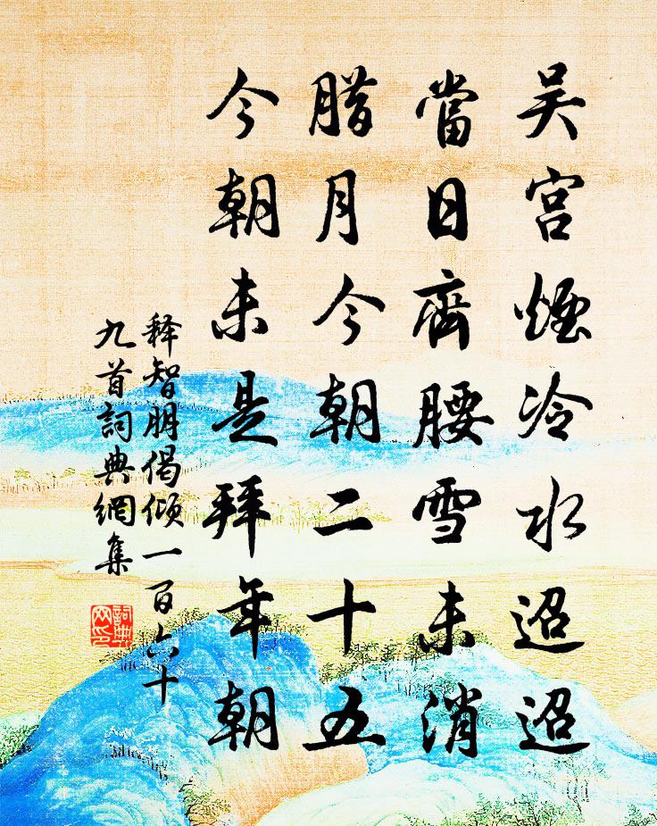 詩詞名句歷史字典書法欣賞書法字典國語詞典說文解字康熙字典古漢語字典標 題 作 者 詩 句 偈傾一百六十九首作者:釋智朋 朝代:宋代偈傾一百六十九首原文吳宮煙冷水迢迢,當日齊腰雪未消。臘月今朝二十五,今朝未是拜年朝。詩詞問答問:偈傾一百六十九首的作者是誰?答:釋智朋問:偈傾一百六十九首寫於哪個朝代?答:宋代釋智朋偈傾一百六十九首書法欣賞偈傾一百六十九首書法作品詩詞推薦和王定國寄劉貢父蘇轍〔宋代〕度嶺當年惜遠行,過淮今日似前生。留連秋思江侵海,搖盪春心花滿城。欲寄尺書慵把筆,偶聞佳句獨含情。何時刈茆釋紹曇〔宋代〕百草頭邊活路通,險崖機透幾千重。長長短短刪除了,收放全歸掌握中。謝梵才惠茶石待舉〔宋代〕郡園名荈制猶新,分惠眠雲跂石人。色斗瓊瑤因地勝,香殊蘭茝得天真。開時好對稜稜月,碾處應飛瑟瑟塵。寄語端午貼子詞皇帝閣六首真德秀〔宋代〕心日日望豐年,清曉爐熏徹九天。二麥登場蠶著繭,平疇新綠又連阡。金剛隨機無盡頌嘆仰流通釋印肅〔宋代〕綠綺霜前奏,妙音無不透。凡夫入耳通,禪家為有漏。次韻黃大臨秀才見寄蘇轍〔宋代〕故人聚散霜前葉,往事眇茫風際煙。遊宦一生非有已,隱居萬事不由天。崎嶇檻阱方謀食,嘯傲山林肯計年。賴已南風行十八日早作趙蕃〔宋代〕吾聞黃帝張樂洞庭野,始意莊生言故假。又聞湘靈鼓瑟進玄螭,亦意屈子夸厥辭。屬行洞庭四月半,南風三日吹不夜泊義興戲呈邑宰羅隱〔唐代〕溪畔維舟問戴星,此中三害有圖經。長橋可避南山遠,卻恐難防是最靈。便殿候對吳融〔唐代〕宣呼晝入蕊珠宮,玉女窗扉薄霧籠。待得華胥春夢覺,半竿斜日下廂風。二蟲吟鞏豐〔宋代〕鯤鵬至大兮,形載於莊周逍遙之篇,蟋蟀至小兮,名托於周公七月之雅。一則變化徙天池,一則悲鳴入床下。周公寧宗朝享三十五首真宗〔宋代〕於皇我宋,世有哲明。元祐用人,遹駿有聲。紹述先志,思監於成。受天之祜,王配於涼。再過溧陽縣見李侍御二首項安世〔宋代〕憶昔兒子時,仁公兩朱轓。吟篇與醉墨,零落遍湘沅。少長聽鳴騶,清霜粲華軒。風流故多奇,欲說非一言。但聞客感和林石田汪元量〔宋代〕細柳和煙無溼雲,落花隨水送歸春。門東□□□應噪,江上白鷗誰肯馴。朱子不仁唐逆賊,□□□□誑漢忠。離亭酬發運馬子山少卿惠與詩張先〔宋代〕貢餘應惜點為山,絕唱兼遺致政官。嵰地雪甜多不識,吳人未食齒先寒。書幸陸游〔宋代〕謀身從昔本迂疏,豈料餘年卻晏如。盤箸無時闕鮭菜,道途隨事有舟車。故衣已敝月三浣,短髮雖殘日一梳。里巷鷓鴣天晏幾道〔宋代〕清潁尊前酒滿衣。十年風月舊相知。憑誰細話當時事,腸斷山長水遠詩。金鳳闕,玉龍墀。看君來換錦袍時。姮娥送胡彥龍過金陵高彥竹〔宋代〕金陵往事已成虛,江水清清只見魚。遺廟空存元帝像,故家多有二王書。秋風出塞調生馬,夜月吟淮跨蹇驢。借問夏夜對月陸游〔宋代〕薄雲歸欲盡,殘雨久猶滴。月入疏林間,庭戶粲珠璧。梅天苦蒸郁,爽氣始此夕。豈無一舴艋,放浪江天碧。散發西山韓太師墳黃庚〔宋代〕古墓年深草樹荒,石人石馬臥斜陽。爭如湖上逋仙冢,詩骨埋雲萬古香。中秋月蝕邦人鳴鉦救月不約而齊中原舊俗猶有家鉉翁〔宋代〕風掃沈陰萬象開,斷雲扶月出陽台。萬人拭目看天眼,蟇蝕何曾蝕得來。名句推薦溪雲初起日沉閣,山雨欲來風滿樓。許渾《鹹陽城東樓 / 鹹陽城西樓晚眺 / 西門》 書當快意讀易盡,客有可人期不來。陳師道《絕句·書當快意讀易盡》 滿衣血淚與塵埃,亂後還鄉亦可哀。高啟《送陳秀才還沙上省墓》 登山則情滿于山,觀海則意溢於海劉勰《文心雕龍·神思》 誰憐散髻吹笙,天涯芳草關情。納蘭性德《清平樂·孤花片葉》 記少年、駿馬走韓盧,掀東郭。辛棄疾《滿江紅·和范先之雪》 愁中看、好天良夜,知道盡成悲咽。納蘭性德《琵琶仙·中秋》 金鞍玉勒尋芳客,未信我廬別有春。于謙《觀書》 唯君子為能通天下之志。佚名《易傳·彖傳上·同人》 憐夜冷孀娥,相伴孤照。吳文英《花犯·謝黃復庵除夜寄古梅枝》