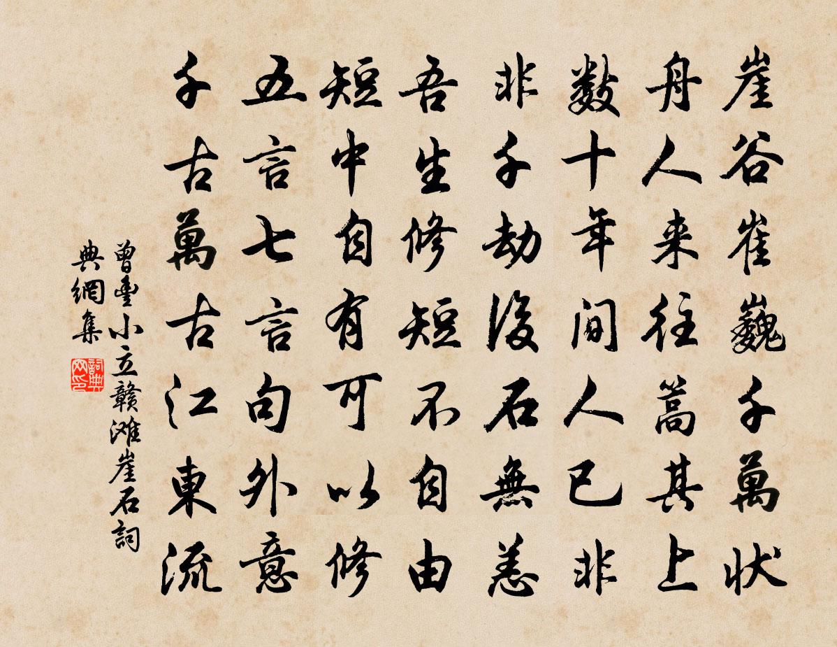 詩詞名句歷史字典書法欣賞書法字典國語詞典說文解字康熙字典古漢語字典標 題 作 者 詩 句 小立贛灘崖石作者:曾豐 朝代:宋代小立贛灘崖石原文崖谷崔巍千萬狀,舟人來往篙其上。數十年間人已非,非千劫後石無恙。吾生修短不自由,短中自有可以修。五言七言句外意,千古萬古江東流。詩詞問答問:小立贛灘崖石的作者是誰?答:曾豐問:小立贛灘崖石寫於哪個朝代?答:宋代曾豐小立贛灘崖石書法欣賞小立贛灘崖石書法作品詩詞推薦嘆流水二首羅鄴〔唐代〕人間莫謾惜花落,花落明年依舊開。卻最堪悲是流水,便同人事去無回。龍躍虬蟠旋作潭,繞紅濺綠下東南。春風失調名佚名〔宋代〕醉鄉天廣大。挽韓漕直閣趙善括〔宋代〕忠憲勛名冠本朝,傳芳五葉盡金貂。芝蘭生子競秀髮,松柏如公合後凋。淮縣劇繁迎刃解,蜀邊奸慝望風銷。才高和別駕喜雨四絕魏了翁〔宋代〕四山鎔日瀉黃金,誰載亭皋一尺霖。息處生機無間斷,劃然有頃驗天心。秦夢詩三首。挽公主沈亞之〔唐代〕泣葬一枝紅,生同死不同。金鈿墜芳草,香繡滿春風。舊日聞簫處,高樓當月中。梨花寒食夜,深閉翠微宮。題章伯深臞怪圖仲並〔宋代〕杖策山隈亦水濱,閒中未害飽經綸。何曾寂寞嵌岩裹,慣著風流廓廟人。送范之侄謁留守別先生陶夢桂〔宋代〕不待吹噓送上在,凌雲意氣自飄然。長江秋色將征旆,半夜霜威襲客氈。淝水功名須爾力,斜川風月了吾年。師門省中新柳楊萬里〔宋代〕元日新春已早歸,卻緣春雪勒春遲。一年柳色今何似,政是猶黃未綠時。懷新亭四首張嵲〔宋代〕晚秧紛已及,中田日往還。適與好風會,植杖觀前山。臥治齋盆池楊萬里〔宋代〕舊來菰葉已全衰,旋買新荷帶藕栽。看得荷花作蓮子,可憐時節被花催。次韻劉景文登鄭王台見思五首黃庭堅〔宋代〕舊時劉子政,憔悴鄴王城。把筆已頭白,見書猶眼明。平原秋樹色,沙麓暮鐘聲。歸雁南飛盡,無因寄此情。慶江檢詳太夫人潛放〔宋代〕見說團欒醉壽觥,椒盤長近歲崢嶸。今年臘里欣逢閏,直待春回卻舉行。送臨江軍監軍李太博梅堯臣〔宋代〕三江卑濕地,北客宦遊稀。霧氣多成雨,雲蒸易損衣。白醪燒瓮美,黃雀下田肥。未辨殊方語,山歌半是非。鸚鵡曲 市朝歸興馮子振〔元代〕山林朝市都曾住。忠孝兩字報君父。利名場反覆如雲,又要商量陰雨。便天公有眼難開,袖手不如家去。更蛾眉強江梅鄭獬〔宋代〕杭州別乘有餘才,戲作佳篇寄我來。已教吳娘學新曲,鳳山亭下賞江梅。菩薩蠻(游水月寺)湯思退〔宋代〕畫船橫絕湖波練。更上雕鞍窮翠巘。霜橘半垂黃。征衣盡日香。鐘聲雲外聽。金界青松映。何處是華山。峰巒杳靄朱文公離騷經贊岳珂〔宋代〕偉茲帖上奇瑰兮,羌筆力之有神。走緘{騰去馬加糸}之來詔兮,並垂棗而足珍。從鯉庭而載求兮,得陳亢之異聞感懷舒岳祥〔宋代〕時事傳來日日新,信疑相半向誰詢。一寒一暑成吾老,多雨多愁過卻春。酒畔暫休無限事,花前難買自由身。百年過明田寺會楊李二生於碧玉三首胡寅〔宋代〕已宅連延紫蓋椒,尋山依舊不辭遙。借床未暇桑三宿,解飯還須水一瓢。風外野雲俱淡盪,雨余秋氣亦蕭條。故人朱雲傳宋祁〔宋代〕朱游英氣凜生風,瀕死危言悟帝聰。殿檻不修旌直諫,安昌依舊漢三公。名句推薦落日暴風雨,歸路繞汀灣蘇舜欽《水調歌頭·滄浪亭》 馬驕泥軟錦連乾,香袖半籠鞭。薛昭蘊《喜遷鶯·清明節》 前村深雪裡,昨夜一枝開。齊己《早梅》 度德而處之,量力而行之左丘明《左傳·隱公·隱公十一年》 聖人之為國也,觀俗立法則治,察國事本則宜。商鞅《商君書·算地》 不似秋光,只與離人照斷腸。蘇軾《減字木蘭花·春月》 有大略者,不可責以捷巧;有小智者,不可任以大功。劉安及其門客《淮南子·主術訓》 驪山語罷清宵半,淚雨霖鈴終不怨。納蘭性德《木蘭詞·擬古決絕詞柬友》 時靸雙鴛響,廊葉秋聲。吳文英《八聲甘州·靈岩陪庾幕諸公游》 誠者,天之道也;思誠者,人之道也。孟子《孟子·離婁章句上·第十二節》