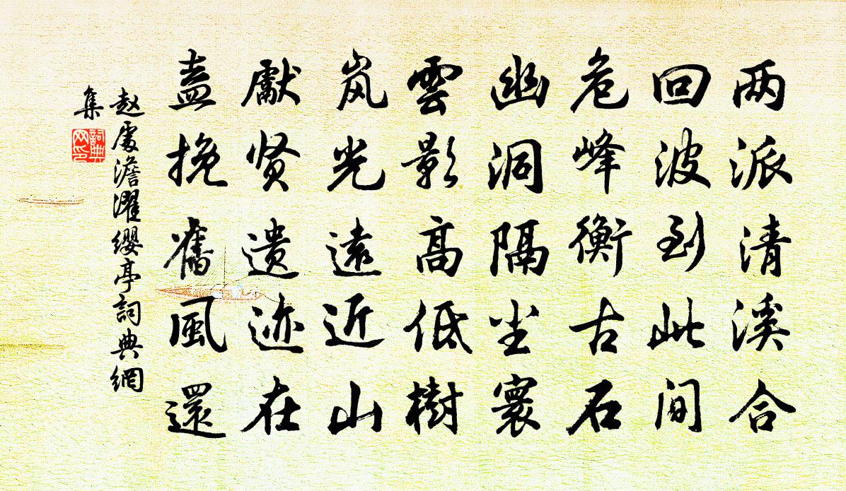 詩詞名句歷史字典書法欣賞書法字典國語詞典說文解字康熙字典古漢語字典標 題 作 者 詩 句 濯纓亭作者:趙處澹 朝代:宋代濯纓亭原文兩派清溪合,回波到此間。危峰衡古石,幽洞隔塵寰。雲影高低樹,嵐光遠近山。先賢遺蹟在,盍挽舊風還。詩詞問答問:濯纓亭的作者是誰?答:趙處澹問:濯纓亭寫於哪個朝代?答:宋代趙處澹濯纓亭書法欣賞濯纓亭書法作品詩詞推薦丘虛席上得趙養民運使寄詩,約今晚可歸,次范成大〔宋代〕偶攜尊酒上孱顏,忽憶行人瘴霧間。便好來分蒼石坐,已教不鎖翠雲關。定風波佚名〔宋代〕古鼎龍涎香猶噴。和劉正夫見寄吳芾〔宋代〕已是龍鍾七十人,故應告老上章頻。九重垂念如慈父,一旦容歸作幸民。今我可憐非故我,此身才喜是吾身。花前智門寺後梅開叢竹間斯遠舉坡公春來幽谷之句趙蕃〔宋代〕花開的皪固難知,舊識黃州副使詩。政使盡開能爾盛,孰知將吐乃為奇。和人見寄曹勛〔宋代〕客里相逢樂可涯,坐來三見換年華。喜君舞彩庭趨鯉,愧我驚鴻跡在沙。白眼故慶聊溷俗,青氈當亦謹傳家。他時塞上曲陸游〔宋代〕秋風獵獵漢旗黃,曉陌霜清見太行。車載氈廬駝載酒,漁陽城裡作重陽。己未十月十五日獄中恭聞太皇太后不豫有赦作蘇軾〔宋代〕庭柏陰陰晝掩門,烏知有赦鬧黃昏。漢宮自種三生福,楚客還招九死魂。縱有鋤犁及田畝,已無面目見丘園。只應狄詠石屏蘇軾〔宋代〕霏霏點輕素,渺渺開重陰。風花亂紫翠,雪外有煙林。雪近勢方壯,林遠意殊深。會有無事人,支頤識此心。蜀中將歸留辭韓相公貫之歐陽詹〔唐代〕寧體即雲構,方前恆玉食。貧居豈及此,要自懷歸憶。在夢關山遠,如流歲華逼。明晨首鄉路,迢遞孤飛翼。皇后閣端午貼子詞五首真德秀〔宋代〕盆繭已繰冰絲縷,五色絲新織海鮫。不但彩繒華節物,要成龍袞待親郊。【越調】小桃紅楊果〔元代〕碧湖湖上采芙蓉,人影隨波動。涼露沾衣翠綃重,月明中,畫船不載凌波夢。都來一段,紅幢翠蓋,香盡滿城風。八月七日被命上會稽沿途所歷拙於省記為韻語魏了翁〔宋代〕周官雖有墓為屍,細考元非墓祭儀。九十年閒讎未復,陵{左歹右替去日加貝}雜用最堪悲。題謝昌國金牛煙雨圖楊萬里〔宋代〕金牛煙雨最相關,老子方將老是間。不分良齊來貌取,更於句里占江山。瑞鷓鴣譚處端〔元代〕人人學道慕腥膻。嗜酒迷花罪孽纏。心慕腥膻傷物命,意生貪愛損根源。唯論藥術矜能解,豈信金科秘妙玄。如悟築台詞(漢武築通天台,役者苦之)劉駕〔唐代〕前杵與後杵,築城聲不住。我願築更高,得見秦皇墓。送姚評事李頻〔唐代〕儒服從戎去,須知勝事全。使君開幕日,天子偃戈年。風雨依嵩嶺,桑麻接楚田。新詩隨過客,旋滿洛陽傳。滿江紅汪莘〔宋代〕意賦之可也唐宋諸公,誰道得、梅花親切。到和靖、先生詩出,古人俱拙。寫照乍分清淺水,傳神初付黃昏月。盡聽宮入琴胡仲弓〔宋代〕群哇方雜奏,忽聽數聲琴。天地有清氣,君王知正音。悲風生指玉,明月照徽金。曾撫昭君怨,宮人淚滿襟。淨居主人索詩急筆賦陳造〔宋代〕淨居棟宇犀辟塵,山居不乏塵外人。我來肯作厭客想,老語一一刊翠珉。頻年愧煩香積供,醉後狂言亦安用。詩成送孫太沖守懷安勾龍如淵〔宋代〕金沙春三月,桃李照城郭。石峽赬鯉魚,時時醉賓幕。名句推薦童子柳陰眠正著,一牛吃過柳陰西。楊萬里《桑茶坑道中》 國必有誹譽,忠臣令誹在己,譽在上。劉向《戰國策·東周·周文君免士工師藉》 口而誦,心而惟。朝於斯,夕於斯。王應麟《三字經·全文》 荒城臨古渡,落日滿秋山。王維《歸嵩山作》 城小賊不屠,人貧傷可憐元結《賊退示官吏》 山無陵,江水為竭。佚名《上邪》 憑高眺遠,見長空萬里,雲無留跡。蘇軾《念奴嬌·中秋》 雨過橫塘水滿堤,亂山高下路東西。曾鞏《城南·雨過橫塘水滿堤》 以德就列,以官服事,以勞殿賞,量功而分祿。墨子《墨子·08章 尚賢(上)》 誠既勇兮又以武,終剛強兮不可凌。屈原《國殤》