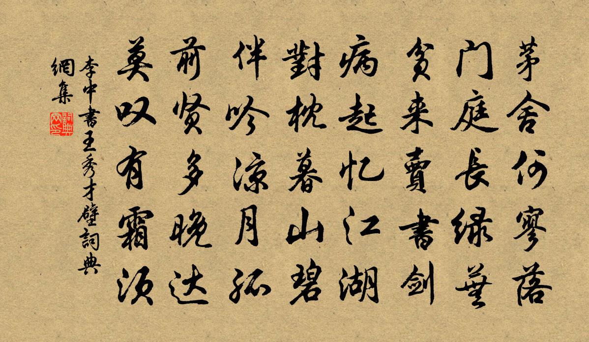 詩詞名句歷史字典書法欣賞書法字典國語詞典說文解字康熙字典古漢語字典標 題 作 者 詩 句 書王秀才壁作者:李中 朝代:唐代書王秀才壁原文茅舍何寥落,門庭長綠蕪。貧來賣書劍,病起憶江湖。對枕暮山碧,伴吟涼月孤。前賢多晚達,莫嘆有霜須。詩詞問答問:書王秀才壁的作者是誰?答:李中問:書王秀才壁寫於哪個朝代?答:唐代問:書王秀才壁是什麼體裁?答:五律李中書王秀才壁書法欣賞書王秀才壁書法作品注釋全唐詩:卷747-23詩詞推薦天河閣到啼猿閣即事顧非熊〔唐代〕萬壑褒中路,何層不架虛。濕雲和棧起,燋枿帶畲余。岩狖牽垂果,湍禽接迸魚。每逢維艇處,塢里有人居。幽成四景蛩音張玉孃〔宋代〕落木舊山寺,霜清葉掃風。已無雞犬聲,虛殿鳴秋蛩。經旬不作詩今日霜晴可喜問梅沈園得兩絕句此趙蕃〔宋代〕自從籬菊報香衰,便說南枝與北枝。底事頻來問訊息,山翁近日絕無詩。再和靜樂鄭清之〔宋代〕夫君論事回天力,期文如貢厥篚織。天葩瑞時來帝傍。天香染衣未渠息。因攜天上白琅玕,散作天花天女識。冰清春初驟暄一夕梅盡開明日大風花落成積戲作陸游〔宋代〕年年爛醉萬梅中,吸酒如鯨到手空。花欲過時常惜別,今年此別更匆匆。題顏慶遠三友亭曾豐〔宋代〕天一生水清之精,天三生木清之英。他清可備吾題名,不得精英未為清。顏子園中亭突兀,遠橫一水近三木。取其投宿廣平道上逢梅懷斯遠趙蕃〔宋代〕驅羸度斜影,恨不與子俱。梅花忽照眼,炯若冰玉臞。暝投佛寺宿,憶子曾寄躅。摩挲壁間詩,雖昏尚能讀。為運使蔡國博壽二首衛涇〔宋代〕橘顆圍仙飽紫芝,菊潭釀酒拍金卮。九秋沆碭成功日,六轡光華初度時。試問江湖勞漕輓,何如朝夕密論思。預知偈頌一百四十一首釋師範〔宋代〕上下三指,彼此七馬。似有心無,半真半假。乳峰被人問著,五年分疏不下。阿呵呵,笑倒東村王大姊。題袁右丞滋像汪大猷〔宋代〕金玉相輝滿畫扉,高風未許一行題。五朝冠蓋聯朱紫,八代文章煥壁奎。四老德推商皓並,群英名許魯賢齊。憑將碧溪草堂六言二首劉克莊〔宋代〕雖無百官宗廟,薄有先人田廬。子云飯疏飲水,通也彈琴著書。觀物吟邵雍〔宋代〕物不兩盛,事難獨行。榮瘁迭起,賢愚並行。論語絕句一百首張九成〔宋代〕大都禮義本人情,若論人情莫若親。苟使於親無曲折,不知人視作何人。句清江〔唐代〕萬木無一葉,客心悲此時。壽朱文公辛棄疾〔宋代〕玉漏聲沉曉色回,五雲絢彩映庭槐。持巾珠履攙稱賀,飛鞚貂璫押賜來。 * 尚遲三日約,碧桃已作十分開。洞天上巳酒邊即事示女沖二首陳著〔宋代〕年華浮動酒中心,笑向吾前滿滿斟。猶喜家貧詩禮在,一杯真率勝山陰。樵趙友直〔宋代〕踏破芒鞋力已疲,朝還礪斧採薪兒。雲深迷卻山頭路,戴笠回來雨濕衣。賦介軒半村新居周耕雲〔宋代〕近謀吟屋傍潯溪,雁盪山深雲未歸。怕惱春光花種少,愛延月色竹栽稀。寶藏書冊教兒讀,土視功名與世違。不是和韻胡希聖湖上仇遠〔宋代〕連作湖山五日游,沙鷗慣識木蘭舟。清風寒日荒城晚,燕子梨花細雨愁。賜火恩榮皆舊夢,禁菸風景似初秋。風絲忠孝亭周洎〔宋代〕晉鼎臲卼奸人窺,孰謀國者如兒嬉。陷穽弗設延虎貔,虓闞搏噬嬰者摧。群公奔潞峭敢誰,卞公力疾起督師。謂事名句推薦我住長江頭,君住長江尾。李之儀《卜運算元·我住長江頭》 行舟逗遠樹,度鳥息危檣。陰鏗《渡青草湖》 一粥一飯,當思來處不易;半絲半縷,恆念物力維艱。朱柏廬《朱子家訓·全文》 若要俏,添重孝。馮夢龍《警世通言·卷三十五》 十年種木,一年種穀,都付兒童。元好問《人月圓·重岡已隔紅塵斷》 夫有尤物,足以移人左丘明《左傳·昭公·昭公二十八年》 雪似梅花,梅花似雪。呂本中《踏莎行·雪似梅花》 酒未開樽句未裁,尋春問臘到蓬萊。曹雪芹《訪妙玉乞紅梅》 才道莫傷神,青衫濕一痕。納蘭性德《菩薩蠻·新寒中酒敲窗雨》 酒不醉人人自醉,色不迷人人自迷。馮夢龍《警世通言·卷二十四》