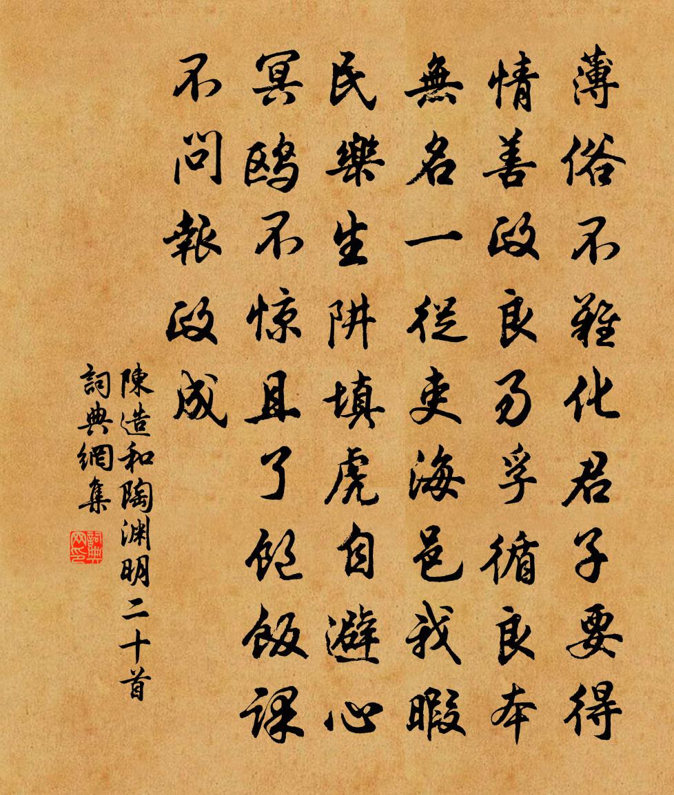 詩詞名句歷史字典書法欣賞書法字典國語詞典說文解字康熙字典古漢語字典標 題 作 者 詩 句 和陶淵明二十首作者:陳造 朝代:宋代和陶淵明二十首原文薄俗不難化,君子要得情。善政良易孚,循良本無名。一從吏海邑,我暇民樂生。阱填虎自避,心冥鷗不驚。且了飽飯課,不問報政成。詩詞問答問:和陶淵明二十首的作者是誰?答:陳造問:和陶淵明二十首寫於哪個朝代?答:宋代陳造和陶淵明二十首書法欣賞和陶淵明二十首書法作品詩詞推薦頌證道歌證道歌釋印肅〔宋代〕不可毀,不可贊。邇古迄今光燦爛。鎮州蘿蔔大三斤,桶裹水兮缽裹飯。榆溪道上歐陽玭〔唐代〕初日在斜溪,山雲片片低。鄉愁夢裡失,馬色望中迷。澗底淒泉氣,岩前遍綠荑。非關秦塞去,無事候晨雞。司空平章軍國事贈太師開國正獻呂公輓辭五首蘇頌〔宋代〕二聖臨熙運,元精降佐臣。人承太岳裔,生在敦牂辰。六紀登遐壽,三期秉大均。還騎箕尾去,仍值在蛇春。薦金蕉仇遠〔宋代〕梅邊當江南信。醉語無恁準。斜陽丹葉一簾秋。燕去鴻來,相憶幾時休。贈別華岳〔宋代〕嬌羞猶記別時言,教我春衣尅可單。說與蒼頭渾忘□,曉來真箇作輕寒。早行王觀〔宋代〕雞唱催人起,又生前去愁。路明殘月在,山露宿雲收。村店煙火動,漁家燈燭幽。趨名與趨利,行役幾時休。道中寄景珍兼簡庚元鎮黃庭堅〔宋代〕傳語濠州賢刺史,隔年詩債幾時還。因循樽俎疏相見,棄擲光陰只等閒。心在青雲故人處,身行紅雨亂花間。遙知答鄭宜中趙汝騰〔宋代〕畏暑門稀問字徒,袖中妙語契周圖。知君十倍侯芭學,老我非雄尚索塗。冬日病中即事呂溫〔唐代〕牆下長安道,囂塵咫尺間。久牽身外役,暫得病中閒。背喜朝陽滿,心憐暮鳥還。吾廬在何處,南有白雲山。王君瑞秘丞同理青社宋祁〔宋代〕詔押平明出未央,便隨公府汎牙檣。即時趨坐多留幘,幾夕登樓共踞床。勝國遺官沉雪霧,從軍舊沼認蓮房。翹材春日上方即事王維〔唐代〕好讀高僧傳,時看辟穀方。鳩形將刻仗,龜殼用支床。柳色青山映,梨花夕鳥藏。北窗桃李下,閒坐但焚香。少林元好問〔金代〕雲林入清深,禪房坐蕭爽。澄泉潔余習,高鳥喚長往。我無元豹姿,漫有紫霞想。回首山中雲,靈芝日應長。丙寅舟次宋城作賀鑄〔宋代〕水館四邊村,登臨奈斷魂。黃作開小徑,紅粉哭高原。舟楫逢新火,松楸老故園。斜陽一千里,依約是蘇門。和毛君州宅八詠 山房蘇轍〔宋代〕岸幘攜筇夜夜來, * 紙帳竹香台。直須覓取僧為伴,更為開庵劚草萊。爆竹劉敞〔宋代〕節物隨時俗,端憂見旅情。土風猶記楚,辭賦謾譏倫。烈火琅玕碎,深堂霹靂鳴。但令休鬼瞰,非敢願高明。和顏北城梅花韻丘葵〔宋代〕白髮寒叢裹,疏枝的爍明。風霜半夜後,南北一時晴。冷淡吟邊景,啁嘈夢裹聲。園中幾許樹,獨汝最關情。頌古二十首釋了一〔宋代〕鐘鼓未鳴先托缽,雪峰平地成饒舌。當時一逕入僧堂,且看岩頭有何說。題沈黎城權徹〔唐代〕蘇子臥北海,馬翁渡南洲。跡恨事乃立,功達名遂休。夜聞羽書至,召募此邊州。鐵騎耀楚甲,玉匣橫吳鉤。雪厚郡中迎懷玉山應真請雨得之未沾足曾幾〔宋代〕憫雨連三月,為霖抵萬金。小垂開士手,足慰老農心。果欲千倉積,猶須一尺深。病夫渾不寢,危坐聽佳音。贈鄰家老將楊巨源〔唐代〕白首羽林郎,丁年戍朔方。陰天瞻磧落,秋日渡遼陽。大漠寒山黑,孤城夜月黃。十年依蓐食,萬裡帶金瘡。拂雪名句推薦奢侈之敗家,猶出常情;而慳吝之敗家,必遭奇禍。王永彬《圍爐夜話·第五九則》 誰教歲歲紅蓮夜,兩處沉吟各自知。姜夔《鷓鴣天·元夕有所夢》 秋波落泗水,海色明徂徠。李白《魯郡東石門送杜二甫》 半生已分孤眠過,山枕檀痕涴。納蘭性德《虞美人·曲闌深處重相見》 嘆寄與路遙,夜雪初積。姜夔《暗香疏影》 傷心千里江南,怨曲重招,斷魂在否?吳文英《鶯啼序·春晚感懷》 笑十三楊柳女兒腰,東風舞。岳珂《滿江紅·小院深深》 春秋代序,陰陽慘舒,物色之動,心亦搖焉。劉勰《文心雕龍·物色》 東風有信無人見,露微意、柳際花邊。蘇軾《一叢花·今年春淺侵年》 江南憶,最憶是杭州。白居易《憶江南詞三首》
