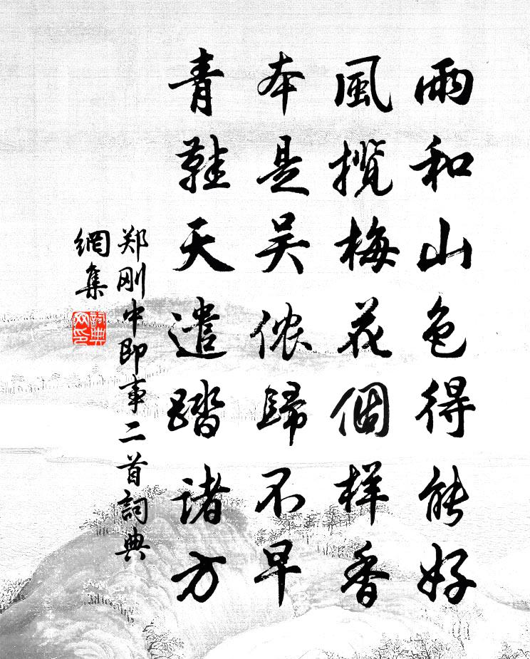 詩詞名句歷史字典書法欣賞書法字典國語詞典說文解字康熙字典古漢語字典標 題 作 者 詩 句 即事二首作者:鄭剛中 朝代:宋代即事二首原文雨和山色得能好,風攬梅花個樣香。本是吳儂歸不早,青鞋天遣踏諸方。詩詞問答問:即事二首的作者是誰?答:鄭剛中問:即事二首寫於哪個朝代?答:宋代鄭剛中即事二首書法欣賞即事二首書法作品詩詞推薦五月初三日雨寒痰嗽方回〔宋代〕門外葵花一丈高,詎期端午更綿袍。佩符豈有玉剛卯,挑藥久無金錯刀。人老形骸宜瘦劣,時危心肺倍焦勞。柴門晚春客次偶吟李中〔唐代〕暫駐征輪野店間,悠悠時節又春殘。落花風急宿酲解,芳草雨昏春夢寒。慚逐利名頭易白,欲眠雲水志猶難。卻憐次韻張伯子餉柑崔敦禮〔宋代〕儒官窗戶寒,恇怯日出光。獨冷不可耐,大杓傾鵝黃。洞庭隔煙波,忽驚風露香。開門問誰與,知君念荒涼。芳包雜曲歌辭苦熱行僧齊己〔唐代〕離宮劃開赤帝怒,喝起六龍奔日馭。下土熬熬若煎煮,蒼生惶惶無處處。火雲崢嶸焚泬寥,東皋老農腸欲焦。何當衡州送李十一兵曹赴浙東呂溫〔唐代〕慷慨視別劍,淒清泛離琴。前程楚塞斷,此恨洞庭深。文字已久廢,循良非所任。期君碧雲上,千里一揚音。半月軒樓鑰〔宋代〕莫要作圓月,才圓卻又虧。不如作一半,猶有向圓時。贈目眇者陸游〔宋代〕達人所遇有生涯,高臥窮閻自一家。閱世正嫌岩下電,開樽且看霧中花。落第書懷寄友人羅鄴〔唐代〕清世誰能便陸沈,相逢休作憶山吟。若教仙桂在平地,更有何人肯苦心。去國漢妃還似玉,亡家石氏豈無金。且安丙午初冬得心腹痛疾大下而愈羸耗不支方在告陸游〔宋代〕愔愔四壁空,宛宛一室奧;雨聲靜更聞,雨氣深不到。下簾設紙屏,篝火支藥灶。勿言此幽陋,足以養衰眊。頗聞醉落魄(東叔兄生日)魏了翁〔宋代〕才難如此。一門生許奇男子。長公更是惺惺底。千百年間,一寸心為紙。人知公在詩書里。天知公在詩書外。人間喜雨上使君程公許〔宋代〕塞垣昏昏纏殺氣,春陽嘆旰怪如燬。老蛟熟睡呼不起,暴尪鞭巫徒為耳。雲將族兮俄披靡,飛廉之怒誰或使,綿州余寒陸游〔宋代〕漠漠余寒透客衣,江村倍覺失春期。頡頏燕比常年晚,開落花爭數日遲。十月朔客建業,不得與兄弟上冢之列,悲感成范成大〔宋代〕歲已看成暮,身今未得歸。風塵孤淚盡,霜露寸心違。南澗新流水,西山舊落暉。煙松應好在,宿草定成非。逝水蘇主簿輓歌歐陽修〔宋代〕布衣馳譽入京都,丹旐俄驚反舊閭。諸老誰能先賈誼,君王猶未識相如。三年弟子行喪禮,千兩鄉人會葬車。我獨調笑/調笑令毛滂〔宋代〕香歇。袂紅黦。記立河橋花自折。隼旟紺幰城西闕。教妾驚鴻回雪。銅駝春夢空愁絕。雲破碧江流月。冬節小不佳懷正叔老兄張耒〔宋代〕老境光陰短景催,新冬又復一年回。焚香燕坐衣僧衲,煮藥高眠廢酒杯。處處庖廚鳴瓮缶,年年歌笑慘風埃。孟公題老融猿釋紹曇〔宋代〕危坐禪枝冷,機含毒果深。直饒捫摸著,未必死偷心。謝趙昌父寄詩陳宓〔宋代〕先生心事本韜藏,無奈詩名宇宙香。古柏乾隆宜壑臥,野梅心苦不羹嘗。百年忽遇中興主,九帙猶煩告老章。歲晚依韻和池守王微之訪別梅堯臣〔宋代〕君榮初出守,我老未東歸。病眼生花早,蒼毛似葉稀。往還從更少,談笑暫相依。不及秋鴻翼,能隨向楚飛。人不聊生梅柳早有春意戴復古〔宋代〕歲歉家家窘,時危事事難。出門如有礙,對酒亦無歡。楊柳含春思,梅花耐歲寒。少須天意轉,谷熟萬民安。名句推薦不虛美,不隱惡司馬光《資治通鑑·唐紀·唐紀十三》 故山知好在,孤客自悲涼。蘇軾《臨江仙·送王緘》 無功不賞,無罪不罰。荀子《荀子·王制》 佇倚危樓風細細。望極春愁,黯黯生天際。柳永《蝶戀花·佇倚危樓風細細》 惟有今宵,皓彩皆同普。郭應祥《醉落魄·丙寅中秋》 壚邊人似月,皓腕凝霜雪。韋莊《菩薩蠻·人人盡說江南好》 稱尊長,勿呼名。對尊長,勿見能。李毓秀《弟子規·出則弟》 紅葉黃花秋意晚,千里念行客。晏幾道《思遠人·紅葉黃花秋意晚》 物壯則老,是謂不道,不道早已。老子《老子·道經·第三十章》 水晶簾外娟娟月,梨花枝上層層雪。楊基《菩薩蠻·水晶簾外娟娟月》