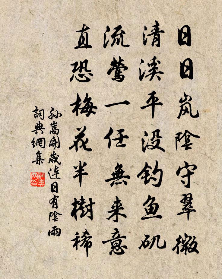 詩詞名句歷史字典書法欣賞書法字典國語詞典說文解字康熙字典古漢語字典標 題 作 者 詩 句 開歲連日有陰雨作者:孫嵩 朝代:宋代開歲連日有陰雨原文日日嵐陰守翠微,清溪平沒釣魚磯。流鶯一任無來意,直恐梅花半樹稀。詩詞問答問:開歲連日有陰雨的作者是誰?答:孫嵩問:開歲連日有陰雨寫於哪個朝代?答:宋代孫嵩開歲連日有陰雨書法欣賞開歲連日有陰雨書法作品詩詞推薦壽制使董侍郎程公許〔宋代〕秋雲陰陰壓邊城,秋風颯颯飛邊塵。淮堧夕烽連峴首,往來羽檄無時停。那籌樓上一長嘯,環六十郡皆陽春。老翁臨江仙(再到桂林)向滈〔宋代〕瘦損東陽綠底事,離愁別恨難禁。夜長誰共擁孤衾。來時青鬢在,今已二毛侵。流水青山依舊是,蘭橈往事空尋。送友人游昭州呈陳謙之僉判樂雷發〔宋代〕鵬運堂前話別愁,菭蘠三度楚江秋。近懷莫向元龍道,問舍求田是□頭。東岡王安石〔宋代〕東岡歲晚一登臨,共望長河映遠林。萬竅怒呺風喪我,千波競湧水無心。當可台鄧士將赴類試作詩餞之因效其體郭印〔宋代〕丹山采鳳群鳴集,雲外舒張覽輝翼。錦屏相望不千里,音中簫韶有人識。朝家選舉專一科,翰墨之工拔士多。好將戲題黃庭堅〔宋代〕平生性拙觸事真,醉里笑談多忤人。安得眼前只有清風與明月,美酒百船酬一春。柳枝詞十三首司馬光〔宋代〕新豐道上灞陵頭,又送夫君去遠遊。借問柳枝有寄否,古今共有幾多愁。上鄂州黃鶴磯項安世〔宋代〕黃鶴磯頭水似油,趙陀埽上石如鉤。舟人上得休夸客,曾過人間百仞流。朝中措(和)趙長卿〔宋代〕征帆一樓轉彎斜。驚鷺起汀沙。點點隨風逆上,滿江飛破殘霞。樓前光景,樓心紅粉,蟬翼輕紗。卻憶錢塘江上,次韻答任仲微黃庭堅〔宋代〕伯氏文章足起家,雁行唯我乏芳華。不堪黃綬腰銅印,只合清江把釣車。縮項魚肥炊稻飯,扶頭酒熟臥蘆花。吳兒對菊齊己〔唐代〕蝶醉風狂半折時,冷煙清露壓離披。欲傾琥珀杯浮爾,好把茱萸朵配伊。孔雀毛衣應者是,鳳凰金翠更無之。何因登崇陽縣北鋒亭張詠〔宋代〕高榭臨公宅,憑軒萬木秋。亂雲橫島嶼,鳴雁下汀州。到此欲長醉,何門銷舊愁。若為陶靖節,容易賦歸休。寄唐異山人魏野〔宋代〕不見琴書友,相思二十秋。能消幾席別,便是一生休。未得雲迎步,還應雪滿頭。何時各攜杖,竟去會嵩丘。句葉廷珪〔宋代〕不是妙音生妙指,只緣流水似流泉。之江淮留別京中親故耿湋〔唐代〕長雲迷一雁,漸遠向南聲。已帶千霜鬢,初為萬里行。繁蟲滿夜草,連雨暗秋城。前路諸侯貴,何人重客卿。題溪口廣慈寺葉清臣〔宋代〕雲中江樹冷蕭蕭,溪上僧歸倚畫橈。誰為秋風乘興去,松窗先聽富陽潮。月李商隱〔唐代〕過水穿樓觸處明, * 帶樹遠含清。初生欲缺虛惆悵,未必圓時即有情。滿庭芳王之道〔宋代〕翠蓋千重,青錢萬疊,雨餘綠漲銀塘。藕花無數,高下斗芬芳。渾似華清賜浴,溫泉滑、洗出真香。何妨更,合歡侯荊曾鞏〔宋代〕侯蠃夷門白髮翁,荊軻易水奇節士。偶邀禮數車上足,暫飽腥羶館中侈。師回拔劍不顧生,酒酣拂衣亦送死。磊落次韻唐師善見寄方回〔宋代〕歸來數畝小園寬,風有軒欞月有壇。總為才疏能忤俗,兼緣興盡合休官。空山老死知無補,往代興亡稍欲刊。洛下名句推薦一川菸草,滿城風絮,梅子黃時雨。賀鑄《青玉案·凌波不過橫塘路》 日落謝家池館,柳絲金縷斷。韋莊《歸國遙·春欲晚》 細影將圓質,人間幾處看。薛濤《月》 千古江山,英雄無覓孫仲謀處。辛棄疾《永遇樂·京口北固亭懷古》 信言不美,美言不信。老子《老子·德經·第八十一章》 七八個星天外,兩三點雨山前。辛棄疾《西江月·夜行黃沙道中》 今日俸錢過十萬,與君營奠復營齋。元稹《遣悲懷三首·其一》 草鋪橫野六七里,笛弄晚風三四聲。呂岩《牧童》 學者非必為仕,而仕者必如學。荀子《荀子·大略》 埋骨何須桑梓地,人生無處不青山。 * 《七絕·改西鄉隆盛詩贈父親》
