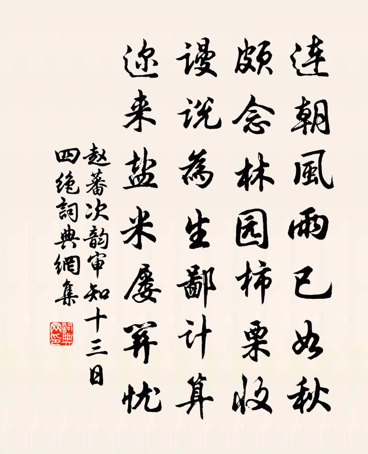 詩詞名句歷史字典書法欣賞書法字典國語詞典說文解字康熙字典古漢語字典標 題 作 者 詩 句 次韻審知十三日四絕作者:趙蕃 朝代:宋代次韻審知十三日四絕原文連朝風雨已如秋,頗念林園柿栗收。謾說為生鄙計算,邇來鹽米屢關憂。詩詞問答問:次韻審知十三日四絕的作者是誰?答:趙蕃問:次韻審知十三日四絕寫於哪個朝代?答:宋代趙蕃次韻審知十三日四絕書法欣賞次韻審知十三日四絕書法作品詩詞推薦題金禹瑞畫松圖王冕〔元代〕畢宏韋偃遠莫追,畫松得名今是誰?黃岩太守夸絕倒,休寧縣令爭新奇。蒼髯鐵甲風雷動,浮雲散盡青天空。只因求鑒吟邵雍〔宋代〕人無鑒流水,當求鑒止水。流水無定形,止不有定體。人無鑒於水,當求鑒於人。人鑒見人貌,人鑒見人神。趙尉送菜方岳〔宋代〕虛老空山學輔翁,荷鋤頭白雪蓬鬆。芥台如臂何曾夢,菜腦生筋漫自供。不料官園蒼玉束,絕勝禁臠紫駝峰。更煩驀山溪佚名〔宋代〕菊花新過,秋蕊香猶媚。三八燕山亭,賀聖朝、申生明世。肅霜天曉,正快活年時,慶新壽,萬年歡,人醉蓬萊里送王左丞五絕蔡肇〔宋代〕德星行鬥牛,人物東西夥。太史告占書,發春朝玉座。襄州試白雲歸帝鄉黃滔〔唐代〕杳杳復霏霏,應緣有所依。不言天路遠,終望帝鄉歸。高岳和霜過,遙關帶月飛。漸憐雙闕近,寧恨眾山違。陣觸蝶戀花許有壬〔元代〕一片白雲迷楚岫。風卷青秧,*邐波紋皺。馬上誰敲詩未就。回頭不覺雙山堠。漁父樵翁常邂逅。問我何求,無事松無可〔唐代〕枝幹怪鱗皴,煙梢出澗新。屈盤高極目,蒼翠遠驚人。待鶴移陰過,聽風落子頻。青青寒木外,自與九霄鄰。南中別蔣五岑向青州張說〔唐代〕老親依北海,賤子棄南荒。有淚皆成血,無聲不斷腸。此中逢故友,彼地送還鄉。願作楓林葉,隨君度洛陽。頌古十九首釋慧暉〔宋代〕寂寂無依病正深,雪老當年痕處針。一喚喚回春夢破,千山渾作木龍吟。和謝單推宋卿惠詩黃公度〔宋代〕逃空每喜足音聞,之子相逢真可人。知友無非大父行,求君須向古人倫。蠻煙傾蓋情如故,蜀繭題詩墨尚新。文采逸圃曾豐〔宋代〕莫空勞晚景,寧小負清時。天下復何事,漢陰殊不知。桔槔時俯仰,畲插幾盈虧。吾策未為得,渠言得策誰。對酒吟邵雍〔宋代〕有酒時時泛一甌,年將七十待何求。齒衰婚嫁尚未了,歲旱田園才薄收。客去有時閒拱手,日高無事靜梳頭。霜毛雨歇二首張耒〔宋代〕雨歇山園竹引芽,老禪睡起日初斜。今朝卻憶香嚴老,解點溈山一◇茶。始至郡韋應物〔唐代〕湓城古雄郡,橫江千里馳。高樹上迢遞,峻堞繞欹危。井邑煙火晚,郊原草樹滋。洪流蕩北阯,崇嶺鬱南圻。斯民九月八日送蕭少府歸洪州皎然〔唐代〕明日重陽今日歸,布帆絲雨望霏霏。行過鶴渚知堪住,家在龍沙意有違。過九成宮舊址二首游師雄〔宋代〕今古市朝已變,隋唐樓殿成空。惟有山頭明月,夜來猶照荒宮。武陵春(正月十四日夜孫使君席上觀雪,繼而月復明)毛滂〔宋代〕風過冰檐環佩響,宿霧在華茵。剩落瑤花襯月明。嫌怕有纖塵。鳳口銜燈金炫轉,人醉覺寒輕。但得清光解照人。龜山晚泊賀鑄〔宋代〕春候半寒溫,維舟淮上村。長林補山豁,青草際潮痕。久厭浮家役,重招去國魂。禪房欲舒寫,煙雨促黃昏。渼陂鄭谷〔唐代〕昔事東流共不回,春深獨向渼陂來。亂前別業依稀在,雨里繁花寂寞開。卻展漁絲無野艇,舊題詩句沒蒼苔。潸然名句推薦煙籠寒水月籠沙,夜泊秦淮近酒家。杜牧《泊秦淮》 塞雁高飛人未還,一簾風月閒。李煜《長相思·一重山》 秋天一夜靜無雲,斷續鴻聲到曉聞。張仲素《秋閨思二首》 治大者不治細,成大功者不成小列子及其弟子《列子·楊朱》 寧添一斗,莫添一口。佚名《增廣賢文·上集》 離一切諸相則名諸佛。鳩摩羅什譯《金剛經·離相寂滅》 白梅懶賦賦紅梅,逞艷先迎醉眼開。曹雪芹《詠紅梅花得“梅”字》 禍之所由生也,生自纖纖也。荀子《荀子·大略》 耽於女樂,不顧國政,則亡國之禍也。韓非及後人《韓非子·十過》 寧為太平犬,莫作亂離人!馮夢龍《醒世恆言·卷三》