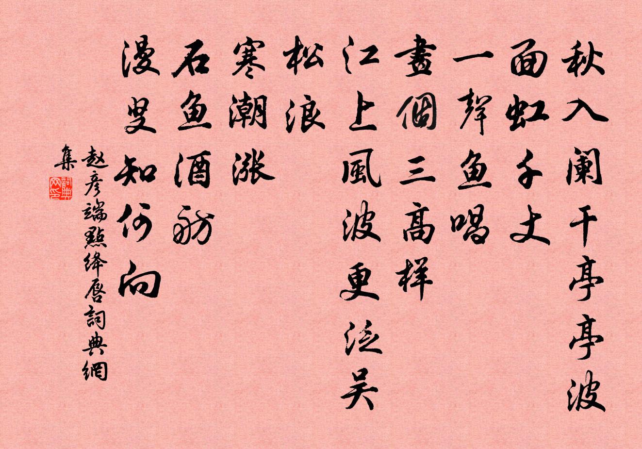 詩詞名句歷史字典書法欣賞書法字典國語詞典說文解字康熙字典古漢語字典標 題 作 者 詩 句 點絳唇作者:趙彥端 朝代:宋代點絳唇原文秋入闌乾,亭亭波面虹千丈。一聲魚唱。畫個三高樣。江上風波,更泛吳松浪。寒潮漲。石魚酒舫。漫叟知何向。詩詞問答問:點絳唇的作者是誰?答:趙彥端問:點絳唇寫於哪個朝代?答:宋代問:點絳唇是什麼體裁?答:詞趙彥端點絳唇書法欣賞點絳唇書法作品詩詞推薦化上人持缽乞頌釋正覺〔宋代〕化事而今盡付君,歸來還我驗兒孫。諸塵正受盛於缽,一句含胡覆卻盆。別處見人知雪嶺,自家喫飯識雲門。底心失鶴釋智圓〔宋代〕雙鶴忽飛去,清音更不聞。遠應尋鳳侶,閒恐避雞群。岸靜休臨水,庭空罷舞雲。唯餘舊蹤跡,篆字印苔紋。山居七詠中隱洞方岳〔宋代〕終南少室苦躋攀,已入先生一笑間。不學劉安便仙去,屋邊儘自有佳山。游彌牟菩提院庭下有凌霄藤附古楠其高數丈花陸游〔宋代〕絳英翠蔓亦佳哉!零亂空庭碼瑙杯。遍雨新花天有意,定知閒客欲閒來。送僧釋重顯〔宋代〕岩房高下拆寒梅,極目寥寥鴈影回。相別相逢竟何事,一聲江上發春雷。春日張耒〔宋代〕如絲苣甲飣春盤,韭葉金黃雪未乾。旅飯二年無此味,故園千里幾時還。異方時節三巵酒,殘歲風煙一慘顏。曾奉書乞米帖後姜夔〔宋代〕銀鉤鐵畫太師字,從人乞米亦可憐。五倉空虛胃神哭,竟日悄悄無炊煙。仙人留書方服氣,道士辟穀期引年。人生和三兄晚飲韓維〔宋代〕乍去炎氛濁暑中,高懷幽事不如窮。乍憐老竹梢雲碧,已見新梨著露紅。回雪舞腰來洛浦,仰天歌韻有秦風。雄圖挽陸君實尹應許〔宋代〕古今忠義獨斯人,危在須臾見益真。身不遠亡憂喪節,君非同逝慮蒙塵。平時誰執朝廷柄,末路方知社稷臣。楚些寄題江陵撫乾胡仲方官舍信美樓周必大〔宋代〕家在香城溪水邊,冠霞飛閣切雲煙。從軍樂事猶吾土,底用銷憂賦仲宣。塗中依韻和高主簿完翁見贈長句晁說之〔宋代〕孤宿孤江嗟婉娩,窮冬殘夜認璿璣。乘槎邂逅關心切,舒錦綢繆到眼稀。豈有梧桐留鳳食,端愁霰雪犯狐衣。秦樓偶書胡宏〔宋代〕一丘自足更何營,萬里福州長在眼。莫愁風景異山河,晴天雲蔭清峰晚。重憶山居六首。羅浮山(番禺連帥所遺)李德裕〔唐代〕龍伯釣鰲時,蓬萊一峰坼。飛來碧海畔,遂與三山隔。其下多長溪,潺湲淙亂石。知君分如此,贈逾荊山璧。村東晚眺陸游〔宋代〕飽食無營過暮年,筇枝到處一蕭然。清秋欲近露沾草,新月未高星滿天。遠火微茫沽酒市,叢蒲窸窣釣魚船。喔詩過宜福橋楊萬里〔宋代〕水鄉澤國最輸農,無旱無乾只有豐。碧豆密爭桑蔭底,綠荷雜出稻花中。是田是沼渾難辨,何地何村不一同。若遣竹溪直院盛稱起予草堂詩之善暇日覽之多有可劉克莊〔宋代〕月體無拘礙,那堪得水清。暫從掬處動,還在水中明。長物瓢安用,寒光握不盈。注眸蟾彩亂,入掌蚌珠生。顧兔經先主廟作貫休〔唐代〕古廟積煙蘿,威靈及物多。因知曹孟德,爭奈此公何。樹古雷痕剝,碑荒篆畫訛。今朝冥禱祝,只望息干戈。近村陸游〔宋代〕去去柴車十里中,竹林密處路才通。漸聞水磑知村近,遙望禾囷喜歲豐。漁艇往來春浪碧,人家高下夕陽紅。百錢長信宮劉得仁〔唐代〕簟涼秋氣初,長信恨何如。拂黛月生指,解鬟雲滿梳。一從悲畫扇,幾度泣前魚。坐聽南宮樂,清風搖翠裾。詠臥牛李家明〔唐代〕曾遭甯戚鞭敲角,又被田單火燎身。閒向斜陽嚼枯草,近來問喘為無人。名句推薦亂鴉三四點,愁坐話無憀。陳維崧《臨江仙·寒柳》 迸籜分苦節,輕筠抱虛心。柳宗元《巽公院五詠·苦竹橋》 恨君卻似江樓月,暫滿還虧,暫滿還虧,待得團圓是幾時?呂本中《採桑子·恨君不似江樓月》 驟雨過,珍珠亂撒,打遍新荷。元好問《驟雨打新荷》 橋北橋南千百樹,綠煙金穗映清流。朱栴《官橋柳色》 口言之,身必行之。墨子《墨子·48章 公孟》 愛而知其惡,憎而知其善。戴聖《禮記·曲禮上》 吳酒一杯春竹葉,吳娃雙舞醉芙蓉。白居易《憶江南詞三首》 知其雄,守其雌,為天下谿。老子《老子·道經·第二十八章》 畫船撐入花深處,香泛金卮。歐陽修《採桑子·荷花開後西湖好》