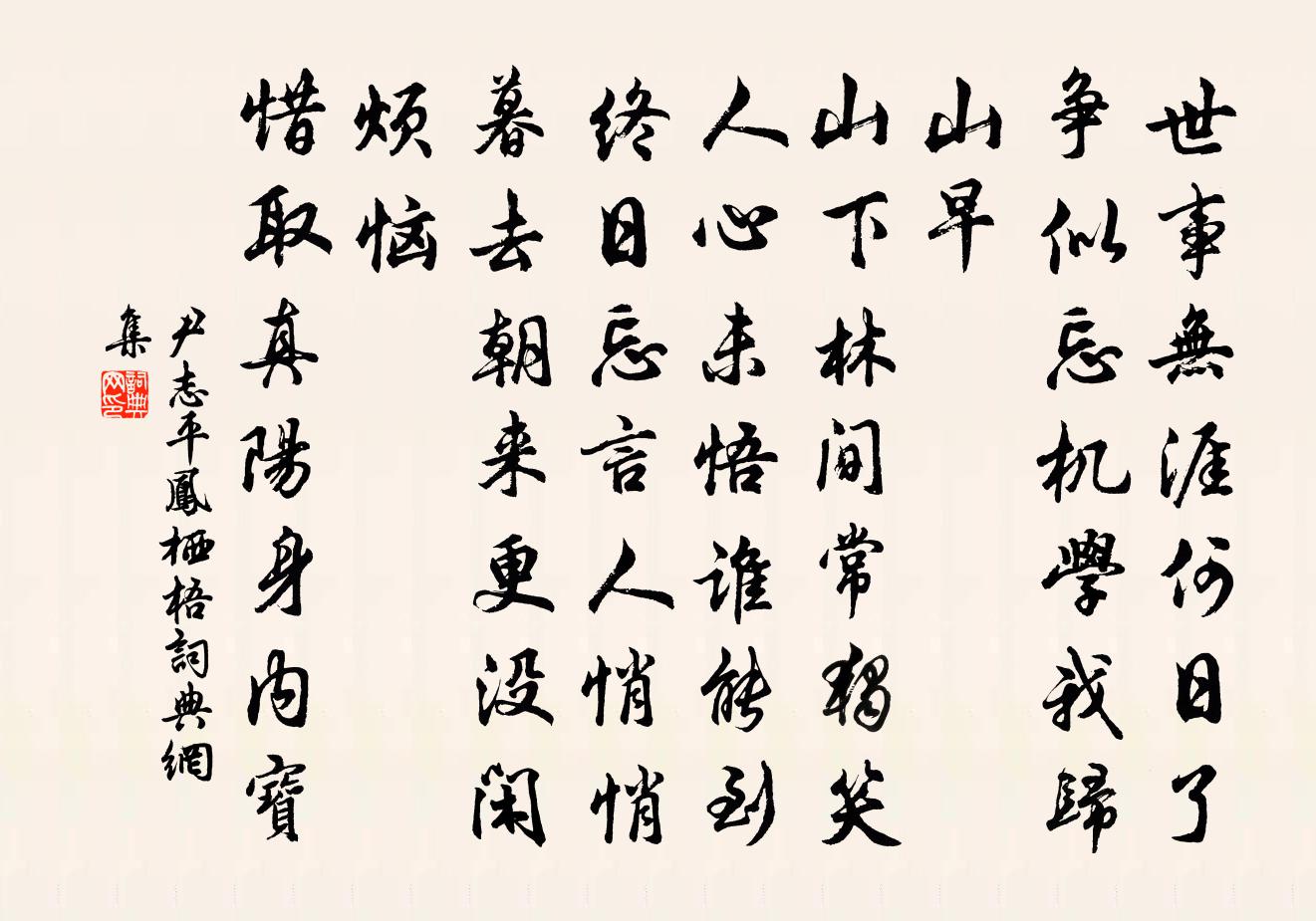 詩詞名句歷史字典書法欣賞書法字典國語詞典說文解字康熙字典古漢語字典標 題 作 者 詩 句 鳳棲梧作者:尹志平 朝代:元代鳳棲梧原文世事無涯何日了。爭似忘機,學我歸山早。山下林間常獨笑。人心未悟誰能到。終日忘言人悄悄。暮去朝來,更沒閒煩惱。惜取真陽身內寶。詩詞問答問:鳳棲梧的作者是誰?答:尹志平問:鳳棲梧寫於哪個朝代?答:元代問:鳳棲梧是什麼體裁?答:詞尹志平鳳棲梧書法欣賞鳳棲梧書法作品詩詞推薦再和劉克莊〔宋代〕依本文章趁韻詩,暮年深不願人知。退閒時有賓留刺,攣痹難為長折枝。蚓竅聲微羞入社,鴉塗札惡懶臨池。僧談虞美人(壬午中秋雨後不見月)劉辰翁〔宋代〕濕雲待向三更吐。更是沈沈雨。眼前兒女意堪憐。不說明朝後日、說明年今年十七望。當年知道晴三鼓。便似佳期長林山中聞賊退寄孟明府杜荀鶴〔唐代〕一縣今如此,殘民數不多。也知賢宰切,爭奈亂兵何。皆自干戈達,鹹思雨露和。應憐住山者,頭白未登科。秋日感事示介甫曾鞏〔宋代〕秋日氣已盛,陰蟲朝暮聲。煙雲斷溪樹,風雨入山城。沙磧有遺虜,旌旗多遠行。生民苦未息,吾黨恥論兵。仙華重午張森〔宋代〕空山值端午,采蒲南澗濱。蒲生裹白石,澗水清粼粼。蟠根寸九節,服食能通真。采之不盈掬,土潔含芳辛。行行游潘墺魏都冶墓庵舒岳祥〔宋代〕弄日微陰駕筍輿,柴桑五子共攜扶。雲門鐘鼓先朝賜,丞相門庭近日殊。綠樹兩行溪貫串,青巒百摺路縈紆。惟余游虞山記沈德潛〔清代〕虞山去吳城才百里,屢欲游,未果。辛丑秋,將之江陰,舟行山下,望劍門入雲際,未及登。丙午春,復如江陰,夜熱趙孟堅〔宋代〕夜熱寢復起,獨行池上亭。欹荷傾泫露,高柳掛疏星。秋蛩已啼草,咽魚時唼萍。無雲那有雨,湛湛一天青。三代門又吟周曇〔唐代〕千妖萬態逞妍姿,破國亡家更是誰。匡政必能除苟媚,去邪當斷勿狐疑。和襲美重玄寺雙矮檜陸龜蒙〔唐代〕可憐煙刺是青螺,如到雙林誤禮多。更憶早秋登北固,海門蒼翠出晴波。路學士知河中府楊億〔宋代〕一麾新自海濱還,又佩魚符入故關。千里山河臨劇郡,九天鴛鷺別通班。樓經往聖回清蹕,路接邊夷獻白環。版籍送友人曹彥約〔宋代〕藥裹包回碾臼聲,得閒訊息病先輕。謂予不信看舟楫,之死無他況利名。積雨晴邊花蒂耐,好風吹外葉聲平。只愁越人以幕養花因游其下二首王安石〔宋代〕尚有殘紅已可悲,更憂回首隻空枝。莫嗟身世渾無事,睡過春風作惡時。綿蠻佚名〔先秦〕綿蠻黃鳥,止於丘阿。道之雲遠,我勞如何。飲之食之,教之誨之。命彼後車,謂之載之。綿蠻黃鳥,止於丘隅。句曹逢時〔宋代〕撩我思家第一篇。建炎丞相成國呂忠穆公退老堂詩二首康執權〔宋代〕公居臨海亦經年,每恨淹留阻執鞭。異縣忽聞登帥閫,此身那得侍賓筵。古今誰似功名老,出入榮持將相權。從此送松麓李應龍彝甫攜阿潁鵬升參學姚勉〔宋代〕老龍本自天門出,躍入璧池聊換骨。鵬雛夭矯更不凡,平視南溟渺東渤。玉京道上五年前,曾見鱗翮雙飛天。只今依韻和歐陽永叔秋懷擬孟郊體見寄二首梅堯臣〔宋代〕秋思公何高,堆積自嵱嵷。出為悲秋辭,萬仞見孤聳。念我老於詩,我發實種種。而後傷故人,故人多作冢。陰風梁鼓吹曲 木紀謝沈約〔南北朝〕木紀謝。火運昌。炳南陸。耀炎光。民去癸。鼎歸梁。鮫魚出。慶雲翔。韊五帝。軼三王。德無外。化溥將。仁盪錢尹權宰趙必象〔宋代〕半年筆底種甘棠,棠未成陰又趣裝。明月扁舟琴鶴共,西風一劍斗先半。人生易散情如海,事會無窮鬢未霜。莫把名句推薦富貴易生禍端,必忠厚謙恭,才無大患王永彬《圍爐夜話·第六三則》 枕前淚共階前雨,隔個窗兒滴到明。聶勝瓊《鷓鴣天·別情》 水溢芙蓉沼,花飛桃李蹊。薛道衡《昔昔鹽》 朱門酒肉臭,路有凍死骨。杜甫《自京赴奉先縣詠懷五百字 / 自京赴奉先詠懷五百字》 寧做太平犬,莫做離亂人!佚名《增廣賢文·下集》 桃李春風一杯酒,江湖夜雨十年燈。黃庭堅《寄黃幾復》 想得此時情切,淚沾紅袖黦。韋莊《應天長·別來半歲音書絕》 林表明霽色,城中增暮寒。祖詠《終南望余雪》 復值接輿醉,狂歌五柳前。王維《輞川閒居贈裴秀才迪》 舟非水不行,水入舟則沒佚名《孔子家語·六本》