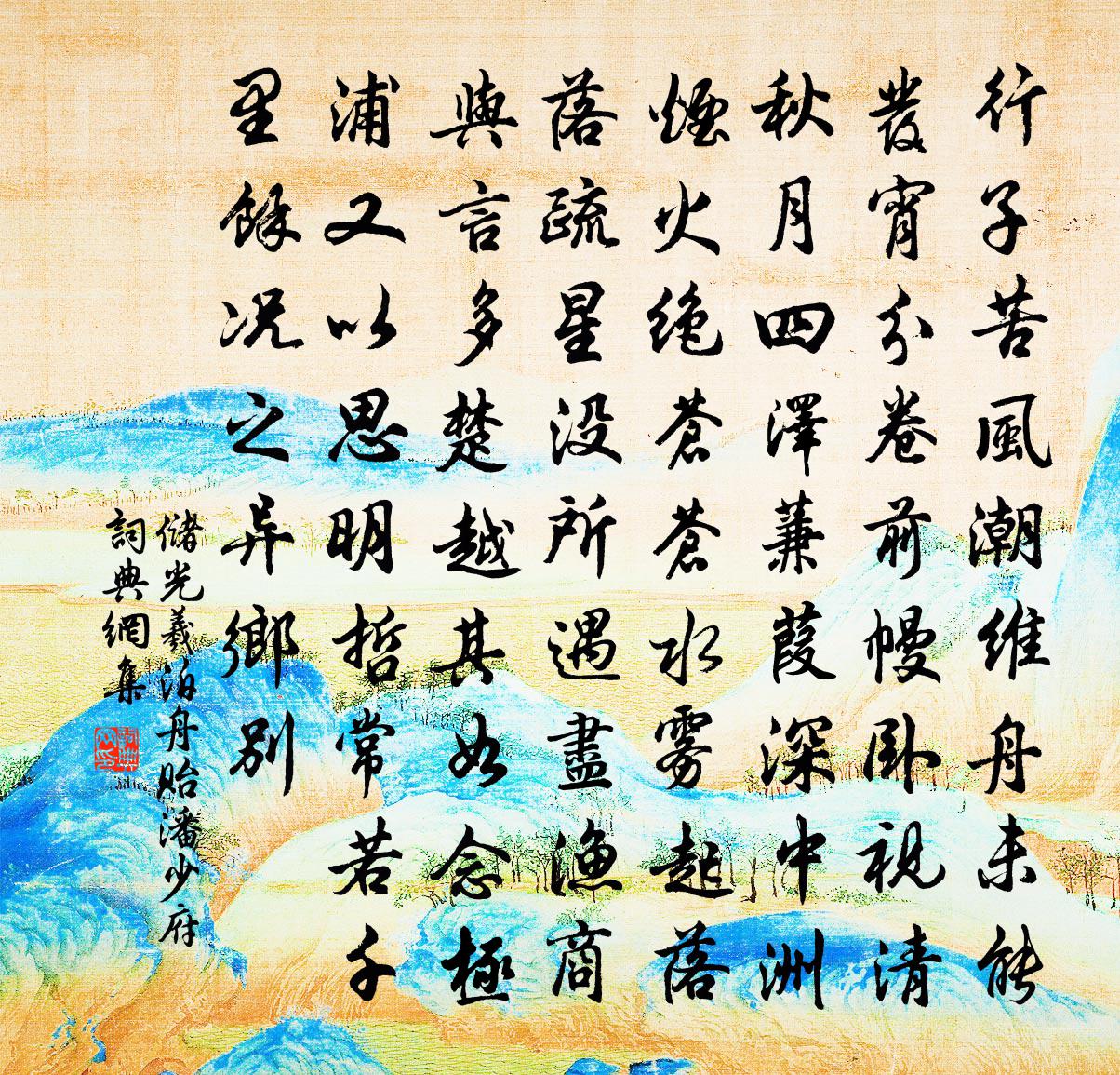 詩詞名句歷史字典書法欣賞書法字典國語詞典說文解字康熙字典古漢語字典標 題 作 者 詩 句 泊舟貽潘少府作者:儲光羲 朝代:唐代泊舟貽潘少府原文行子苦風潮,維舟未能發。宵分卷前幔,臥視清秋月。四澤蒹葭深,中洲煙火絕。蒼蒼水霧起,落落疏星沒。所遇盡漁商,與言多楚越。其如念極浦,又以思明哲。常若千里餘,況之異鄉別。詩詞問答問:泊舟貽潘少府的作者是誰?答:儲光羲問:泊舟貽潘少府寫於哪個朝代?答:唐代問:泊舟貽潘少府是什麼體裁?答:五古儲光羲泊舟貽潘少府書法欣賞泊舟貽潘少府書法作品注釋全唐詩:卷136_32詩詞推薦再用恢大山韻三首方回〔宋代〕書貴有容德,曰無嫉於頑。鳳鳴鷙其翰,狸首於菟斑。楚楚誇毗子,自謂高難攀。焉能凂我哉,冰炭何相關。君欲無題唐寅〔明代〕培風鳥瞰只神遊,鬧罷瓊枝又恁愁。莫負心期飄泊路,豈知身鎖靜安樓。形骸托與自然寄,泥壤終將分子留。寧墾賀新涼/賀新郎林正大〔宋代〕酌以蒲城酒。擷湘纍、秋英滿泛,介君眉壽。贈君點漆黟川墨,與印文章大手。問此別、相逢難又。三疊陽關聲墮畲田陶弼〔宋代〕畲田過雨小溪渾,遠近雲峰互吐吞。殊俗易昏三里霧,陽崖忽露一家村。桂花香里尋僧寺,榕葉陰中掩縣門。井稅題徐子比獨秀亭二首曾豐〔宋代〕隣山三五百為曹,氣伏心降讓我高。獨秀不知為獨秀,退然自視一秋毫。聞虜亂有感陸游〔宋代〕前年從軍南山南,夜出馳獵常半酣。玄熊蒼兕積如阜,赤手曳虎毛毿毿。有時登高望鄠杜,悲歌仰天淚如雨。頭顱中峰行樂卻望北山因而成詠林逋〔宋代〕拂石玩林壑,曠然空色秋。歸雲帶層巘,疏葦際滄洲。固自堪長往,何為難久留。庶將濠上想,聊作剡中游。漢江上作羅隱〔唐代〕漢江波浪淥於苔,每到江邊病眼開。半雨半風終日恨,無名無跡幾時回。雲生岸谷秋陰合,樹接帆檣晚思來。對此閒居述事邵雍〔宋代〕堂上慈親八十餘,階前兒女戲相呼。旨甘取足隨豐儉,此樂人間更有無。次韻郭明叔長歌黃庭堅〔宋代〕君不見懸車劉屯田,騎牛澗壑弄潺湲。八十唇紅眼點漆,金鍾舉酒不留殘。君不見征西徐尚書,為國捐軀矢石間。秋思陸游〔宋代〕西風吹葉滿湖邊,初換秋衣獨慨然。白首有詩悲蜀道,清宵無夢到鈞天。迂疏早不營三窟,流落今寧直一錢!把酒瑞上人求詩戴表元〔宋代〕寶葉山中源悟師,布衲百結面如痴。十年相憶忽在眼,談笑甚似仍耽詩。減字木蘭花呂渭老〔宋代〕明眸巧笑。坐久更宜燈燭照。小醉辭歸。懷抱明明只自知。瑣窗重見。桃李春風三月面。怎不思量。折柳孤吟斷殺登閣李士元〔唐代〕亂後獨來登大閣,憑闌舉目盡傷心。長堤過雨人行少,廢苑經秋草自深。破落侯家通永巷,蕭條宮樹接疏林。總輸送湯千趙師秀〔宋代〕能文兼悟性,前是惠休身。為選來京邑,因吟訪野人。所居才隔水,不見忽經旬。何事雲歸速,儒官拜敕新。華亭百詠滬瀆許尚〔宋代〕泛泛松江水,迢迢笠澤通。萬年知禹力,灌溉有餘功。江丞相萬里第四十五文天祥〔宋代〕星拆台衡地,斯文去矣休。湖光與天遠,屈注滄江流。題扇二十四首曹勛〔宋代〕雨余湖上數峰青,湖水連天似鏡平。一棹迎涼快襟袖,香從苹末晚風生。登臥龍山吳芾〔宋代〕巋然千古臥龍山,節物年來□舊觀。猶有樓台出天半,正令星斗逼人寒。春風偶種花千樹,夏日仍栽竹萬竿。自愧春晚即事陸游〔宋代〕龍骨車鳴水入塘,雨來猶可望豐穰。老農愛犢行泥緩,幼婦憂蠶采葉忙。名句推薦幾硯昔年游,於今成十秋。司馬光《送龔章判官之衛州·新及第》 惟上惟己,去表求實,奸者自見矣。來俊臣《羅織經·察奸卷第八》 思歸未可得,書此謝情人。李白《送郄昂謫巴中》 月傍苑樓燈影暗,風傳閣道馬蹄回。王守仁《元夕二首》 流星透疏木,走月逆行雲。賈島《宿山寺》 風遞幽香出,禽窺素艷來。齊己《早梅》 疏影橫斜水清淺,暗香浮動月黃昏。林逋《山園小梅·其一》 周郎妙計安天下,賠了夫人又折兵!羅貫中《三國演義·第五十五回》 明月樓高休獨倚。酒入愁腸,化作相思淚。范仲淹《蘇幕遮·懷舊》 憶昔花間相見後,只憑縴手,暗拋紅豆。歐陽炯《賀明朝·憶昔花間相見後》