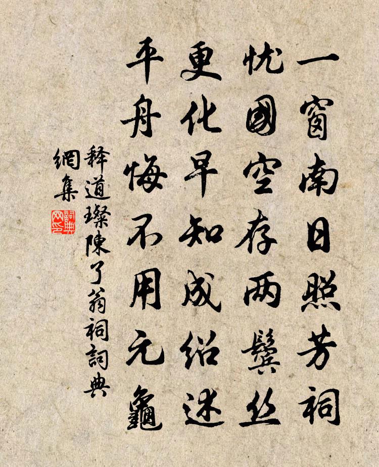 詩詞名句歷史字典書法欣賞書法字典國語詞典說文解字康熙字典古漢語字典標 題 作 者 詩 句 陳了翁祠作者:釋道璨 朝代:宋代陳了翁祠原文一窗南日照芳祠,憂國空存兩鬢絲。更化早知成紹述,平舟悔不用元龜。詩詞問答問:陳了翁祠的作者是誰?答:釋道璨問:陳了翁祠寫於哪個朝代?答:宋代釋道璨陳了翁祠書法欣賞陳了翁祠書法作品詩詞推薦點絳唇 贈妓胡祗遹〔元代〕風度高閒,水仙花露香吐。等閒尊俎。細聽黃金縷。命薄秋娘,夢斷霓裳舞。黃梅雨。燕儔鶯侶。那解芳心苦。歲晚書事十首劉克莊〔宋代〕門冷如冰盡不妨,由來富貴屬蒼蒼。誰能卻學痴兒女,深夜潛燒祭灶香。水調歌頭(凱歌上劉恭父)張孝祥〔宋代〕猩鬼嘯篁竹,玉帳夜分弓。少年荊楚劍客,突騎錦襜紅。千里風飛雷厲,四校星流慧掃,蕭斧銼春蔥。談笑青油幕江南寄所知周僕射羅隱〔唐代〕曾陪公子醉西園,峴首碑前事懶言。世亂共嗟王粲老,時危俱受信陵恩。潮憐把醆吟江徼,雨憶憑闌望海門。飛蓋南閣行魏了翁〔宋代〕北城之陽有南閣,李家石林丈人作。上有儲皇資善顏,下有先世淳熙腳。前瞻平遠後闉闍,左揖蜝頤右龍鶴。丙丁句釋曉瑩〔宋代〕但覺旅懷開。嚴氏溪放歌行(溪在閬州東百餘里)杜甫〔唐代〕天下甲馬未盡銷,豈免溝壑常漂漂。劍南歲月不可度,邊頭公卿仍獨驕。費心姑息是一役,肥肉大酒徒相要。嗚呼閩中送任畹端公還京陳陶〔唐代〕燕台下榻玉為人,月桂曾輸次第春。幾日酬恩坐炎瘴,九秋高駕拂星辰。漢庭鳳進鵷行喜,隋國珠還水府貧。多少梅花喜神譜大蕊八枝宋伯仁〔宋代〕中尊嚴祀典,鬯未裸而實。將裸而實彝,禮文知有秩。頌古五十三首釋文禮〔宋代〕南泉捧缽入堂來,賓主分明肯自乖。莫把威音論戒臘,本無位次可差排。東坡蘇軾〔宋代〕雨洗東坡月色清,市人行盡野人行。莫嫌犖确坡頭路,自愛鏗然曳杖聲。州民自言巴土冬濕且多陰晦今茲晴朗苦…因示寮吏羊士諤〔唐代〕雨霜以成歲,看舊感前聞。愛景隨朝日,凝陰積暮雲。□□□□□,忘言酒暫醺。□□□□□,□□□□□。感春十三首張耒〔宋代〕長嘯視天壤,手撫白玉琴。一撫再三嘆,誰哉知我音。翩翩媚俗子,一仰復一沉。靈鳳翔九霄,不顧蒿下禽。擇食舟中值雨釋紹嵩〔宋代〕客路雨連日,吾生良可嗟。蕭蕭打蓬急,脈脈受風斜。野望迷青草,江聲走白沙。今宵何處宿,欹枕聽鳴蛙。句朱巽〔宋代〕塞垣古木含秋色,祖帳行塵起夕陽。冬夜聽雨戲作陸游〔宋代〕少年交友盡豪英,妙理時時得細評。老去同參惟夜雨,焚香臥聽畫檐聲。和段君仲衡同令嗣天晴少出之作陳傅良〔宋代〕文字時高下,功名勢去來。誰人堪語此,吾道竟懷哉。攜幼安容膝,巡檐笑索梅。巷門通後圃,今數為君開。戲作舒岳祥〔宋代〕莫笑山居僻,山居號令明。芭蕉工報雨,鴝鵒解知更。樵長專封拜,詩壇擁甲兵。開窗一壺酒,新句賞新晴。題時覺寺在在堂十二首舒坦〔宋代〕榛棘叢中舊草堂,千年誰復辯興亡。累累付與張儀印,珍重空中一炷香。溪行方岳〔宋代〕春風何時來,柳色已如此。山中不知年,或告以於耜。鳴蓑起飯牛,青青渺煙水。獨有頭上霜,春風不吾以。名句推薦亂碧萋萋,雨後江天曉。梅堯臣《蘇幕遮·草》 詩言志,歌永言佚名《尚書·虞書·舜典》 待人寬一分是福,利人實利己的根基。洪應明《菜根譚·概論》 花紅易衰似郎意,水流無限似儂愁。劉禹錫《竹枝詞·山桃紅花滿上頭》 孤山寺北賈亭西,水面初平雲腳低。白居易《錢塘湖春行》 滄江好煙月,門系釣魚船。杜牧《旅宿》 正護月雲輕,嫩冰猶薄。辛棄疾《瑞鶴仙·賦梅》 聽元宵,往歲喧譁,歌也千家,舞也千家。王磐《古蟾宮·元宵》 今日聽君歌一曲,暫憑杯酒長精神。劉禹錫《酬樂天揚州初逢席上見贈》 雙眼自將秋水洗,一生不受古人欺。袁枚《隨園詩話·補遺 卷三》