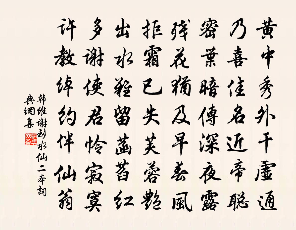 詩詞名句歷史字典書法欣賞書法字典國語詞典說文解字康熙字典古漢語字典標 題 作 者 詩 句 謝到水仙二本作者:韓維 朝代:宋代謝到水仙二本原文黃中秀外乾虛通,乃喜佳名近帝聰。密葉暗傳深夜露,殘花猶及早春風。拒霜已失芙蓉艷,出水難留菡萏紅。多謝使君憐寂寞,許教綽約伴仙翁。詩詞問答問:謝到水仙二本的作者是誰?答:韓維問:謝到水仙二本寫於哪個朝代?答:宋代韓維謝到水仙二本書法欣賞謝到水仙二本書法作品詩詞推薦四安道中所見牟巘五〔宋代〕人向長安渡口歸,長安不見但云霏。只應白鷺曾相識,船到前頭更不飛。送前東陽於明府由鄂渚歸故林張元乾〔宋代〕老舒古君子,送客皆善類。觴行頗軒渠,一斗輒徑醉。涼颸生白苹,落日照紫翠。驪駒雖在門,不下兒女淚。儻復和劉夢得歲夜懷友盧貞〔唐代〕文翰走天下,琴尊臥洛陽。貞元朝士盡,新歲一悲涼。名早緣才大,官遲為壽長。時來知病已,莫嘆步趨妨。賦得夜雨滴空階,送陸羽歸龍山(同字)皎然〔唐代〕閒階夜雨滴,偏入別情中。斷續清猿應,淋漓候館空。氣令煩慮散,時與早秋同。歸客龍山道,東來雜好風。上平江陳侍郎十絕張元乾〔宋代〕功名碎啄與時同,譬似 * 中。不覺片雲隨雨雹,適從何處運神通。杜牧圖唐寅〔明代〕司空幕府逼晨開,平善街頭日夜來。肯信璚花舊遊處,至今猶唱紫雲回。題韋雲叟草堂賈島〔唐代〕新起此堂開北窗,當窗山隔一重江。白茅草苫重重密,愛此秋天夜雨淙。答故人見諭韋應物〔唐代〕素寡名利心,自非周圓器。徒以歲月資,屢蒙藩條寄。時風重書札,物情敦貨遺。機杼十縑單,慵疏百函愧。常負冬晴行園中陸游〔宋代〕桔槔灌蔬固已非,竹筧澆花宜見譏。杏繁梅瘦種性別,一氣生殺均天機。細推物理孰不爾,摶風未可嘲卑飛。君其觀雪黃庶〔宋代〕疑是天公戲,都傾海作鹽。松筠知不變,丘壑見無厭。清為詩家極,寒因酒戶添。冬溫成俗疫,得此勝針砭。又和早雪韻王炎〔宋代〕夢覺流蘇寒慄冽,曉起方知末釀雪。松公變色失蒼髯,竹士垂頭摧直節。倚樓四望無紅塵,疑是身居銀漢津。千林石魚湖上醉歌元結〔唐代〕石魚湖,似洞庭,夏水欲滿君山春。山為樽,水為沼,酒徒歷歷坐洲島。長風連日作大浪,不能廢人運灑舫。我持沁園春(以雨不克登樓,用前韻)李曾伯〔宋代〕麴生來言,素娥寄聲,偶閬苑游。問去年今夕,逢余桂嶺,前年今夕,見子菟裘。何事塵勞,啟人厭倦,痴兔老蟾贈許柏溪惟一文天祥〔宋代〕長風吹飛藿,蜻蛚吟野草。流光速代謝,興懷令人老。遊子中夜起,悠悠酣且歌。明月委清照,江湖秋涉多。豈無題合江亭趙汝鐩〔宋代〕石鼓山頭一小亭,乾坤萬里眼雙明。雖因刺史能尋勝,不遇昌黎豈得名。衡岳雲開秋洗碧,蒸江湘合水爭清。書岩烏龍和尚釋重顯〔宋代〕空岩清夜坐,蘚徑積深雪。瞑目思古人,徹曙落殘月。童敲石磬寒,猿掛枯枝折。杳杳無限情,分明向誰說。答趙德麟見招之作晁說之〔宋代〕王孫囚冠安穩無,骨清肉健今更癯。學似東山何所歉,才如北海莫言疏。幾年漢上狂歌散,今日山前幽夢余。訊息大扶范成大〔宋代〕身如魚躍上長竿,路似鏡中相對看。珍重山丁扶我過,人間踽踽獨行難。王岩叟招飲南園韓維〔宋代〕翠木珍叢百畝問,我來雖晚及春殘。未嗟流景飄蓬疾,猶喜余芳對酒看。斜照舒遲明埤堄,清陰迢遞覆欄乾。憑君送衡陽歸客錢起〔唐代〕歸客愛鳴榔,南征憶舊鄉。江山追宋玉,雲雨憶荊王。醉里宜城近,歌中郢路長。憐君從此去,日夕望三湘。名句推薦春色惱人眠不得,月移花影上欄乾。王安石《春夜》 鞠躬盡瘁,死而後已。諸葛亮《後出師表》 雁柱十三弦,一一春鶯語。歐陽修《生查子·含羞整翠鬟》 春水滿四澤,夏雲多奇峰。陶淵明《四時》 苦雨思白日,浮云何由卷。李白《玉真公主別館苦雨贈衛尉張卿二首》 尊長前,聲要低。低不聞,卻非宜。李毓秀《弟子規·出則弟》 含煙御柳拂旌旗,帶露宮花迎劍戟。施耐庵《水滸傳·第一回》 天下皆知美之為美,斯惡已。皆知善之為善,斯不善已。老子《老子·道經·第二章》 遙知湖上一樽酒,能憶天涯萬里人。歐陽修《春日西湖寄謝法曹歌》 讀書好處心先覺,立雪深時道已傳。袁枚《隨園詩話·卷三》