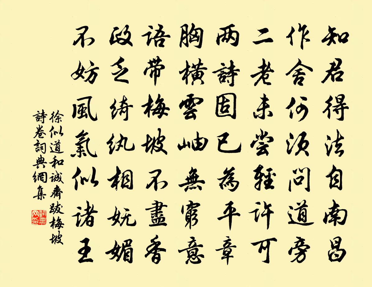 詩詞名句歷史字典書法欣賞書法字典國語詞典說文解字康熙字典古漢語字典標 題 作 者 詩 句 和誠齋跋梅坡詩卷作者:徐似道 朝代:宋代和誠齋跋梅坡詩卷原文知君得法自南昌,作舍何須問道旁。二老未嘗輕許可,兩詩固已為平章。胸橫雲岫無窮意,語帶梅坡不盡香。政乏綺紈相嫵媚,不妨風氣似諸王。詩詞問答問:和誠齋跋梅坡詩卷的作者是誰?答:徐似道問:和誠齋跋梅坡詩卷寫於哪個朝代?答:宋代徐似道和誠齋跋梅坡詩卷書法欣賞和誠齋跋梅坡詩卷書法作品詩詞推薦沁園春(送友人補太學)姚勉〔宋代〕一部周官,學間淵源,山齊得來。最雄姿直氣,不塗脂粉,仙風道骨,不涴塵埃。萬里青雲,相期闊步,底事向天深渡文同〔宋代〕前日寒食在綿州,牡丹盛開海棠洛。今已逾旬過深渡,山桃一枝橫曉閣。此花平川最為早,何乃於此才破萼。化工句祝廉夫〔宋代〕會當歸去來。送平江趙法曹劉宰〔宋代〕金科天上耿星宸,丹筆年來有屈伸。子去平反供母笑,民知寬大頌君仁。祗今茂苑題輿客,曾是瓊林合席人。若間浮丘廟陳巨川〔宋代〕浮丘羽化幾經年,千仞青溪有洞天。丹灶石床依舊在,雲深何處問神仙。南湖有鷗成群里閭間雲數十年未嘗見也實塵中張鎡〔宋代〕東家西家翁媼說,白洋湖自有多年。何曾識見江鷗至,消得主人詩興顛。冬夕會諸同僚與稅舍弟郡齋飲話通判歐郎中以蘇頌〔宋代〕立朝才薄倖潛郎,出守恩優便養堂。賴得同僚借河潤,坐令尸祿荷龍光。蜀相廟汪元量〔宋代〕我謁武侯祠,陰郎草淒淒。當時南陽結廬學龍臥,深山大澤無人知。胡為蜀先主,三顧前致辭。欲煩恢復天下計,過山農家顧況〔唐代〕板橋人渡泉聲,茅檐日午雞鳴。莫嗔焙茶煙暗,卻喜曬穀天晴。白鬍桃李白〔唐代〕紅羅袖裡分明見,白玉盤中看卻無。疑是老僧休念誦,腕前推下水晶珠。隋堤柳李山甫〔唐代〕曾傍龍舟拂翠華,至今凝恨倚天涯。但經春色還秋色,不覺楊家是李家。背日古陰從北朽,逐波疏影向南斜。年年河陰中寨寒食梅堯臣〔宋代〕擊柝聲初絕,為魚夢已殘。幽禽哢清曉,宿雨度余寒。爨火明千灶,風旗展一竿。歸心憑社燕,自嘆此微官。滄洲閣集句二首王阮〔宋代〕洲島驟回合,冥冥菰蒲中。清流中落烏,遵渚有歸鴻。水作青羅帶,腳踏赤鯶公。蓬萊雖遼絕,長嘯激清風。六月六日夜陳與義〔宋代〕蘊隆豈不壞,涼氣亦徐還。獨立清夜半,疏星蒼檜間。晦明莽相代,天地本長閒。四顧何寥落,微風時動關。漁家傲(次前人)陳著〔宋代〕浪麥風微花霧掃。痕沙水淺溪橋小。屬玉雙雙飛杳杳。山寬繞。新晴繡得春分曉。獨立無言心事渺。曾將宇宙思量日日李商隱〔唐代〕日日春光斗日光,山城斜路杏花香。幾許心緒渾無事,得及遊絲百尺長?呈尤運使袤延之五首趙蕃〔宋代〕往者江次對,不妄出薦口。門無雜遝賓,麟角鱉肋九。斯文獨許公,是謂言可否。幾年闕通謁,今乃獲拜手。遊仙都觀五首吳芾〔宋代〕登覽茲山古到今,流傳今有幾何人。如今勝踐懸知少,況有新詩為寫真。假中閉戶終日偶得絕句陸游〔宋代〕官身常欠讀書債,祿米不供沽酒資。剩喜今朝寂無事,焚香閒看玉溪詩。秋夕對月羅隱〔唐代〕夜月色可掬,倚樓聊解顏。未能分寇盜,徒欲滿關山。背冷金蟾滑,毛寒玉兔頑。姮娥謾偷藥,長寡老中閒。名句推薦至今窺牧馬,不敢過臨洮。西鄙人《哥舒歌》 人之聰明,多失於浮炫脫脫《金史·列傳·卷三十三》 去年戰桑乾源,今年戰蔥河道。李白《戰城南》 獨自莫憑欄,無限江山,別時容易見時難。李煜《浪淘沙令·簾外雨潺潺》 想到他日是那樣下場,則可以發憤矣。王永彬《圍爐夜話·第三六則》 望時而待之,孰與應時而使之。荀子《荀子·天論》 愛之欲其生,惡之欲其死。釋原妙《偈頌六十七首》 以小人之慮,度君子之心。劉義慶《世說新語·雅量》 天入平湖晴不風,夕帆和雁正浮空。陳與義《登岳陽樓》 相見情已深,未語可知心。李白《相逢行二首》