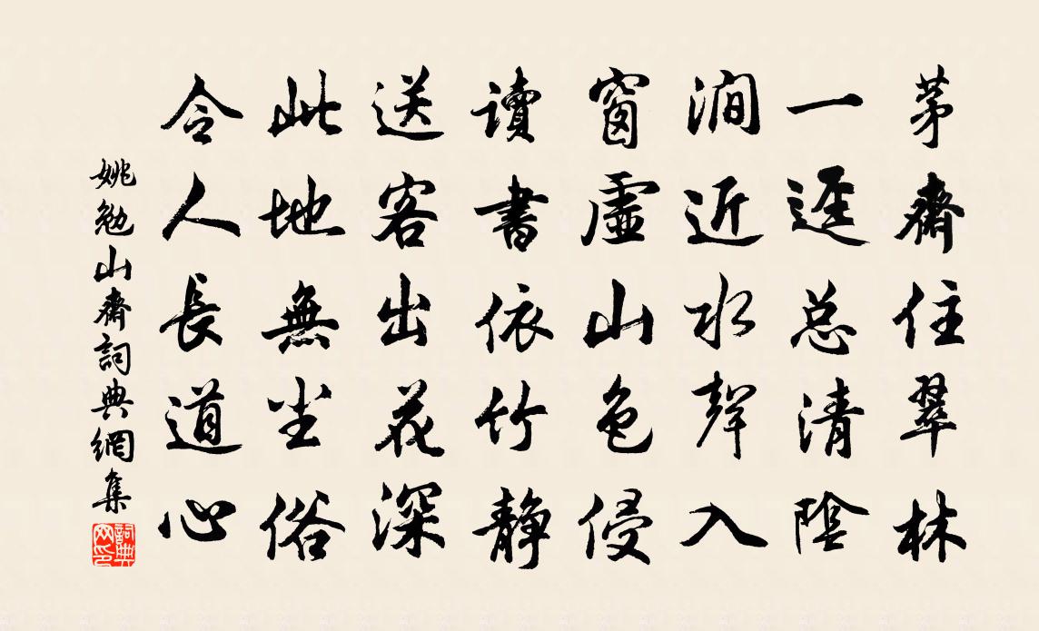 詩詞名句歷史字典書法欣賞書法字典國語詞典說文解字康熙字典古漢語字典標 題 作 者 詩 句 山齋作者:姚勉 朝代:宋代山齋原文茅齋住翠林,一逕總清陰。澗近水聲入,窗虛山色侵。讀書依竹靜,送客出花深。此地無塵俗,令人長道心。詩詞問答問:山齋的作者是誰?答:姚勉問:山齋寫於哪個朝代?答:宋代姚勉山齋書法欣賞山齋書法作品詩詞推薦蟋蟀仇遠〔宋代〕蟋蟀一何多,曉夜鳴不已。居然聲相應,各為氣所使。零露聊飽蟬,落葉才庇螘。秋風滿庭砌,安能久居此。愁聲登羅浮山吳泳〔宋代〕海山半放失蓬萊,微帶雲根雨腳來。元是道家清絕境,世間妄指作陽台。題奇石(石在浙西公署)李德裕〔唐代〕蘊玉抱清輝,閒庭日瀟灑。塊然天地間,自是孤生者。同崔八詣藥山訪融禪師李商隱〔唐代〕共受征南不次恩,報恩惟是有忘言。岩花澗草西林路,未見高僧只見猿。有感二首牟融〔唐代〕何事離懷入夢頻,貧居寂寞四無鄰。詩因韻險難成律,酒為愁多不顧身。眼底故人驚歲別,尊前華發逐時新。十年偈頌八十七首釋慧開〔宋代〕循規守短,無繩自縛。縱貢無礙,外道魔軍。存心澄寂,默照邪禪。恣意忘緣,解脫深坑。惺惺不昧,帶鎖鎖枷。贈浩然觀胡道士唐士恥〔宋代〕只為丹霄足羽軿,且將奇法驗人寰。從他血肉並煙火,自有仙家九轉丹。西江月慢佚名〔宋代〕煙籠細柳,映粉牆、垂絲輕裊。正歲稍暖律風和,裝點後苑台沼。見乍開、桃若燕脂染,便須信、江南春早。又數菩薩蠻 繡江即事劉敏中〔元代〕行雲恰過前山北。靠山村落移時黑。腳底一聲雷。北風截雨回。出門南望立。過客衣裳濕。問有雨如何。一傾三尺寄遠田娥〔唐代〕憶昨會詩酒,終日相逢迎。今來成故事,歲月令人驚。淚流紅粉薄,風度羅衣輕。難為子猷志,虛負文君名。寄元九 自此後在渭村作。白居易〔唐代〕晨雞才發聲,夕雀俄斂翼。晝夜往復來,疾如出入息。非徒改年貌,漸覺無心力。自念因念君,俱為老所逼。君年過神助橋亭楊萬里〔宋代〕下轎渾將野店看,只驚腳底水聲寒。不知竹外長江近,忽有高桅出寸竿。中隱堂詩(並敘)蘇軾〔宋代〕岐山龜宰王君紳龜,其祖故蜀人也,避亂來長安,而遂家焉。其居第園有名長安城中,號中隱堂者是也。予之長安勝勝慢(家妓榮奴既出有感)晁補之〔宋代〕朱門深掩,擺盪春風,無情鎮欲輕飛。斷腸如雪,撩亂去點人衣。朝來半和細雨,向誰家、東館西池。算未肯、似之廣陵宿常二南郭幽居李白〔唐代〕綠水接柴門,有如桃花源。忘憂或假草,滿院羅叢萱。暝色湖上來,微雨飛南軒。故人宿茅宇,夕鳥栖楊園。還惜九效寧固葛立方〔宋代〕珠丘峨峨兮蒼梧遠,弓劍杳隔兮九土魂斷。邊聲起兮春草深,木鐸無聲兮歲月換。上天悔禍兮誘天驕,黃腸素紼兮案上梅花范成大〔宋代〕南坡玉雪萬花團,舊約東風載酒看。冷落銅瓶一枝亞,今年天女亦酸寒。豐年行周弼〔宋代〕長田一畝三石收,截茅作囤遮水牛。馴雞塞籠彘牢滿,大兒看親女上頭。里胥關門罷輸送,晴烏窺檐鼠沿棟。瓦盆祝英台近(花港觀魚)周密〔宋代〕六橋春浪暖,漲桃雨、鱖初肥。正短棹輕蓑,牽筒荇帶,縈網蓴絲。依稀。岸紅溯遠,漾仙舟、誤入武陵溪。何處上巳游顯親寺題其壁方岳〔宋代〕屬玉雙飛水滿塘,石爐柏子掩山房。一瓶瀑煮春風濕,只聽松聲意自長。名句推薦百里不同風,千里不同俗班固《漢書·傳·王貢兩龔鮑傳》 眾生必死,死必歸土:此之謂鬼。戴聖《禮記·祭義》 清娥畫扇中,春樹鬱金紅。溫庭筠《清明日》 錦里開芳宴,蘭缸艷早年。盧照鄰《十五夜觀燈》 天地之道,博也、厚也、高也、明也、悠也、久也。子思《中庸·第二十六章》 君子時詘則詘,時伸則伸也。荀子《荀子·仲尼》 自知者英,自勝者雄。王通《中說·卷四·事君篇》 青山飛起不壓物,野水流來欲濕人牛殳《琵琶行》 黃山僅見其腳,惜未一瞻面目。沈復《浮生六記·浪遊記快》 他鄉逢七夕,旅館益羈愁。孟浩然《他鄉七夕》