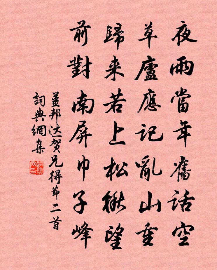 詩詞名句歷史字典書法欣賞書法字典國語詞典說文解字康熙字典古漢語字典標 題 作 者 詩 句 賀兄得節二首作者:姜邦達 朝代:宋代賀兄得節二首原文夜雨當年舊話空,草廬應記亂山重。歸來若上松楸望,前對南屏巾子峰。詩詞問答問:賀兄得節二首的作者是誰?答:姜邦達問:賀兄得節二首寫於哪個朝代?答:宋代姜邦達賀兄得節二首書法欣賞賀兄得節二首書法作品詩詞推薦瑞鶴仙王吉昌〔元代〕衷情崇淡薄。盪浮萍、縱跡逐波淪落。聰明總不作。念掀天富貴,夢驚為錯。猛揮愛索。訪餘裕、真風綽綽。穀神自和羅道成〔宋代〕水雲蹤跡自閒游,夏谷陰寒冷勝秋。猿鳥性情猶戀舊,翻身卻去海邊州。次韻侯宣城疊嶂樓雙溪閣長篇蘇轍〔宋代〕作官如負擔,一負當且馳。不知息肩處,妄問道遠邇。我乘章江流,卻入宛溪水。舍舟陟崔嵬,行路極旬已。名都和潭俯張朝請行縣言懷楊時〔宋代〕夾道旌麾動,陰霾萬里開。霜迎威令肅,春逐馬蹄來。幽壑光初滿,寒荄暖自回。仰窺嵩華質,曾未施纖埃。幽蘭鮑照〔南北朝〕結佩徒分明。抱梁輒乖忤。華落知不終。空愁坐相誤。西湖訪梅趙汝鐩〔宋代〕久無梅信息,訪問到湖濱。耐盡一冬冷,開殘千樹春。臨流轉風韻,與雪斗精神。疏影暗香後,能吟有幾人。嚴陵郡舍陳允平〔宋代〕花飛石上班,水落白雲灣。簾卷千重樹,窗開四面山。鼓聲魚市近,旗影訟庭閒。滿目皆吟思,殘陽縹緲間。漁父吳鎮〔元代〕極浦遙看兩岸斜。碧波微影弄晴霞。孤舟小,去無涯。那個汀洲不是詩謁按察疏齋賜賤號二大字賦詩以謝楊公遠〔宋代〕幸披雲霧睹青天,盡道山人有宿緣。得坐春風才半日,勝居塵世已千年。槎枯許到銀河畔,葭老容依玉樹邊。兩字廬山中聞桂香憶游茅山時夢中游桂花下董嗣杲〔宋代〕我游三茅山,月下丹光麗。夢駕翠蜺車,涼雲擁金袂。兩耳波浪透,廣漠不可際。猶記摶扶搖,乘風曾問帝。今秋依韻酬葉道卿中秋對月二首范仲淹〔宋代〕孤光千里與君逢,最愛無雲四望通。處處樓台競歌宴,的能愛月幾人同。憶秦娥·春酲薄劉克莊〔宋代〕春酲薄。夢中球馬豪如昨。豪如昨。月明橫笛,曉寒吹角。古來成敗難描摸。而今卻悔當時錯。當時錯。鐵衣猶在山行戴復古〔宋代〕度嶺休騎馬,臨淵看網魚。木根高可坐,岩石細堪書。谷鳥鳴相答,山雲卷復舒。儒衣人賣酒,疑是馬相如。過下梅楊萬里〔宋代〕不特山盤水亦回,溪山信美暇徘徊。行人自趁斜陽急,關得歸鴉更苦催。句胡君防〔宋代〕桃榔雨醉江城夜,橄欖風吟野驛秋。旅悶十首方回〔宋代〕年飢身復病,食盡藥無良。此老何其窘,於詩自不妨。暑窗從紙破,晴井放繩長。稍覺愁眉展,初秋夜欲涼。客有餉水母線者坐人賦之因次其韻方岳〔宋代〕蒼潮漱雪盡風流,寒擁春沙了雋游。霜髓英英矜客夢,冰絲一一做詩愁。有騷風味秋能老,非酒生涯誰與酬。解佩拒霜花王炎〔宋代〕池上木芙蓉,曉寒摧折之。綠葉未盡雕,紅芳已先萎。空得拒霜名,憔悴不得持。人生亦如此,榮盛須及時。少壯出城暫憩林下宋祁〔宋代〕下馬清林下,翛然忘俗情。山禽不辨種,溪草盡無名。露筍披斑箬,風葩抗紫莖。徘徊漱岩溜,未忍濯塵纓。累年告老恩旨未俞詔領祠宮遂還鄉閈燕間無事蘇頌〔宋代〕我昔就學初,齠童齒未齔。嚴親念痴狂,小藝誘愚鈍。始時授章句,次第教篇韻。蒙泉企層瀾,覆簣期九仞。十齡名句推薦黃鶴一去不復返,白雲千載空悠悠。崔顥《黃鶴樓 / 登黃鶴樓》 樓外垂楊千萬縷。欲系青春,少住春還去。朱淑真《蝶戀花·送春》 事莫明於有效,論莫定於有證王充《論衡·卷二十三·薄葬篇》 不知細葉誰裁出,二月春風似剪刀。賀知章《詠柳 / 柳枝詞》 已是黃昏獨自愁,更著風和雨。陸游《卜運算元·詠梅》 天下熙熙,皆為利來;天下攘攘,皆為利往。司馬遷《史記·貨殖列傳》 殘霞夕照西湖好,花塢苹汀,十頃波平,野岸無人舟自橫。歐陽修《採桑子·殘霞夕照西湖好》 嘆十年心事,休休莫莫。吳潛《滿江紅·豫章滕王閣》 馬上牆頭,縱教瞥見,也難相認晁端禮《水龍吟·詠月》 白雲回望合,青靄入看無。王維《終南山》