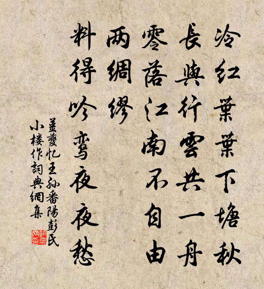 冷紅葉葉下塘秋。長與行雲共一舟。零落江南不自由。兩綢繆。料得吟鸞夜夜愁。