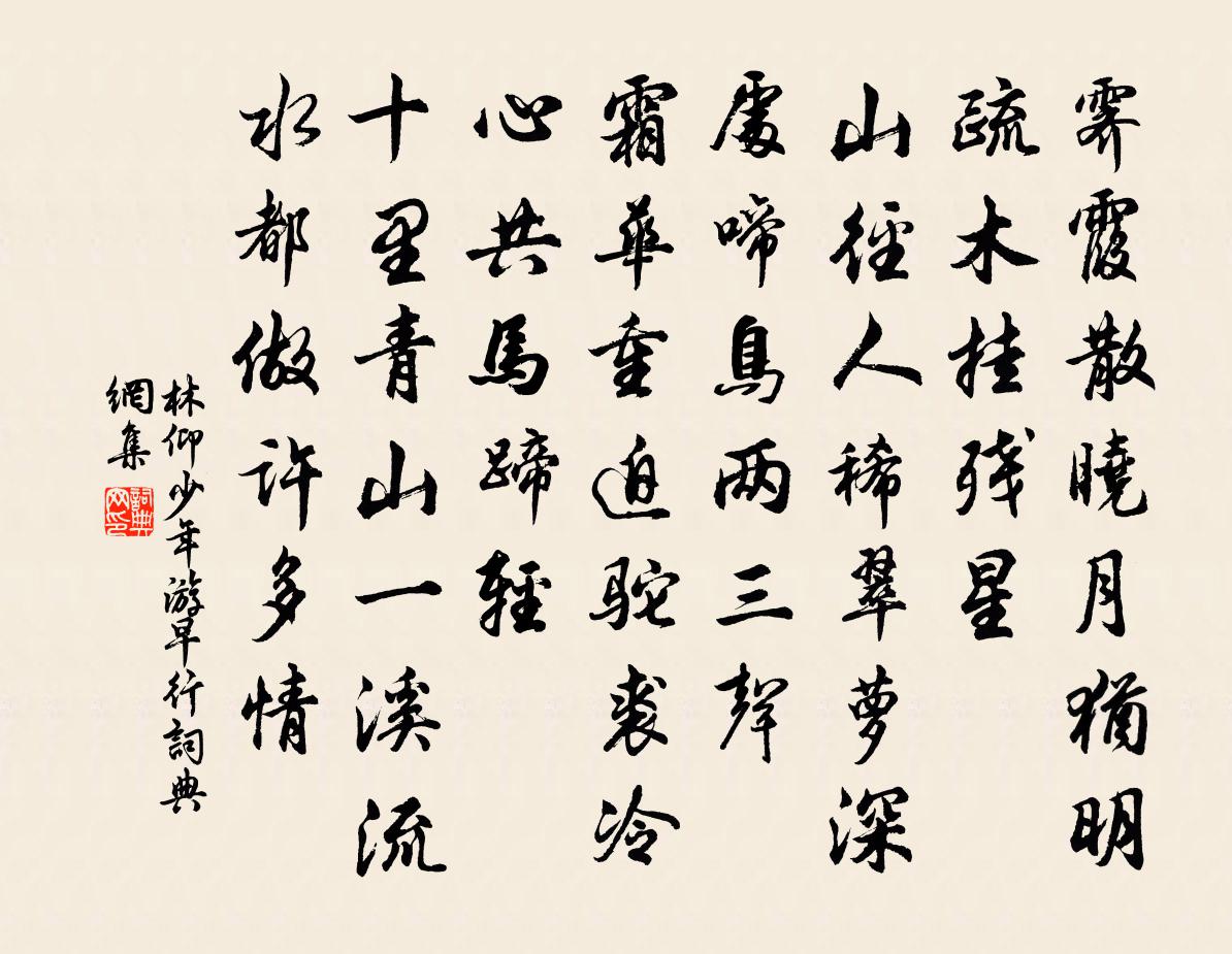 詩詞名句歷史字典書法欣賞書法字典國語詞典說文解字康熙字典古漢語字典標 題 作 者 詩 句 少年游(早行)作者:林仰 朝代:宋代少年游(早行)原文霽霞散曉月猶明。疏木掛殘星。山徑人稀,翠蘿深處,啼鳥兩三聲。霜華重迫駝裘冷,心共馬蹄輕。十里青山,一溪流水,都做許多情。詩詞問答問:少年游(早行)的作者是誰?答:林仰問:少年游(早行)寫於哪個朝代?答:宋代問:少年游(早行)是什麼體裁?答:詞林仰少年游(早行)書法欣賞少年游(早行)書法作品詩詞推薦春近陸游〔宋代〕歷授人時後,天回斗柄初。農疇興耒耜,家塾盛詩書。縹緲雙鳧舄,咿啞一鹿車。山翁喜春近,隨處狎樵漁。雙雙燕 春山丘處機〔元代〕春煙淡盪,青山媚,行雲亂飄空界。花光石潤,秀出洞天奇怪。戶牖平高萬丈,盡耳目、臨風一快。多生浩劫塵情風雨兼旬繼之以雪作惜梅嘆趙蕃〔宋代〕至寶橫道驚路人,明珠白璧天不珍。風饕雪虐雨更打,委珠碎璧同泥塵。天生人材怨不以,天亦何心及於爾。不然摸魚兒 春日西湖泛舟張翥〔元代〕漲西湖、半篙新雨,麴塵波外風軟。蘭舟同上鴛鴦浦,天氣嫩寒輕暖。簾半卷。度一縷、歌雲不礙桃花扇。鶯嬌燕次吳菊潭八月十四夜韻二首葉茵〔宋代〕月過市無聲,令人毛髮清。連村三鼓急,隔水一燈明。琢句醉時語,簪花老後情。憑欄髮長嘯,不管臥龍驚。奉酬臞菴李侍郎白玉蟾〔宋代〕滿月世界琉璃光,通宵不寐據胡床。語言玉潤篇篇錦,心膽冰清字字香。方廣道中半嶺少憩張栻〔宋代〕半嶺籃輿小駐肩,眼中已覺渺雲煙。山頭更盡無窮境,非是人間別有天。大風寒微晴方回〔宋代〕窮旅寬愁思,嚴寒作淡晴。終須開日色,何可欠風聲。地白猶含凍,天青漸放明。吳門稍和暖,應有故人迎。閔荒詩元結〔唐代〕煬皇嗣君位,隋德滋昏幽。日作及身禍,以為長世謀。居常恥前王,不思天子游。意欲出明堂,便登浮海舟。令行送趙秘著赴湖北倉張弋〔宋代〕聖君私七澤,使事浼清高。俗古山川闊,路長車馬勞。峒人耕綠野,隱者醉紅桃。閒暇應登賞,詞章繼楚騷。汴京紀事二十首 其十六劉子翬〔宋代〕盤石曾聞受國封,承恩不與幸臣同。時危運作高城砲,猶解捐軀立戰功。原明官間以余兼職良苦作詩見勞次韻二首右范祖禹〔宋代〕忘言象外已無求,應物環中自不憂。匠石旁觀傷手斫,尚應皮裹有陽秋。秋思張耒〔宋代〕故人陳跡生蛛網,古殿苔深疊綠繒。檐雨晚秋鳴槁葉,窗風深夜觸孤燈。句鮮于侁〔宋代〕龍卻難尋百潭水,地靈長對五峰山。桐花散翁輓詩王柏〔宋代〕瀫水之西,巍然一峰。是白道堅,翔舞而東。林巒蓊蔚,丘壑渾融。雍雍聚落,惟金之宗。五世積累,鍾此散翁。壬戌人日南溪暮景三首楊萬里〔宋代〕翡翠驚飛不作行,沙鷗亂下自成雙。一天霞綺沉波底,便是西川濯錦江。又四首劉克莊〔宋代〕咄咄清流久灌輸,帝虛館殿待名儒。縱□□□□□嶺,未抵鴟夷泛太湖。青史方將觀晚節,黃封尚可易村沽。書言閒中真山民〔宋代〕敢咎章縫解誤人,甘於閒處著閒身。腹中書在溫仍熟,夢裡詩成記不真。引鶴徐行三逕曉,約梅同醉一壺春。今朝胡笳十八拍。第一拍劉商〔唐代〕漢室將衰兮四夷不賓,動干戈兮征戰頻。哀哀父母生育我,見離亂兮當此辰。紗窗對鏡未經事,將謂珠簾能蔽身。泉州南郭二首劉克莊〔宋代〕閩人務本亦知書,若不耕樵必業儒。惟有桐城南郭外,朝為原憲莫陶朱。名句推薦紅深綠暗徑相交,抱暖含芳披紫袍。溫庭筠《寒食日作》 清晨入古寺,初日照高林。常建《題破山寺後禪院》 夫君子之行,靜以修身,儉以養德。諸葛亮《誡子書》 荷花開後西湖好,載酒來時。歐陽修《採桑子·荷花開後西湖好》 是故天地不昭昭,大水不潦潦,大火不燎燎,王德不堯堯者,乃千人之長也。墨子《墨子·01章 親士》 殘酒憶荊高,燕趙悲歌事未消。陳維崧《南鄉子·邢州道上作》 得黃金百,不如得季布一諾司馬遷《史記·季布欒布列傳》 勸君更盡一杯酒,西出陽關無故人。王維《渭城曲 / 送元二使安西》 匝路亭亭艷,非時裛裛香。李商隱《十一月中旬至扶風界見梅花》 人生自古誰無死?留取丹心照汗青。文天祥《過零丁洋》