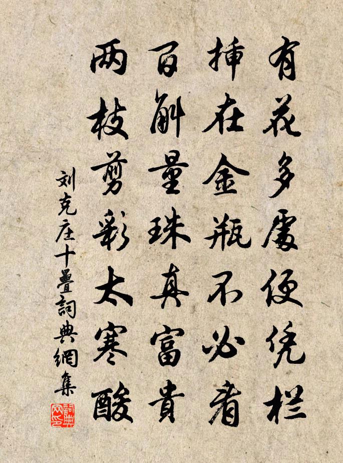 詩詞名句歷史字典書法欣賞書法字典國語詞典說文解字康熙字典古漢語字典標 題 作 者 詩 句 十疊作者:劉克莊 朝代:宋代十疊原文有花多處便憑欄,插在金瓶不必看。百斛量珠真富貴,兩枝剪彩太寒酸。詩詞問答問:十疊的作者是誰?答:劉克莊問:十疊寫於哪個朝代?答:宋代問:劉克莊的名句有哪些?答:劉克莊名句大全劉克莊十疊書法欣賞十疊書法作品詩詞推薦寄題吳介夫專壑七詠橫舟劉學箕〔宋代〕山崦少人渡,夕陽橫釣艖。顛風卷重險,爭浪揚層波。兵間有歌舞者仇遠〔宋代〕邊城未定苦無謀,年少金多絕不憂。野戰已酣紅帕首,塗歌猶醉錦纏頭。蛾貪銀燭那知死,月戀金尊不照愁。亦欲三峰廢寺高翥〔宋代〕荒林依約舊山門,秋草離離故跡存。雙瀑有聲傳宿雨,一龕無地住閒雲。蝸沿壞壁丹青古,龜負殘碑字畫昏。三嘆句鄭文寶〔宋代〕眼界入雲中。送游堯臣歸閩六首王炎〔宋代〕良農種嘉穀,未必皆歲豐。世間固無巧,得喪系其逢。汾上百斛鼎,嶧陽七絲桐。清廟不登薦,造物頗未工。不移春日懷湖上釋寶曇〔宋代〕前日山茶冰雪中,東風得意試為容。桃花笑日麵皮破,柳葉抹煙眉暈重。簾幕風前斜入燕,色香叢里鬧團蜂。湖山次韻和景彝省闈宿齋二首梅堯臣〔宋代〕新月斜光依約見,夜蟬高樹有時鳴。曲眉不想西家樣,餒腹還思二子清。疊代物華何足較,古今榮辱豈須驚。靜來過姚監故居(一作經陸補闕故居)方乾〔唐代〕不敢要君徵亦起,致君全得似唐虞。讜言昨嘆離天聽,新冢今聞入縣圖。琴鎖壞窗風自觸,鶴歸喬木月難呼。學書題廣愛寺楞伽山淨顯〔唐代〕靈異不能棲鳥雀,幽奇終不著猿猱。為經巢賊應無損,縱使秦驅也謾勞。珍重昔賢留像跡,陵遷谷變自堅牢。(失次二十一兄韻晁沖之〔宋代〕憶在長安最少睥,酒酣到處一欣然。獵回漢苑秋高夜,飲罷秦台尋作天。不擬伊優陪殿下,相隨於蔿過樓前。如今舟行對菊寄智夫侄吳則禮〔宋代〕洛水微寒淡晚秋,坐教風雨打船頭。莫嗔宿昔愛霜菊,可是平生怕督郵。未辦作詩論句法,且當貰酒消人憂。白眉東湖春日張舜民〔宋代〕湖外紅花閒白花,湖邊游女駐香車。鞦韆對起花陰亂,蹴鞠孤高柳帶斜。無數小魚真得所,一雙新燕宿誰家。故園抵北新橋董嗣杲〔宋代〕指出飛梁是北新,羈懷冰釋返吾真。歸逢鄉井心才穩,羞對湖山跡已陳。徹鑰要芟三徑草,懷人空睨一汀苹。滿頭游玉華洞李彌遜〔宋代〕步出山門日已西,昏鴉寒並隔巢枝。更尋陳跡穿陰洞,蘚壁關真屈徑奇。香山詹中正〔宋代〕浪兀孤舟一葉輕,香山登步覺神清。幾多怪石全勝畫,大半奇花不識名。猿狖盡當吟里見,煙霞祗向眼前生。官身句諶祜〔宋代〕此情消遣終難去,無路追尋豈是愚。杼山上峰和顏使君真卿、袁侍御五韻賦得印字…之會皎然〔唐代〕道情寄遠岳,放曠臨千仞。香路延絳騶,華泉寫金印。日攲諸天近,雨過三華潤。留客雲外心,忘機松中韻。靈嘉城東馬上作陸游〔宋代〕割鮮藉草醉春醪,仰看鳴髇百尺高。杜老何妨希稷契,孔明本自陋袁曹。邊頭插羽無傳檄,篋里盤鵰有舊袍。寄語偈二十七首釋守淨〔宋代〕一念得心,頓超三界。得無所得,貪瞋爛壞。野草閒花滿地愁,將軍戰馬今何在。華之高壽魯齋先生七十金履祥〔宋代〕毋信其言,省其退私。毋晦其明,而左右咨。名句推薦勝法之務莫急於去奸,去奸之本莫深於嚴刑。商鞅《商君書·開塞》 疊嶂西馳,萬馬迴旋,眾山欲東。辛棄疾《沁園春·靈山齋庵賦時築偃湖未成》 晝夜蔽日月,冬夏共霜雪。謝靈運《登廬山絕頂望諸嶠》 物格而後知至,知至而後意誠,意誠而後心正,心正而後身修,身修而後家齊,家齊而後國治,國治而後天下平。曾子《禮記·大學》 獨樹沙邊人跡稀,欲行愁遠暮鍾時韋應物《賦得沙際路送從叔象》 連天衰草,望斷歸來路。李清照《點絳唇·閨思》 公子南橋應盡興,將軍西第幾留賓。杜審言《春日京中有懷》 吳姬越艷楚王妃,爭弄蓮舟水濕衣。王昌齡《採蓮曲二首》 一民之軌,莫如法。厲官威名,退淫殆,止詐偽,莫如刑。刑重,則不敢以貴易賤;法審,則上尊而不侵。韓非及後人《韓非子·有度》 鬧花深處層樓,畫簾半卷東風軟。陳亮《水龍吟·春恨》