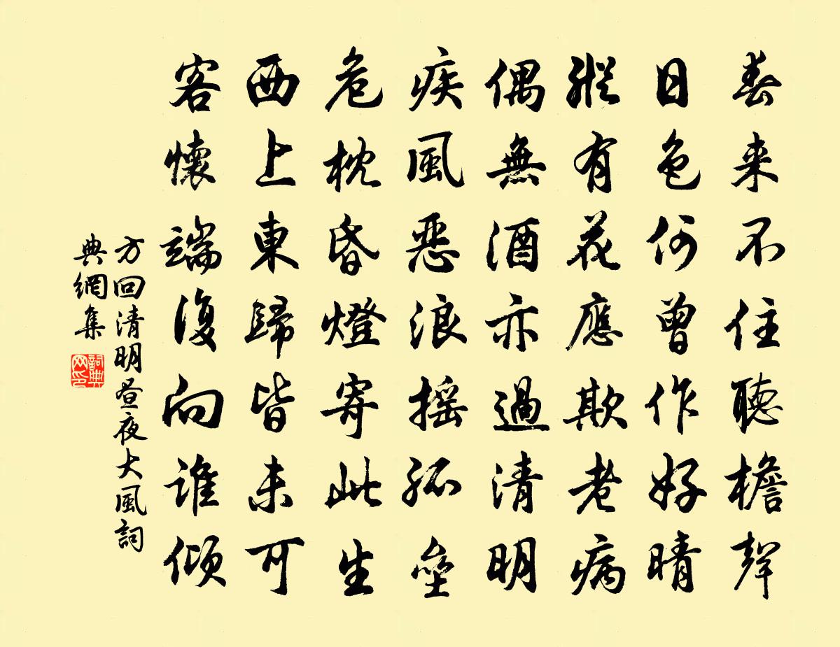 詩詞名句歷史字典書法欣賞書法字典國語詞典說文解字康熙字典古漢語字典標 題 作 者 詩 句 清明晝夜大風作者:方回 朝代:宋代清明晝夜大風原文春來不住聽檐聲,日色何曾作好晴。縱有花應欺老病,偶無酒亦過清明。疾風惡浪搖孤壘,危枕昏燈寄此生。西上東歸皆未可,客懷端復向誰傾。詩詞問答問:清明晝夜大風的作者是誰?答:方回問:清明晝夜大風寫於哪個朝代?答:宋代方回清明晝夜大風書法欣賞清明晝夜大風書法作品詩詞推薦大功不宰釋智愚〔宋代〕碧玉溪頭黃葉村,不聞花鳥以籬門。憨眠似覺底時節,山月半規新葉痕。龍隱岩張田〔宋代〕龍隱晦冥時莫考,龍驤拿攫跡堪驚。孔明久臥養全德,老子忽飛歸太清。溪上一天常氣勝,洞中六月自寒生。至人次韻楊廷秀待制二首周必大〔宋代〕官府新辭上界仙,碧瑤沿口晉桃源。默存常在清都境,歸去休蕪靖節園。為問隆樓並傑閣,何如易野及平原。明年白田獺魅別村女詩佚名〔唐代〕潮來逐潮上,潮落在空灘。有來終有去,情易復情難。腸斷腸中子,明月秋江寒。和任宰元紹見寄十首以歸來問信湖山撫摩松菊吳芾〔宋代〕開門無一事,終日飽看山。石罅鳴流水,翻驚響佩環。送僧周賀〔唐代〕草履初登南客船,銅瓶猶貯北山泉。衡陽舊寺秋歸去,門鎖寒潭幾樹蟬。禪人並化主寫真求贊釋正覺〔宋代〕千年氣溫,琥珀松根。半夜光吞,珊瑚月魂。混沌鑿開,德雲下妙峰之頂;崑崙推倒,張騫到盟津之源。出岫之雲雨土林景熙〔宋代〕豐凶不可問,疑入瘴鄉春。高漢枯無潤,剛風吹作塵。園林霜後色,樵牧霧中身。四望荒荒白,誰為洗日人。留侯廟范成大〔宋代〕功成輕舉信良謀,心與鴟夷共一舟。呂媼區區無鳥喙,先生輕負赤松游。二十三日雨中發贛州趙蕃〔宋代〕江流何湯湯,萬里勢方注。僮奴勸乘舟,期至才旦莫。我聞是江石,屹立甚可怖。水乾或能避,水漲多與忤。卒行題四皓廟四首邵雍〔宋代〕田橫入海猶能得,商至長安百里強。能使四人成美節,始知高祖是真王。改祭修齋決疑頌釋遵式〔宋代〕正信天龍護,邪神豈奈何。但知常念佛,災怪自消磨。閻子常求琴弦晁補之〔宋代〕先生三尺琴,斷絕弦上音。欲求鳳喙膠,弱水毛猶沉。呈可齋先生陳侍郎宋伯仁〔宋代〕男兒心事少陵詩,不與英雄說又誰。衰鬢未甘無用處,壯懷圖見太平時。休慚夜雨挑寒灺,喜聽春枰改舊棋。一信和汪正夫梅鄭獬〔宋代〕少陵老杜獨憐才,長句還如鐵馬來。酒味漸佳春漸好,苦教陸凱詠寒梅。訴衷情沈蔚〔宋代〕深深院宇小池塘。一徑碧梧長。青春又歸何處,新筍綠成行。多少事,惱人腸。懶思量。香消一炷,睡起霎時,日偈頌一百零四首釋紹曇〔宋代〕半夜客船鐘,漁火愁眠省。不見老寒山,淚濕吳雲冷。幽鳥啼霜月影斜,野橋楓葉翻紅錦。擊碎重關,枯山未泯。中秋前一夕玩月楊萬里〔宋代〕月擬來宵好,吾先今夕遭。繒外半壁許,已復一輪高。遷坐明相就,群飛影得逃。望秋惟有此,徹夜敢辭勞。潭州留別常建〔唐代〕賢達不相識,偶然交已深。宿帆謁郡佐,悵別依禪林。湘水流入海,楚雲千里心。望君杉松夜,山月清猿吟。送莫甥兼諸昆弟從韓司馬入西軍孟浩然〔唐代〕念爾習詩禮,未曾嘗戶庭。平生早偏露,萬里更飄零。坐棄三冬業,行觀八陣形。飾裝辭故里,謀策赴邊庭。壯志名句推薦惟上惟己,去表求實,奸者自見矣。來俊臣《羅織經·察奸卷第八》 治大者不治細,成大功者不成小列子及其弟子《列子·楊朱》 畫船兒天邊至,酒旗兒風外颭。張養浩《水仙子·詠江南》 芙蓉金菊斗馨香。天氣欲重陽。晏殊《訴衷情·芙蓉金菊斗馨香》 無有定法如來可說。鳩摩羅什譯《金剛經·無得無說》 淚眼問花花不語,亂紅飛過鞦韆去。歐陽修《蝶戀花·庭院深深深幾許》 只在此山中,雲深不知處。賈島《尋隱者不遇 / 孫革訪羊尊師詩》 重九開秋節,得一動宸儀。韋安石《奉和九日幸臨渭亭登高應制得枝字》 一葉葉,一聲聲,空階滴到明。溫庭筠《更漏子·玉爐香》 武皇去金閣,英威長寂寞江淹《銅爵妓》