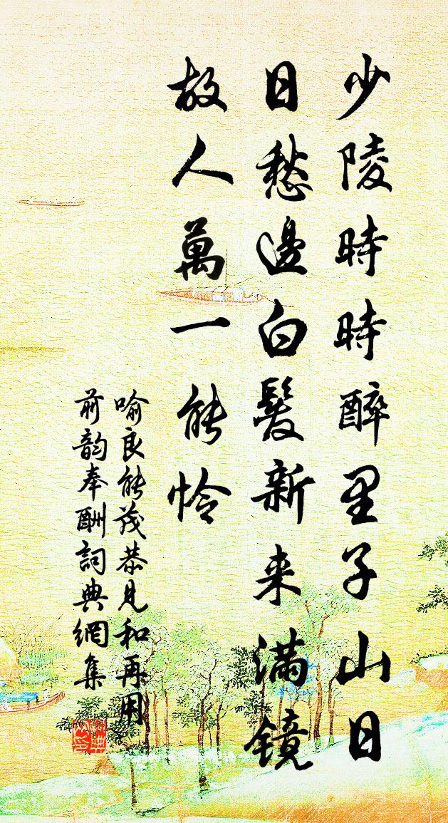 詩詞名句歷史字典書法欣賞書法字典國語詞典說文解字康熙字典古漢語字典標 題 作 者 詩 句 茂恭見和再用前韻奉酬作者:喻良能 朝代:宋代茂恭見和再用前韻奉酬原文少陵時時醉里,子山日日愁邊。白髮新來滿鏡,故人萬一能憐。詩詞問答問:茂恭見和再用前韻奉酬的作者是誰?答:喻良能問:茂恭見和再用前韻奉酬寫於哪個朝代?答:宋代喻良能茂恭見和再用前韻奉酬書法欣賞茂恭見和再用前韻奉酬書法作品詩詞推薦寶鼎現(壽京尹曾留遠侍郎淵子)陳著〔宋代〕玉宸凝眷。要得培□,神皋根本。天賦與、經綸好手,門外紅塵談笑遣。任草色、遍空庭交翠,月往風來自便。但送吳提刑赴召三首趙蕃〔宋代〕擁節西來歲未更,提封略已遍循行。洞庭青草絕余寇,沅水武谿俱力耕。勿漫繡衣閒直指,正應天下急澄清。治平宋借南苑孫元晏〔唐代〕人主詞應不偶然,幾人曾說笑掀天。不知南苑今何在,借與張公三百年。聞車駕幸金陵二首郭印〔宋代〕強敵憑後極,神天亦惡盈。一人知順動,四海望親征。劍戟披霜利,壺漿夾道迎。此行如破竹,不戰復三京。揚雄二首王安石〔宋代〕子云平生人莫知,知者乃獨稱其辭。今尊子云者皆是,得子云心亦無幾。聖賢樹立自有師,人知不知無以為。俗人社日風雨病酒方回〔宋代〕匆匆社燕時,此況豈前知。道左家書斷,春蒸客舍卑。醉成難治病,悶賦不工詩。塊臥聽風雨,吾兒亦見思。三界蘇泂〔宋代〕地屬元三令,風回更幅蒲。櫓聲欹枕里,燈影到家初。稍覺身何有,行當夢亦無。平生不耕食,五斗欲誰辜。社日戲題呈任副樞晏殊〔宋代〕開樽幸有治聾醞,把葉能無送燕章。所惜近停司飲會,不如村叟醉秋光。奉送閻醇老推官陳師道〔宋代〕古今猶異俗,鄒魯尚多儒。簿領三年責,雲霄一武趨。數過忘潦倒,惜別更斯須。說與晁夫子,今年錐也無。再次王宰簿喜雨聊句韻史彌寧〔宋代〕旱魃重為妖,點雨如點血。一念神所矜,蜚廉變騷屑。靈螭卷天河,千里洗袢熱。二妙喜欲顛,鎢豪賡白雪。雲煙鵲橋仙(七夕)向子諲〔宋代〕澄江如練,遠山橫翠,一段風煙如畫。層樓傑閣倚晴空,疑便是、支磯石下。寶奩瓊鑒,淡勻輕掃,縴手弄妝初罷贈苕上隱者武衍〔宋代〕夾溪槐柳綠雲堆,轍跡何嘗到碧苔。不種桃花緣底事,恐因流水悞人來。和滕丞元秀韻徐僑〔宋代〕秋期載酒子云居,春柳還驚綠映渠。幾欲出門阻風雨,半因居幕困文書。自違清隱三時久,空擬憂懷一日舒。想見和疊山送淮安士友韻王奕〔宋代〕金台去棹倚雲開,和餞諸詩已罄懷。行計竟為尊魯出,櫓聲相逐過江來。定逢歸旆榮桑里,豈料危機伏茗杯。願梓句呂殊〔宋代〕遊子驚車破,農人念稼傷。感事十詩上李侍郎陳造〔宋代〕長松倚絕壑,高蘿 * 之。蒼山屹半空,白雲相因依。揮策馬不前,自問此何時。聖賢運化樞,奇髦各騖馳。躑躅呈鍾子嚴華岳〔宋代〕那條路不通長安,莫把心腸獨自剜。有釀何須兒索飲,無餚徒勸客加餐。千金不賞思歸楚,萬戶無封願識韓。大抵題寺壁馮京〔宋代〕韓信棲遲項羽窮,手提長劍喝秋風。吁嗟天下蒼生眼,不識男兒未濟中。秋懷四錫〔宋代〕蒹葭深處古嚴州,吟向潺湲為送秋。雲映疏鍾紅葉寺,浪搖孤角翠微樓。土茅路遠催先貢,霜稻天晴趁早收。零落代徐思遠謝張季萬王洋〔宋代〕淳風嘆遼遠,友道傷澆漓。交情比一線,斷續同軒縻。仁惇既難事,義重亦不支。寒谷少溫律,衡門自寒扉。亦聞名句推薦淡泊以明志,寧靜而致遠。羅貫中《三國演義·第三十七回》 人生貴得適意爾,何能羈宦數千里以要名爵!劉義慶《世說新語·識鑒》 鶯啼燕語報新年,馬邑龍堆路幾千。皇甫冉《春思》 人生天地間,忽如遠行客。佚名《青青陵上柏》 螣蛇無足而飛,梧鼠五技而窮。荀子《荀子·勸學》 昨夜風開露井桃,未央前殿月輪高。王昌齡《 * 曲》 我今因病魂顛倒,唯夢閒人不夢君。元稹《酬樂天頻夢微之》 百川東到海,何時復西歸?佚名《長歌行》 風送梅花過小橋,飄飄。趙顯宏《晝夜樂·冬》 春田龜坼苗不滋,猶賴立春三日雪。王士禎《春不雨》