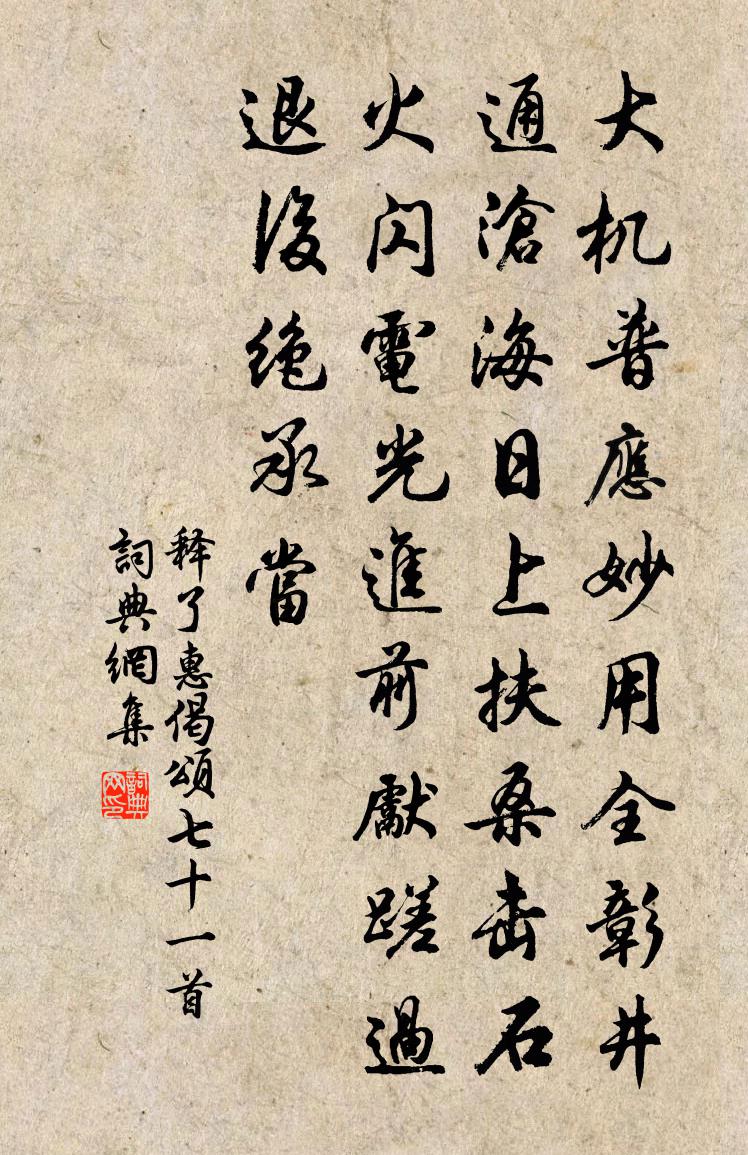 詩詞名句歷史字典書法欣賞書法字典國語詞典說文解字康熙字典古漢語字典標 題 作 者 詩 句 偈頌七十一首作者:釋了惠 朝代:宋代偈頌七十一首原文大機普應,妙用全彰。井通滄海,日上扶桑。擊石火,閃電光。進前先蹉過,退後絕承當。詩詞問答問:偈頌七十一首的作者是誰?答:釋了惠問:偈頌七十一首寫於哪個朝代?答:宋代釋了惠偈頌七十一首書法欣賞偈頌七十一首書法作品詩詞推薦送僧歸護國寺王化基〔宋代〕振錫詣華京,頻頻答龍靈。玉階前見佛,金口內開經。論道窮幽賾,深玄極杳冥。褒崇恩爛熳,教化語丁寧。傳和滿江紅(吳山)汪元量〔宋代〕一霎浮雲,都掩盡、日無光色。遙望處、浮圖對峙,梵王新闕。燕子自飛關北外,楊花閒度樓西側。慨金鞍、玉勒書延福寺壁朱岩伯〔宋代〕雙瀑飛來古寺西,月蘿菸草久湮迷。自從吾輩經行後,便覺他山索價低。老去合為三徑計,就中聊借一枝棲。石崖田家語梅堯臣〔宋代〕誰道田家樂?春稅秋未足!里胥扣我門,日夕苦煎促。盛夏流潦多,白水高於屋。水既害我菽,蝗又食我粟。前月冬狩行四韻連句應詔詩庾信〔南北朝〕三川羽檄馳。六郡良家選。觀兵細柳城。校獵長楊苑。驚雉逐鷹飛。騰猿看箭轉。鳴笳河曲還。猶憶南皮返。暮雨既霽,將兒輩登多稼亭楊萬里〔宋代〕一霎滂池一霎晴,檐間點滴尚殘聲。水將樹影亂揉碎,月與日光相對明。試數六霄還五兩,坐令夏熱作秋清。兒曹江城子(贈次膺叔家娉娉)晁補之〔宋代〕娉娉聞道似輕盈。好佳名。也堪稱。楚觀雲歸,重見小樊驚。豆蔻梢頭春尚淺,嬌未顧,已傾城。章台休詠舊青青虛禪人發心丐田釋正覺〔宋代〕虛廓襟懷作丐游,機緣處處定相投。開田大義聊舒手,得意忘言暗點頭。白牯耕回山月曉,金刀煎斷野雲秋。長連宿欒城驛卻寄常山張書記杜荀鶴〔唐代〕一更更盡到三更,吟破離心句不成。數樹秋風滿庭月,憶君時復下階行。村飲陸游〔宋代〕不來東舍即西家,野老逢迎一笑嘩。試說暮年如意事,細傾村釀聽私蛙。朝中措朱敦儒〔宋代〕紅稀綠暗掩重門。芳徑罷追尋。已是老於前歲,那堪窮似他人。一杯自勸,江湖倦客,風雨殘春。不是酴醿相伴,搗練子 贈張無塵先生馬鈺〔元代〕擒雲馬,縱雲驂。行歌蹈舞放婪耽。任傍人,笑我憨。明六六,悟三三。三三六六味香甘。廣收拾,不屬貪。海上作宋務光〔唐代〕曠哉潮汐池,大矣乾坤力。浩浩去無際,沄沄深不測。崩騰翕眾流,泱漭環中國。鱗介錯殊品,氛霞饒詭色。天波芙蓉二絕劉克莊〔宋代〕湖上秋風起櫂歌,萬株映柳更依荷。老來不作繁華夢,一樹池邊已覺多。自江陵之徐州路上寄兄弟白居易〔唐代〕岐路南將北,離憂弟與兄。關河千里別,風雪一身行。夕宿勞鄉夢,晨裝慘旅情。家貧憂後事,日短念前程。煙雁飲李氏園三首黃庭堅〔宋代〕手挼紅杏醉繁香,回首春前夢一場。便與經營百船酒,再來應是菊花黃。李仁父寄茯苓酥賦長句謝之張栻〔宋代〕岷峨山中千歲松,枝虬乾直摩青空。雪霜剝落中不槁,膏液下與靈泉通。龜跧鳧伏自磊碕,金堅玉潔仍豐融。篝明山居雜詩九十首曹勛〔宋代〕從昔漫浪心,家居意不適。晨圾香火余,飯了辦遊歷。或訪僧掇齋,或隱者對奕。歸來任侵燈,龍吟噴霜笛。中秋月廖凝〔唐代〕九十日秋色,今宵已半分。孤光含列宿,四面絕纖雲。眾木排疏影,寒流疊細紋。遙遙望丹桂,心緒正紛紛。懷歸趙善漣〔宋代〕遊子何時返,家山萬里余。望雲愁思切,對月賞心疏。相嚴煩龜卜,頻逢絕雁書。浮名在京國,系我欲如何。名句推薦往者不可諫,來者猶可追。孔子弟子《論語·微子篇》 家在夢中何日到,春來江上幾人還?盧綸《長安春望》 未必素娥無悵恨,玉蟾清冷桂花孤。晏殊《中秋月》 翠華想像空山里,玉殿虛無野寺中。杜甫《詠懷古蹟五首·其四》 荊州麥熟繭成蛾,繰絲憶君頭緒多。李白《荊州歌》 招魂楚些何嗟及,山鬼暗啼風雨。元好問《摸魚兒·雁丘詞 / 邁陂塘》 欲知卻老延齡藥,百草摧時始起花。蘇軾《趙昌寒菊》 去年夜半橫江夢,倚危檣,參差曾賦劉辰翁《桂枝香· * 人去》 今日聽君歌一曲,暫憑杯酒長精神。劉禹錫《酬樂天揚州初逢席上見贈》 不看僧面看佛面。吳承恩《西遊記·第三十一回》