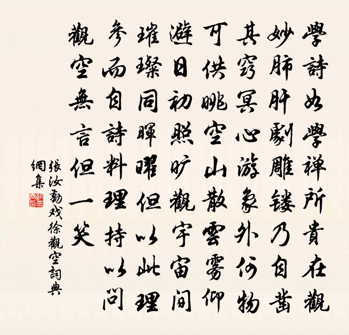 詩詞名句歷史字典書法欣賞書法字典國語詞典說文解字康熙字典古漢語字典標 題 作 者 詩 句 戲徐觀空作者:張汝勤 朝代:宋代戲徐觀空原文學詩如學禪,所貴在觀妙。肺肝劇雕鏤,乃自鑿其竅。冥心游象外,何物可供眺。空山散雲霧,仰避日初照。曠觀宇宙間,璀璨同暉曜。但以此理參,而自詩料理。持以問觀空,無言但一笑。詩詞問答問:戲徐觀空的作者是誰?答:張汝勤問:戲徐觀空寫於哪個朝代?答:宋代張汝勤戲徐觀空書法欣賞戲徐觀空書法作品詩詞推薦題滑州廨李淑〔宋代〕滑守如今是世官,阿戎出守自金鑾。郡人莫訝留題別,孫息期同住此看。題樊氏樓壁王灼〔宋代〕老秋氣已嚴,今日稍晴和。登君樓西翼,相對一酣歌。邊烽照仙關,大將方枕戈。吾儕無志用,心懾鬢先皤。強促偶然作貫休〔唐代〕蟬聲引出石中蛩,寂寞門扃葉數重。誰道思山心不切,等閒盡出兩三峰。送胡聖聞入太學楊萬里〔宋代〕春風吹開孝廉船,撞星犯斗上九天。夜書細字燈前月,朝茹寒虀瓮中雪。何蕃省親間一歸,陸暢擢第各一時。此行雜興四首林逋〔宋代〕掉臂何妨入隱淪,高賢應總貴全真。次山有以稱聱叟,魯望兼之傳散人。拂水遠天孤榜晚,夾村微雨一犁春。不知謝人惠筆邵雍〔宋代〕愛重寄文房,殷勤謝遠將。兔毫剛且健,筠管直而長。靜錄新詩藁,閒抄舊藥方。自餘無所用,足以養鋒鋩。雜題二首司空圖〔唐代〕棋局長攜上釣船,殺中棋殺勝絲牽。洪爐任鑄千鈞鼎,只在磻溪一縷懸。曉鏡高窗氣象深,自憐清格笑塵心。世間邯鄲主人王建〔唐代〕遠客無主人,夜投邯鄲市。飛蛾繞殘燭,半夜人醉起。壚邊酒家女,遺我緗綺被。合成雙鳳花,宛轉不相離。縱令江南逢李龜年杜甫〔唐代〕岐王宅里尋常見,崔九堂前幾度聞。正是江南好風景,落花時節又逢君。送姚宰任吉州安福縣(一作送王明府之任安福)無可〔唐代〕落絮滿衣裳,攜琴問酒鄉。掛帆南入楚,到縣半浮湘。吏散翠禽下,庭閒斑竹長。人安宜遠泛,沙上蕙蘭香。題畫冬景李用〔宋代〕冬嶺秀孤松,松枝傲霜雪。不同桃李春,永抱歲寒節。宮詞宋白〔宋代〕繡騎前驅盡國娃,芳園初看牡丹花。千官狼狽如蜂蝶,迴避楊妃七寶車。雜劇·孟德耀舉案齊眉佚名〔元代〕第一折(外扮孟府尹同老旦王夫人領家僮上。詩云)白髮刁騷兩鬢侵,老來灰卻少年心。不思再請皇家俸,但得身投周益公三首王阮〔宋代〕有錦雖當晝,無心侈賜銘。筇拖雲際綠,箬戴雨中青。國老甘鄉老,台星復客星。不須添入畫,麟閣自圖形。題徐無競所藏花光仁老墨梅林表民〔宋代〕江路冥迷飛霰密,道人定起幽情逸。忽邀龍子幻新妝,粉淡香乾春一筆。寒梢瘦著苔衣昏,壞色空留夢裡身。幾回石州慢(和趙見獨書事,見獨善鼓琴)王之道〔宋代〕天迥樓高,日長院靜,琴聲幽咽。昵昵恩情,切切言語,似傷離別。子期何處,漫高山流水,又逐新聲徹。仿佛江奉和滁州九詠九首班春亭曾鞏〔宋代〕山亭嘗自絕浮埃,山路輝光五馬來。春滿人間不知主,誰言爐冶此中開。宿嚴陵權德輿〔唐代〕身羈從事驅征傳,江入新安泛暮濤。今夜子陵灘下泊,自慚相去九牛毛。王立之承奉詩報梅花已落盡次韻戲答黃庭堅〔宋代〕南枝北枝春事休,愉錢可穿柳帶柔。定是沈郎作詩瘦,不應春能生許愁。乙酉歲游浙中道聞盜起霅川遂寓珠溪方岳〔宋代〕未到山陰興已闌,相傳道路正間關。故人坐隔月千里,老宿肯分雲半間。有客誰家無白酒,能詩何處不青山。一聲名句推薦沙岸菊開花,霜枝果垂實。崔元翰《奉和聖制重陽旦日百寮曲江宴示懷》 惟順於父母,可以解憂。孟子《孟子·萬章章句上·第一節》 燈前目力雖非昔,猶課蠅頭二萬言。陸游《讀書》 寺憶曾游處,橋憐再渡時。杜甫《後游》 月明船笛參差起,風定池蓮自在香。秦觀《納涼》 野花不種年年有,煩惱無根日日生。馮夢龍《警世通言·卷二十》 梅花雪,梨花月,總相思。張惠言《相見歡·年年負卻花期》 思歸未可得,書此謝情人。李白《送郄昂謫巴中》 有緣千里來相會,無緣對面不相逢。施耐庵《水滸傳·第十四回》 天子之怒,伏屍百萬,流血千里。劉向《戰國策·魏四·秦王使人謂安陵君》