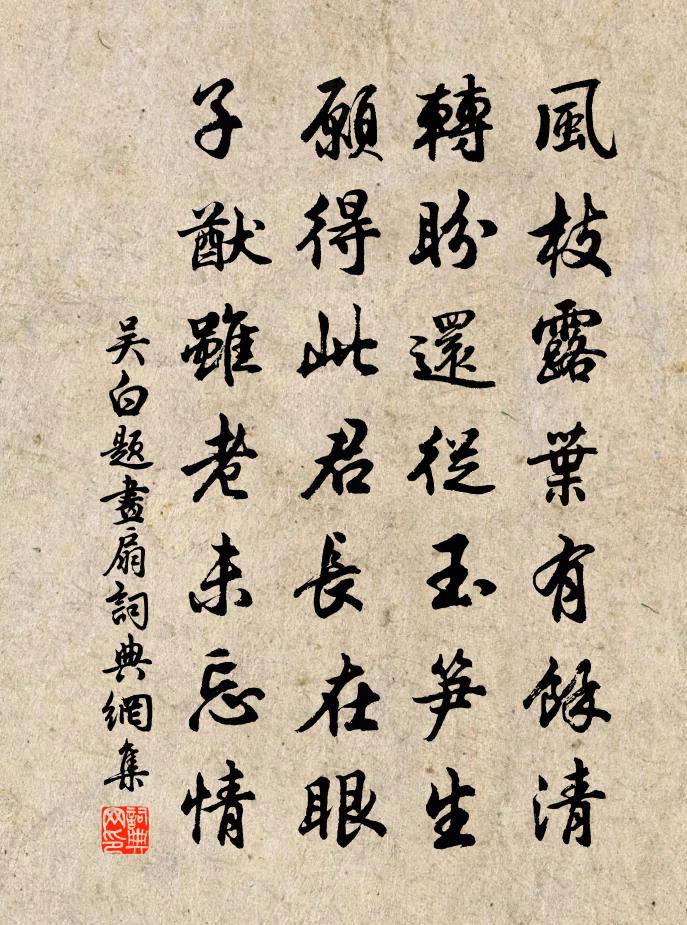 詩詞名句歷史字典書法欣賞書法字典國語詞典說文解字康熙字典古漢語字典標 題 作 者 詩 句 題畫扇作者:吳白 朝代:宋代題畫扇原文風枝露葉有餘清,轉盼還從玉筍生。願得此君長在眼,子猷雖老未忘情。詩詞問答問:題畫扇的作者是誰?答:吳白問:題畫扇寫於哪個朝代?答:宋代吳白題畫扇書法欣賞題畫扇書法作品詩詞推薦石過青渠壁間有何人者詩欲梓潼神君戒殺以從李石〔宋代〕香茗粗蔬肯破慳,相公日食萬羊山。夫君何厚神何薄,自取懸鶉一水間。和汪正夫梅鄭獬〔宋代〕好花賦與本天才,料得靈根天上來。應為長安惡風土,故教北地不栽梅。楓橋寺小憩程公許〔宋代〕雲已安排雪,天仍慘澹風。纜船投古剎,撥火共談空。初夏閒居陸游〔宋代〕野水楓林久寄家,慣將枯淡作生涯。小樓有月聽吹笛,深院無風看磑茶。靜岸葛巾穿薈蔚,閒拖筇杖入谽谺。平居即事六言四首劉克莊〔宋代〕早詠白駒在谷,晚駕青牛出關。寧為魚點墨退,猶勝鶴帶箭還。答門生王渙李德鄰趙光胤王拯長句(一作裴贄詩)孫偓〔唐代〕謬持文柄得時賢,粉署清華次第遷。昔歲策名皆健筆,今朝稱職並同年。各懷器業寧推讓,俱上青霄肯後先。何事病中二首方左鉞〔宋代〕日費行將典到琴,窮愁那復病相侵。倩人合藥無真料,就枕吟詩苦見心。仆獻奇方單用草,醫言速效莫如參。池亭賦張袁州隱齋三首度正〔宋代〕齊王非愛牛,厲人非愛子。秉彝未殄滅,生意不可已。儻能克其端,萬物均一體。胡為隔形骸,強自分彼此。達人呈里中諸友文同〔宋代〕君莫怪我不讀書,君莫笑我不飲酒。更精文史豈足用,漸老歡娛復何有。負郭安得二百畝,舉家已聚三十口。且來大觀宗祀明堂五首佚名〔宋代〕若昔大南,孝思維則。永言孝思,丕承其德。於昭明威,侑於上帝。麥我思成,永綏福祉。敝俗宋祁〔宋代〕陶姚民屋富,梁魏敝風存。士闕游鄉校,人爭倚市門。椎埋時結客,博掩競成喧。誰與遷荼堇,移甘朊朊原。淮南早春風雨連日俗以為宜宋庠〔宋代〕淮海歲方新,層陰便浹辰。山山能作雨,物物解呈春。野鳥千聲異。江蕪一色勻。農區田溜滿,偏慰守藩臣。題天慶觀碧玉堂龔準〔宋代〕清曉叩玄關,憂時鬢已斑。何如閒道士,隔竹看君山。送李中丞赴楚州劉禹錫〔唐代〕緹騎朱旗入楚城,士林皆賀振家聲。兒童但喜迎賓守,故吏猶應記姓名。萬頃水田連郭秀,四時煙月映淮清。憶君贈南回了豐上人三首張嵲〔宋代〕雙頰朱丹雪染眉,終朝一飯便無為。庭前柏是初年種,今見森森合抱時。義士行貫休〔唐代〕先生先生不可遇,愛平不平眉斗豎。黃昏雨雹空似黳,別我不知何處去。渦口梅堯臣〔宋代〕秋水見灘底,淺沙交浪痕。白魚跳處急,宿雁下時昏。帶月入渦尾,落帆防石根。清淮行未盡,明日又前村。謝元道惠桂樹子韓維〔宋代〕洛陽奇卉兼四方,妖姿冶艷爭春陽。蔚然幽佳獨凌霜,中岩無人閟寒芳。山翁軍搜劚青蒼,名園得之為輝光。護以訪琳老題溪上小軒毛滂〔宋代〕小檻閒風物,高僧秀肺腸。隔溪通竹色,開戶納山光。撥雪晨蔬瘦,燒松午茗香。淵明歸賦急,聊復此徜徉。判府曹宣徽生日朱長文〔唐代〕星杓指未月增弦,神選良時協半千。恭慎動遵長樂意,法清能紹冀王賢。緩垂相印淹公論,堅請州符避劇權。四十名句推薦銅華滄海,愁霾重嶂,燕北雁南天外。吳文英《永遇樂·乙巳中秋風雨》 翻被梨花冷看,人生苦戀天涯。張炎《朝中措·清明時節》 烏啼隱楊花,君醉留妾家。李白《楊叛兒》 弟妹蕭條各何在,干戈衰謝兩相催!杜甫《九日五首·其一》 青山欲共高人語。聯翩萬馬來無數。辛棄疾《菩薩蠻·金陵賞心亭為葉丞相賦》 名聲若日月,功績如天地荀子《荀子·王霸》 莫道君行早,更有早行人。佚名《增廣賢文·上集》 遙憶獨眠人,早寒驚夢頻。顧貞觀《菩薩蠻·山城夜半催金柝》 麋鹿成群,虎豹避之;飛鳥成列,鷹鷲不擊劉向《說苑·雜言》 鼎湖流水清且閒,軒轅去時有弓劍,古人傳道留其間李白《飛龍引二首·其二》