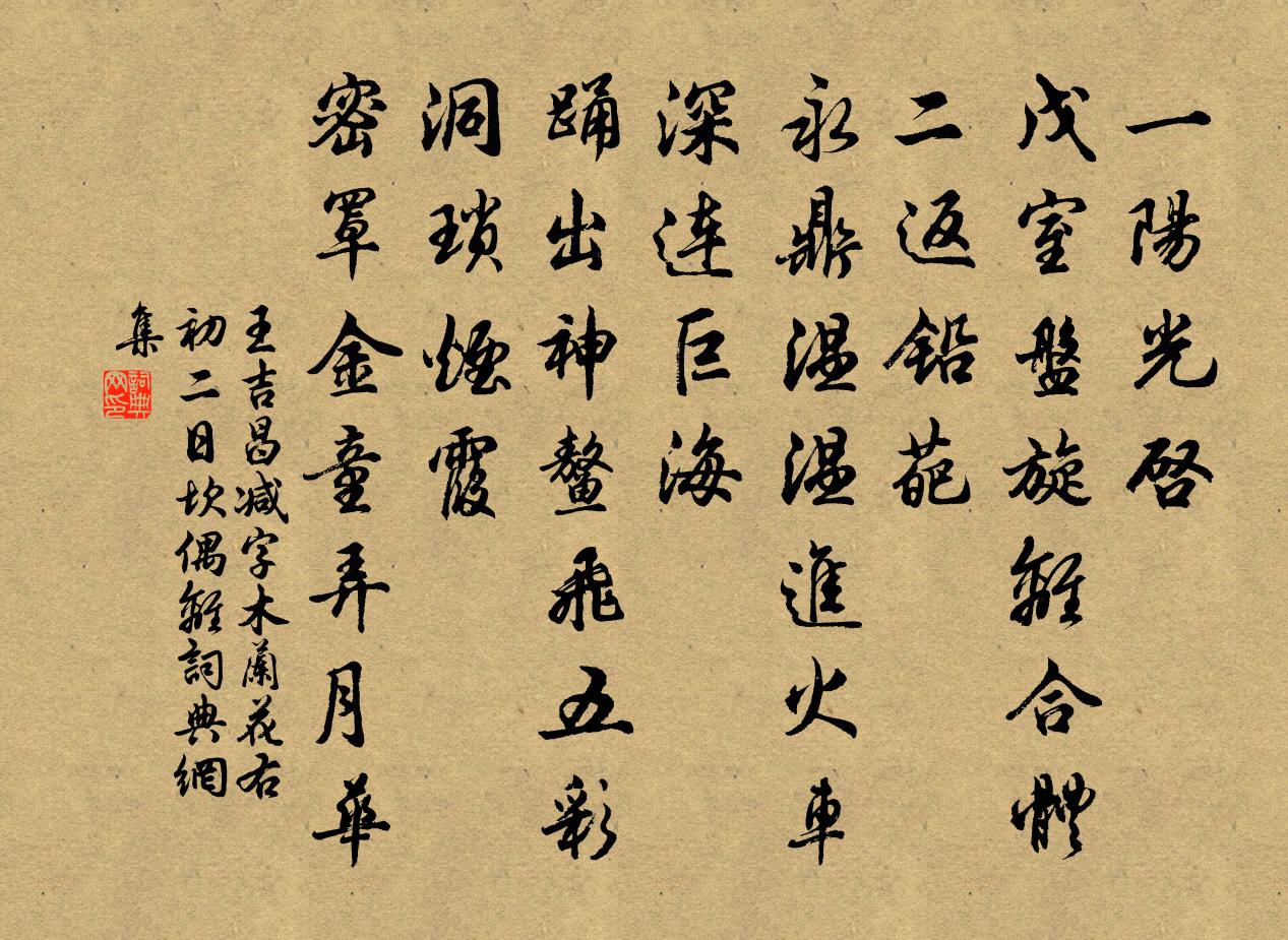 詩詞名句歷史字典書法欣賞書法字典國語詞典說文解字康熙字典古漢語字典標 題 作 者 詩 句 減字木蘭花 右初二日坎偶離作者:王吉昌 朝代:元代原文一陽光啟。戊室盤旋離合體。二返鉛葩。永鼎溫溫進火車。深連巨海。踴出神鰲飛五彩。洞瑣煙霞。密罩金童弄月華。詩詞問答問:《減字木蘭花 右初二日坎偶離》的作者是誰?答:王吉昌問:該詩寫於哪個朝代?答:元代問:該詩是什麼體裁?答:詞書法欣賞減字木蘭花 右初二日坎偶離書法作品詩詞推薦游棲賢祖無擇〔宋代〕偷得沈迷簿領身,暫來林下訪幽人。雲泉滿眼慵歸去,便擬拋官學隱淪。雜詠五言八首劉克莊〔宋代〕斷弦難續矣,讀者尚悲辛。不似窮馮衍,甘為薄倖人。江村散步曹彥約〔宋代〕已落無邊木,猶誅不盡茅。沙逃迎遠景,風力鬧寒稍。牧處高低路,漁時遠近郊。竹籬茅舍外,門閉可推敲。疥癬二首劉克莊〔宋代〕髮膚勿毀斯為孝,疥癬雖微至不仁。血氣衰無丹換骨,親朋疏恐癩傳人。裸裎懶對炎涼客,湯熨猶貪閃電身。臭腐再用前韻袁甫〔宋代〕逾年政化一無成,敢道民和獄論清。不以旁人評得失,個別一點自知明。初十日早起趙蕃〔宋代〕此風動地木欲折,雨既不成當作雪。黃昏側聽到雞鳴,才有飄蕭興騷屑。雖然風力猶未止,雨耶雪耶知孰是。幾將飯間戲作姜特立〔宋代〕平生無事業,只是養此腹。雖曰負將軍,念爾相隨逐。一朝我若行,枵然入空木。問爾將何之,無功難愛祿。偈傾一百六十九首釋智朋〔宋代〕人情濃厚道情微,道用人情世豈知。鹽鹹醋酸,阿誰不知。只要熟處放教生,生處放教熟。道用人情日久,自然打苔錢三首釋智圓〔宋代〕夷甫不言非爾類,魯褒為論偶同名。秋來自滿虛閒地,不用良工鼓鑄成。海上別薛舟戴叔倫〔唐代〕行旅悲搖落,風波厭別離。客程秋草遠,心事故人知。暮鳥翻江岸,征徒起路岐。自應無定所,還似欲相隨。溪居即事寄梵天闍梨釋智圓〔宋代〕松竹森森獨掩扉,塵中誰復愛忘機。蒼苔滿砌無人到,猶感幽禽夜夜歸。擬古八首陳普〔宋代〕人生不滿百,常懷千歲憂。往事雲雨散,積意如山丘。聖人已為土,土復成海流。曷為夢寐中,常見孔與周。句皇甫冉〔唐代〕微官同侍蒼龍闕,直諫偏推白馬生。(《寄李補闕》,出《詩式》)。送平禪人歸鄂渚釋正覺〔宋代〕浮舟春水作歸征,家有良田可飯羹。久客迴翔雲一點,舊巢臥看月三更。人猜我住尖頭屋,爾去誰扶折腳鐺。為問春日舟中書所見武衍〔宋代〕翠峰斜倚側金翹,羅帶縈紅罥碧桃。應是春愁禁不得,東風深院粉牆高。和康叔探梅韻三首袁說友〔宋代〕今年人憶去年梅,試問今年花已開。見說春風正料理,不應小雨便花摧。和人聞雁二首王珪〔唐代〕岑寂夜將半,一聲來枕前。無風起群籟,有月在中天。行子夢初斷,故鄉書未傳。不須聞別鶴,危涕已潸然。暮登四安寺鐘樓寄裴十迪杜甫〔唐代〕暮倚高樓對雪峰,僧來不語自鳴鐘。孤城返照紅將斂,近市浮煙翠且重。多病獨愁常闃寂,故人相見未從容。知君宮詞王仲修〔宋代〕殿閣新秋氣象清,玉階露冷半雕冥。六宮最重中元節,院院燒香讀道經。和張屯田秋晚靈峰東閣閒望文同〔宋代〕直欄橫絕紫微陰,憑久秋光照客襟。一道山川寒色遠,萬家煙火夕陽深。涇灘水落君鴉集,秦嶺雲高斷雁沉。此興名句推薦銜霜當路發,映雪擬寒開。何遜《詠早梅 / 揚州法曹梅花盛開》 想翠竹、碧梧風采,舊遊何處。張寧《滿江紅·題碧梧翠竹送李陽春》 欲治身,先治心;欲責人,先責己。宋濂、王褘《元史·列傳·卷二》 無邊落木蕭蕭下,不盡長江滾滾來。杜甫《登高》 宣父猶能畏後生,丈夫未可輕年少。李白《上李邕》 春去花還在,人來鳥不驚。王維《畫》 盡教春思亂如雲,莫管世情輕似絮晏幾道《玉樓春·雕鞍好為鶯花住》 聖人之行不同也,或遠或近,或去或不去,歸潔其身而已矣。孟子《孟子·萬章章句上·第七節》 十年生死兩茫茫,不思量,自難忘。蘇軾《江城子·乙卯正月二十日夜記夢》 滿載一船秋色,平鋪十里湖光。張孝祥《西江月·阻風山峰下》