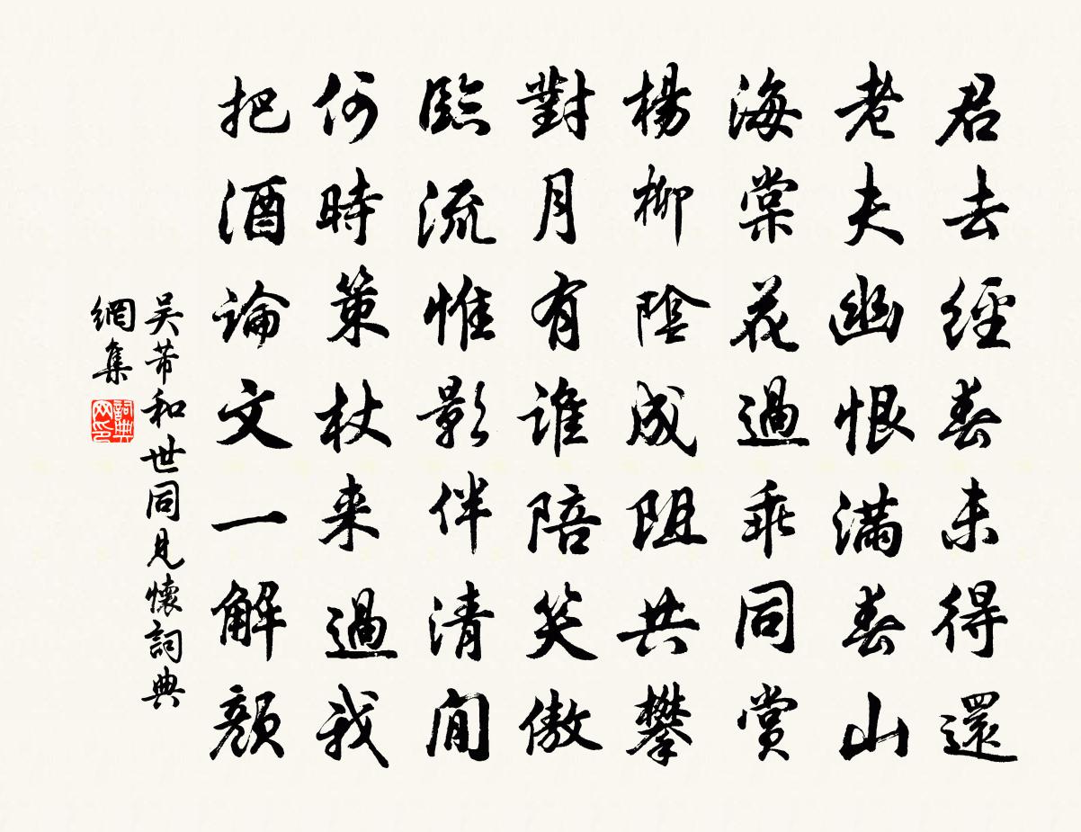 詩詞名句歷史字典書法欣賞書法字典國語詞典說文解字康熙字典古漢語字典標 題 作 者 詩 句 和世同見懷作者:吳芾 朝代:宋代和世同見懷原文君去經春未得還,老夫幽恨滿春山。海棠花過乖同賞,楊柳陰成阻共攀。對月有誰陪笑傲,臨流惟影伴清閒。何時策杖來過我,把酒論文一解顏。詩詞問答問:和世同見懷的作者是誰?答:吳芾問:和世同見懷寫於哪個朝代?答:宋代吳芾和世同見懷書法欣賞和世同見懷書法作品詩詞推薦秦淮馬之純〔宋代〕城中那有大川行,惟有秦淮入帝城。十里牙檣並錦纜,萬家碧瓦與朱甍。船多直使水無路,人鬧不容波作聲。流到辭草堂老師歸閩釋慧空〔宋代〕短筇初把探深深,展盡神機被陸沈。搦殺未償當日恨,翻身誰識此時心。不離左右金為土,別有生涯土作金。既去潮月亭陶弼〔宋代〕角聲吹送小單于,薄霧稀星乍有燕。坐看月從潮上出,水晶盤裡夜明珠。蝴蝶兒·蝴蝶兒張泌〔五代〕蝴蝶兒,晚春時。阿嬌初著淡黃衣,倚窗學畫伊。還似花間見,雙雙對對飛。無端和淚拭胭脂,惹教雙翅垂。壬午觀火地連文鳳〔宋代〕燒盡長安上蘭花,何時重見此繁華。獨鄰幾處堂前燕,失卻新巢過別家。山茶花俞國寶〔宋代〕玉潔冰寒自一家,地偏驚此對山花。歸來不負西遊眼,曾識人間未見花。鷓鴣天元好問〔金代〕枕上清風午夢殘。華胥東望海漫漫。湖山似要閒身管,花柳難將病眼看。三徑在,一枝安。小齋容膝有餘寬。鹿裘傳言玉女石孝友〔宋代〕雪壓梅梢,金裊柳絲輕斂。錦宮春早,乍風和日暖。 * 翠路,九陌綺羅香滿。連空燈火,滿城弦管。月射西樓,次韻太守會宜休亭二首張嵲〔宋代〕萬竹鎖深翠,幽亭枕柳塘。共臨朱檻坐,搖借渚苹香。鳥喜樹陰密,魚游荷影涼。聊從山簡醉,疏逸興何長。屬疾晃逈〔宋代〕精驚書成勤瘁,書頤貞俟有書瘳。吟生書南越思,慈結北堂憂。粲忱甘為蝶,豐廚厭炙牛。玄元知寡慾,平子尚多陳翰林游天池約相會於棲賢久之不至孔武仲〔宋代〕廬阜西頭是謫仙,籃輿正欲上青天。霓旌羽蓋何時返,悵望洪崖阻拍肩。憶王孫(秋閨)仲並〔宋代〕庭梧葉密未驚秋。風雨瀟瀟特地愁。愁緒如絲無盡頭。思悠悠。悵望王孫空倚樓。與楊秀才話別齊己〔唐代〕庾信哀何極,仲宣悲苦多。因思學文賦,不勝弄乾戈。自古有如此,於今終若何。到頭重策蹇,歸去舊煙蘿。品令佚名〔宋代〕一陽生暖。見庾嶺、梅初綻。瓊枝玉樹,渾如傅粉,壽陽妝面。疏影橫斜,隱隱月溪清淺。前村雪裡,向雪裡、真山居雜詩九十首曹勛〔宋代〕偶讀禪門禮,老賾存清規。魚鼓鐘磬間,細行兼威儀。能居三板頭,可當一住持。破衲受用薄,後來有不知。麻溪渡釋慧日〔宋代〕麻溪渡口古灘頭,萬疊青山繞四周。地僻鼎分三縣界,淵澄輻輳兩川流。客槎時下佗山木,漁槳偏歸暮雨舟。寂寞題惠山潘正夫〔宋代〕秋風蕭瑟淨岩扃,寂寂澄泉可鑑形。比色未饒先 * ,試甘應合跨中泠。夢回春草花猶落,雪灑松窗酒乍醒。須碾聽鶯衛宗武〔宋代〕羽族滿幽谷,綿蠻聲更多。翠林深萬緒,金羽擲雙梭。破曉頻驚夢,叫雲如解歌。弓丸那可近,鳴躍在高柯。永遇樂 郭法師求王哲〔元代〕綠煙紅,絲不斷,斧通聖。制先依,非莫管,法心頭整。行真,地名姓,死自教分定。端財、金寶於身,一一不遣興七首李流謙〔宋代〕舞空三尺雪,笑指玉如泥。早日羞屠狗,窮途悔射鼷。掛心無妄念,省分有幽棲。舌在何須問,端憂愧老妻。名句推薦蜃散雲收破樓閣,虹殘水照斷橋粱。白居易《江樓晚眺景物鮮奇吟玩成篇寄水部張員外》 紅葉滿寒溪,一路空山萬木齊。納蘭性德《南鄉子·秋暮村居》 一簾紅雨桃花謝,十里清陰柳影斜。胡祗遹《陽春曲·春景》 痴男怨女,可憐風月債難償。曹雪芹《紅樓夢·第五回》 料敵以遠,須謀於今;去賊以盡,其謀無忌。來俊臣《羅織經·謀劃卷第九》 去其智,絕其能,下不能意。韓非及後人《韓非子·主道》 長安白日照春空,綠楊結煙垂裊風。李白《陽春歌》 小人肥口,君子肥身。佚名《增廣賢文·下集》 曾與美人橋上別,恨無訊息到今朝。劉禹錫《楊柳枝 / 柳枝詞》 相思已是不曾閒,又那得、工夫咒你。蜀妓《鵲橋仙·說盟說誓》
