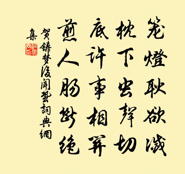 詩詞名句歷史字典書法欣賞書法字典國語詞典說文解字康熙字典古漢語字典標 題 作 者 詩 句 夢後聞蛩作者:賀鑄 朝代:宋代夢後聞蛩原文籠燈耿欲滅,枕下蟲聲切。底許事相關,煎人腸斷絕。詩詞問答問:夢後聞蛩的作者是誰?答:賀鑄問:夢後聞蛩寫於哪個朝代?答:宋代問:賀鑄的名句有哪些?答:賀鑄名句大全賀鑄夢後聞蛩書法欣賞夢後聞蛩書法作品詩詞推薦寒夜陸游〔宋代〕小隱謝城市,新寒尋褐袍。秋燈依壁暗,夜雨夾風豪。俗自隨時異,身寧與世鏖。殘年更何事,持蟹酌松醪。忘歸鄧深〔宋代〕端能來作棲霞侶,從他浮世悲今古。翻憐春色滿天台,劉阮掉頭留不住。送徐兄封川之行劉宰〔宋代〕別時觸目是愁端,適喜君懷宇宙寬。千里事人猶見喜,寄聲別駕好相看。丙申重九前後得今日都無病一句成十首方回〔宋代〕今日都無病,沉吟算此生。誓將全晚節,懶復問修程。畏事防憂患,收心入老成。近時學康節,更敢競時名。長須國駙馬詠妻長須國駙〔唐代〕花無葉不妍,女無須亦醜。丈人試遣惣無,未必不如惣有。登樓野望趙汝鐩〔宋代〕雲藏日影微吞吐,道是晴來又似陰。秋色涵空醒醉眠,雁聲到耳引歸心。暴流決岸危橋斷,古木堆煙遠寺深。自料七溪陳均〔宋代〕為愛潺湲引步遲,不知行盡白雲西。雲深忘卻來時路,吟斷空山片月低。觀中桃花次友人韻楊公遠〔宋代〕琳宮深處小桃紅,當日玄都事已空。今見花開渾似舊,不知又隔幾春風。蝶戀花方岳〔宋代〕山抹修眉橫綠淨。浦漵生寒,立盡梧桐影。香灺未消簾幕靜。醉紅如洗風吹醒。一夜秋聲連玉井。夢落孤篷,已盡禹跡寺南有沈氏小園四十年前嘗題小闋壁間偶陸游〔宋代〕楓葉初丹槲葉黃,河陽愁鬢怯新霜。林亭感舊空回首,泉路憑誰說斷腸!壞壁醉題塵漠漠,斷雲幽夢事茫茫。年來幽軒歐陽玭〔唐代〕幽軒斜映山,空澗復潺潺。重疊岩巒趣,遙來窗戶間。桃花飄岫幌,燕子語松關。衣桁侵池翠,階痕露蘚斑。臨風喜雨上使君程公許〔宋代〕塞垣昏昏纏殺氣,春陽嘆旰怪如燬。老蛟熟睡呼不起,暴尪鞭巫徒為耳。雲將族兮俄披靡,飛廉之怒誰或使,綿州寒藍元威〔宋代〕朔風陣陣送將來,日午柴門寂不開。靈照只教添短褐,孟光重喚暖深杯。苦吟檐角玲瓏玉,閒撥爐頭榾柮灰。移步涼思吳融〔唐代〕松間小檻接波平,月淡煙沉暑氣清。半夜水禽棲不定,綠荷風動露珠傾。玉岑董嗣杲〔宋代〕雲掩風林萬竅號,慧因橋畔息方袍。秦郎閒濯溪頭足,許老清揮石上毫。玉出何年迷草莽,教傳異域想波濤。山門好事近(成都賞山茶,用路漕韻)王之望〔宋代〕蕭寺兩株紅,欲共曉霞爭色。獨占歲寒天氣,正群芳休息。坐中清唱並陽春,寫物妙詩格。霜鬢自羞簪帽,嘆如何天寶題壁顧況〔唐代〕五十餘年別,伶俜道不行。卻來書處在,惆悵似前生。遺任子淵省元六首員興宗〔宋代〕平生數任李,異質苦同調。飢作一飽營,詞欲四裔照。蟲魚慎勿箋,皇墳可敷奧。我亦玩世者,畸言期久要。斯人鶯燕陳郁〔宋代〕紅杏牆連柳外門,春風池接暖煙村。陽和世界無分別,各自營巢長子孫。九懷浙水府高似孫〔宋代〕越山兮青青,江波兮噴薄。萬里兮長風,引驚瀾兮去之。夫君兮以淵為期,水何為兮勞苦。越山兮升雲,江水兮未名句推薦將壇醇酒冰漿細,元夜邀賓燈火新。趙時春《元宵飲陶總戎家二首》 情同而親合,親合而事生之。姜子牙《六韜·文韜·文師》 江燕話歸成曉別,水花紅減似春休。西風梧井葉先愁。吳文英《浣溪沙·秋情》 山路元無雨,空翠濕人衣。王維《山中》 機不密,禍先行。馮夢龍《醒世恆言·卷二十》 小池寒綠欲生漪,雨晴還日西。秦觀《阮郎歸·春風吹雨繞殘枝》 書無不可讀者!魏徵《隋書·列傳·卷四十一》 澹月梨花,借夢來、花邊廊廡。史達祖《解佩令·人行花塢》 風回雲斷雨初晴,返照湖邊暖復明。白居易《南湖早春》 門外平橋連柳堤,歸來晚樹黃鶯啼。溫庭筠《春洲曲》