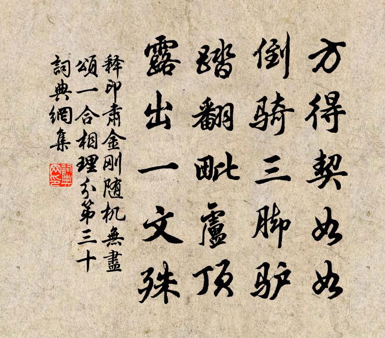 詩詞名句歷史字典書法欣賞書法字典國語詞典說文解字康熙字典古漢語字典標 題 作 者 詩 句 金剛隨機無盡頌一合相理分第三十作者:釋印肅 朝代:宋代原文方得契如如,倒騎三腳驢。踏翻毗盧頂,露出一文殊。詩詞問答問:《金剛隨機無盡頌一合相理分第三十》的作者是誰?答:釋印肅問:該詩寫於哪個朝代?答:宋代書法欣賞金剛隨機無盡頌一合相理分第三十書法作品詩詞推薦惠山泉強至〔宋代〕封寄晉陵船,東南第一泉。出瓶雲液碎,落鼎月波圓。正味雲誰別,繁聲只自憐。要須茶品對,合煮建溪先。送人南遊賈島〔唐代〕此別天涯遠,孤舟泛海中。夜行常認火,帆去每因風。蠻國人多富,炎方語不同。雁飛難度嶺,書信若為通。謁金門(聞鶯聲作)呂勝己〔宋代〕花滿樹。兩個黃鸝相語。恰似碧城雙玉女。對歌還對舞。可惜娟娟楚楚。同伴彩雲歸去。居士心如泥上絮。那能無杭州雜詩和林石田汪元量〔宋代〕偶出西湖士,新蒲緣未齊。攜來鯿縮項,買得蟹團臍。問酒入新店,喚船行舊隄。亂離多殺戮,水畔幾人啼。禪人並化主寫真求贊釋正覺〔宋代〕依樣畫胡盧,相逢識也無。蹉過了豐城埋劍,覷得破合浦還珠。題劉松年畫團扇二首宋高宗〔宋代〕荷葉如錢三月時,幅巾藜杖一追隨。爾來勝事知多少,惟有風標公子知。以詩句詠梅探請東皇第一機方蒙仲〔宋代〕東皇第一機,謾道憑花寄。那知東皇來,已落第二義。湖西雜感詩釋智圓〔宋代〕福善禍淫言可信,吉凶由己語堪陳。乖仁背義都無恥,只記臨行揀日辰。野興陸游〔宋代〕鬢邊莫笑久星星,造物常鍾我輩情。每帶餘酲蹋花影,又和殘夢聽鶯聲。軒窗風過書籤亂,洲渚潮生釣艇橫。韓子神光燦譚處端〔元代〕茫茫苦海,逐浪飄淪,痴如蜂蜜蛾燈。一向迷迷,妻妾兒女恩情。遭他恁般系絆,限臨頭、獨赴泉冥。如省悟,棄奉和御製看毛詩詩三章二章十二句一章八句夏竦〔宋代〕溫柔之教,政治之源。瞽能誦兮可以諫,士不學兮無以言。蓋成衰之所系,故諷諭之攸存。惟聖心兮垂思,永大庇靈隱長老歸舊山楊億〔宋代〕浮杯心與海鷗親,駐錫王城忽過春。麟殿九旬談妙法,曹溪一滴渡迷津。狂翻竹箭波隨棹,側布黃金地絕塵。白黑從趙崇道求蜀紙五首趙蕃〔宋代〕人偽區區信日窮,楮藤苔竹互爭雄。自從蜀紙東南見,凡馬真成一洗空。清閒口號乾隆〔清代〕人言難得是清閒,我略清閒輒赧顏。設使樂斯更何慮,滿招憂亦在其間。和劉後村梅花百詠方蒙仲〔宋代〕痴兒安得妄評彈,剛道空花用處難。最是香能蠲客醉,更如玉可滅人瘢。為盧天驥作吳則禮〔宋代〕撩我千岩固好在,未論應接徒惋欷。湖山飽窺使者節,魚鳥不避霜台威。坐罷清言良{學子換且}{學子換且},山中觀殘菊追懷眉山師伯渾陸游〔宋代〕空山菊花瘦如棘,傾倒滿地枝三尺。陰風冷雨不相貸,爛草蒼苔共狼藉。人雖委棄渠自香,詎必泛酒登華堂。君不送鄭待制閎中歸閩孫升〔宋代〕清曉都門祖帳開,路人相與歡賢哉。流塵幾翳看山眼,落日休停別酒杯。何待諸生留北闕,自存遺直在東台。連江使北文天祥〔宋代〕自說家鄉古相州,白麻風旨出狂酋。中書盡出降元表,北渡黃河衣錦游。九日青陽道中呈張主簿喻良能〔宋代〕重陽時候在青陽,野店山餚對舉觴。菊蕊半開簪鬢好,橘包初破噀人香。西風有意吹紗帽,細雨無情濕錦障。但得名句推薦風吹古木晴天雨,月照平沙夏夜霜。白居易《江樓夕望招客》 四月南風大麥黃,棗花未落桐葉長。李頎《送陳章甫》 池上憑闌愁無侶。奈此個、單棲情緒。柳永《甘草子·秋暮》 荊江日落陣雲低,橫戈躍馬今何時。納蘭性德《送蓀友》 俄而未霰零,密雪下。謝惠連《雪賦》 鳥向平蕪遠近,人隨流水東西。劉長卿《謫仙怨·晴川落日初低》 九華山路雲遮寺,清弋江村柳拂橋。杜牧《宣州送裴坦判官往舒州時牧欲赴官歸京》 有為者辟若掘井,掘井九軔而不及泉,猶為棄井也。孟子《孟子·盡心章句上·第二十九節》 紗廚藤簟,玉人羅扇輕縑。白樸《天淨沙·夏》 我歌月徘徊,我舞影零亂。李白《月下獨酌四首·其一》