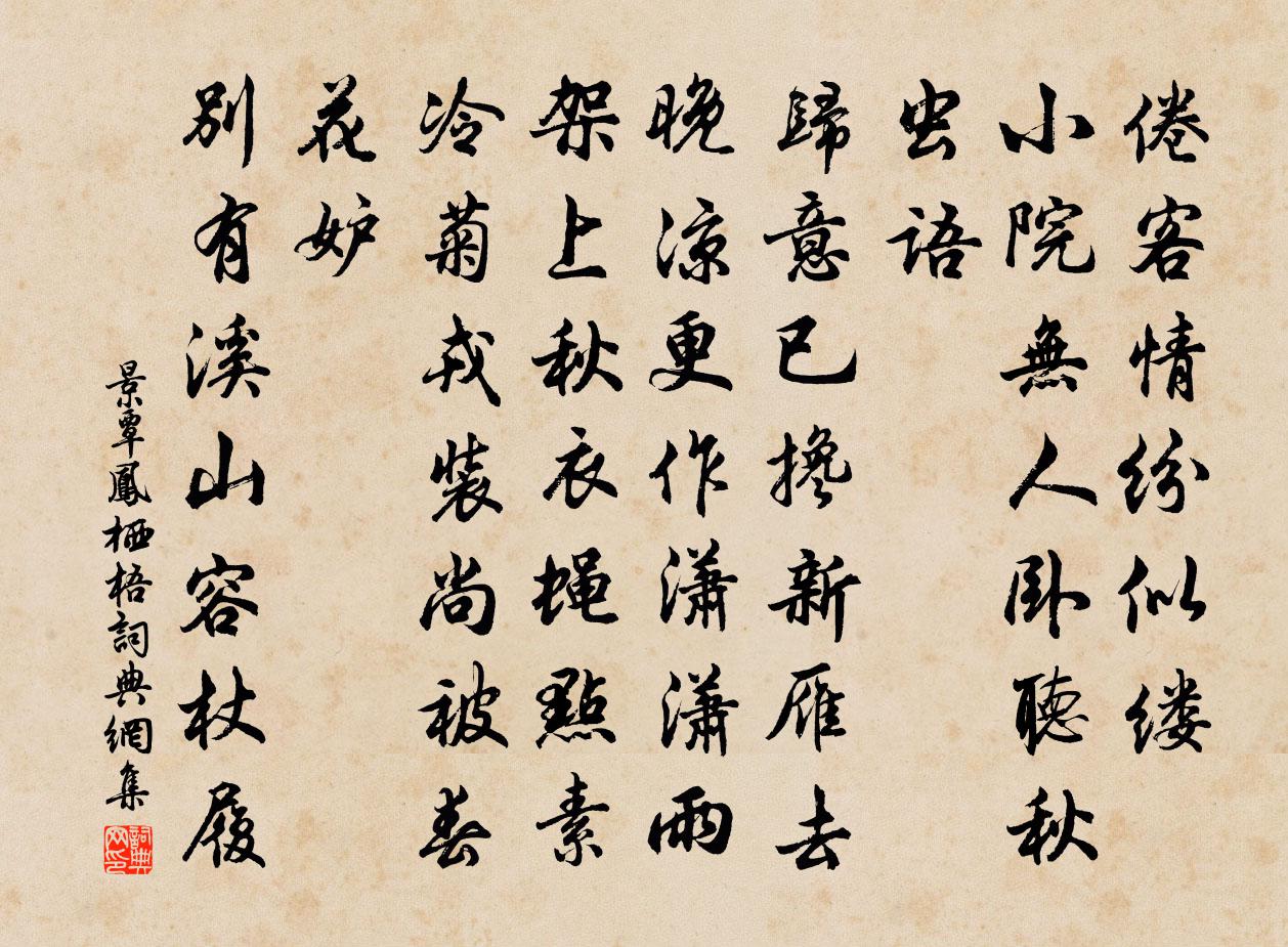 詩詞名句歷史字典書法欣賞書法字典國語詞典說文解字康熙字典古漢語字典標 題 作 者 詩 句 鳳棲梧作者:景覃 朝代:元代鳳棲梧原文倦客情紛似縷。小院無人,臥聽秋蟲語。歸意已攙新雁去。晚涼更作瀟瀟雨。架上秋衣蠅點素。冷菊戎裝,尚被春花妒。別有溪山容杖履。詩詞問答問:鳳棲梧的作者是誰?答:景覃問:鳳棲梧寫於哪個朝代?答:元代問:鳳棲梧是什麼體裁?答:詞景覃鳳棲梧書法欣賞鳳棲梧書法作品詩詞推薦次韻舒尉方岳〔宋代〕故山渺寒江,抱此明月睡。煙蓑失春鋤,萬事同一喟。可人期不來,乃獨以詩至。持觴聘梅花,我醉花亦醉。偈頌三十首釋印肅〔宋代〕自從達解本心光,陳見解者希相許。今蒙大士墜名香,妙明寂照揮倫楮。清風匝地意何窮,自這賢儒誰伴侶。自傷漁家傲陳著〔宋代〕山弄夕輝眉淡掃。溪分新水支流小。醉夢風光凝望杳。雲樹繞。杜鵑怨處誰能曉。浮世悠悠波渺渺。蝸爭何事何時嚴陵決曹易允升自官下遣騎歸,寫予老醜,因楊萬里〔宋代〕玉泉半潭冰,釣台萬岳雪。汝往訪客星,剩挾一磨衲。鄉飲酒詩王侑〔宋代〕聖主方求治,偏城敢後儒。采芹嚴祀事,序齒集生徒。黃髮居賓右,青衿隘坐隅。遠侔魯泮飲,下陋漢庭酺。席正朱令招作社獻杜耒〔宋代〕閒官得趁宰官行,農務村村早辦耕。燕子知時還記舊,社公合雨卻成晴。登壇飲福雖無稱,割肉懷歸似有情。宿露如夢令吳潛〔宋代〕昨日春衫初試。今日春寒猶殢。待得晚風收,獨上危樓閒倚。閒倚。閒倚。目斷半空煙水。舶使王會溪太守趙見泰九日領客枉顧山中賦采蒲壽宬〔宋代〕晨策登青霞,眾峰郁綢繆。舉目嗟新亭,緬懷憶神州。酣觴氣磊磊,感物心悠悠。偉哉此二翁,高風繼前修。續寄一章王沖〔宋代〕駘湯青郊祓禊辰,東池冠蓋集嘉賓。逍遙共入華胥國,綽約誰逢洛浦神。展障露花長樂際,袍攲菸草曲江濱。遙知菘苣初冬稍茂喜而有作姜特立〔宋代〕紫苣生春荑,助我作湯餅。黃菘養土膏,冰壺添雋永。凡物貴適口,何必須九鼎。況我藜藿腸,萬錢慚食頃。喜雨陸游〔宋代〕雷車隆隆南山陽,電光煜煜北斗傍;急雨橫斜生土香,草木甦醒起仆僵。芭蕉抽心鳳尾長,薜荔引蔓龍鱗蒼。葛幮偈八首釋慧遠〔宋代〕拗折秤錘,掀翻露布。突相機先,鴉飛不度。昭德皇后輓歌詞白居易〔唐代〕仙去逍遙境,詩留窈窕章。春歸金屋少,夜入壽宮長。鳳引曾辭輦,蠶休昔採桑。陰靈何處感?沙麓月無光。偈釋善能〔宋代〕萬古長空,一朝風月。不可以一朝風月昧卻萬古長空,不可以萬古長空不明一朝風月。為章道祖頗及葛藤錦薰闔葛立方〔宋代〕窈窕軒窗小闔深,種花卜得半晴陰。眼根忽隨錦繡谷,鼻觀如游檐卜林。莫問花枝有開落,須知法性勿來今。色香貢餘秘色茶盞徐寅〔唐代〕捩碧融青瑞色新,陶成先得貢吾君。巧剜明月染春水,輕施薄冰盛綠雲。古鏡破苔當席上,嫩荷涵露別江濱。中山漁父詞一十八首沐浴呂岩〔唐代〕卯酉門中作用時,赤龍時蘸玉清池。雲薄薄,雨微微,看取妖容露雪肌。月蝕葛立方〔宋代〕六月炎歊氣鬱蒸,緣空寶鏡沒埃塵。長歌不見徘徊影,並出初無齟齬輪。麟斗何因識星度,鵲飛誰復見天津。春秋壽遂寧李漕李曾伯〔宋代〕今世儒宗一泰山,暫乘紫氣下函關。主盟道學周程上,伯仲詩名李杜間。少府暫分膚使節,甘泉合在侍臣班。春江教禪人出丐求頒釋正覺〔宋代〕歷歷樞中轉化機,出門氣象履芳時。溪光麗濯紅錦段,風柳細撚黃金絲。空空不礙渾亡我,處處相逢卻是誰。會得名句推薦鄰國相望,雞犬之聲相聞,民至老死不相往來。老子《老子·德經·第八十章》 漠漠蕭蕭,香凍梨花雨。吳大有《點絳唇·送李琴泉》 殘燈明滅枕頭欹,諳盡孤眠滋味。范仲淹《御街行·秋日懷舊》 野曠天低樹,江清月近人。孟浩然《宿建德江》 為有書來與我期,便從蘭杜惹相思。莊棫《定風波·為有書來與我期》 記少年、駿馬走韓盧,掀東郭。辛棄疾《滿江紅·和范先之雪》 君子無入而不自得焉。子思《中庸·第十四章》 階下青苔與紅樹,雨中寥落月中愁。李商隱《端居》 方慚不耕者,祿食出閭里。韋應物《觀田家》 借問漢宮誰得似,可憐飛燕倚新妝。李白《清平調·其二》