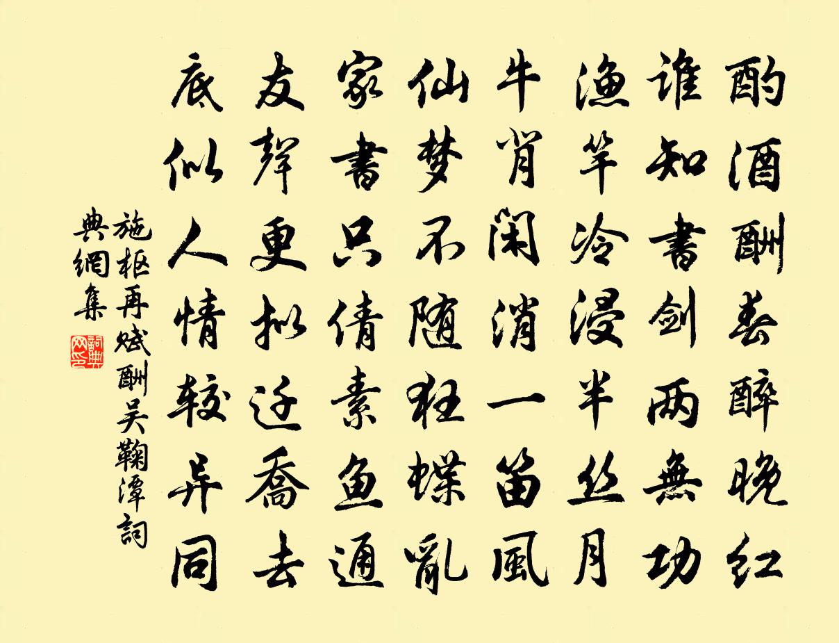 詩詞名句歷史字典書法欣賞書法字典國語詞典說文解字康熙字典古漢語字典標 題 作 者 詩 句 再賦酬吳鞠潭作者:施樞 朝代:宋代再賦酬吳鞠潭原文酌酒酬春醉晚紅,誰知書劍兩無功。漁竿冷浸半絲月,牛背閒消一笛風。仙夢不隨狂蝶亂,家書只倩素魚通。友聲更擬遷喬去,底似人情較異同。詩詞問答問:再賦酬吳鞠潭的作者是誰?答:施樞問:再賦酬吳鞠潭寫於哪個朝代?答:宋代施樞再賦酬吳鞠潭書法欣賞再賦酬吳鞠潭書法作品詩詞推薦郴江百詠並序橘井阮閱〔宋代〕蘇仙舊隱已藤蘿,橘井空來歲月多。摘葉汲泉皆朽骨,郡人猶說愈沉疴。秋夜二首韋應物〔唐代〕庭樹轉蕭蕭,陰蟲還戚戚。獨向高齋眠,夜聞寒雨滴。微風時動牖,殘燈尚留壁。惆悵平生懷,偏來委今夕。霜露食橙寄謝舍人梅堯臣〔宋代〕洞庭朱橘未弄色,襄水錦橙已變黃。玉臼搗虀憐鱠美,金盤按酒助杯香。雖生南土名猶重,未信中州客厭嘗。欲寄寄題朱元晦武夷精舍十二茶灶楊萬里〔宋代〕茶灶本笠澤,飛來摘茶國。墮在武夷山,溪心化為石。井絡李商隱〔唐代〕井絡天彭一掌中,漫夸天設劍為峰。陣圖東聚燕江石,邊柝西懸雪嶺松。堪嘆故君成杜宇,可能先主是真龍。將來頌證道歌證道歌釋印肅〔宋代〕語默動靜體安然,謝三拋下釣魚船。剛道參方不出嶺,痴人猶尚走如煙。贈句芒神李商隱〔唐代〕佳期不定春期賒,春物夭閼興咨嗟。願得句芒索青女,不教容易損年華。小酌楊萬里〔宋代〕酒入春逾勁,天寒燭始明。偶然傾一琖,政尒忽三更。自君之出矣三首薛嵎〔宋代〕自君之出矣,淚對花枝灑。風窗挑夜燈,心在無油瀉。和制帥王之望〔宋代〕卿月中天照上流,使星入蜀久西遊。蟠胸經緯開棋局,出手梟盧轉博投。學有淵源流不竭,詩如珠玉價難酬。詞章雪夜作陸游〔宋代〕雪重從壓竹,竹折有奇聲;雪深亦莫掃,小窗終夜明。我老尚耐冷,開卷對短檠。龍茶與羔酒,得失不足評。但思二疏釋文珦〔宋代〕漢朝諸公卿,鮮有能自全。廣愛信明哲,獨悟於機先。托之老氏訓,辭祿偕歸田。祖帳東都門,萬口稱其賢。於今宮詞十首張樞〔宋代〕月籠梅影夜深時,白玉排簫索獨吹。傳得官家暗宣賜,黃金約臂翠花枝。臨江仙(潮惠道中)劉克莊〔宋代〕不見仙湖能幾日,塵沙變盡形容。夜來月冷露華濃。都忘茅屋下,但記畫船中。兩岸綠陰猶未合,更須補竹添松。題謝艮齋畫笥四首王炎〔宋代〕團蒲曲幾自支頤,領略江山入座隅。若使右丞知此畫,定當閣筆輞川圖。偈頌一百二十三首釋普度〔宋代〕大機圓應,大用無方。撲碎破沙盆,滅卻 * 眼。要津把定,佛祖潛蹤。正案傍提,百發百中。詠梅五十首呈史尚書釋紹嵩〔宋代〕風饕雪虐長精神,冷葉疏花次第勻。今日含毫與題品,更無篇什寫清新。岐陽三首元好問〔金代〕百二關河草不橫,十年戎馬暗秦京。岐陽西望無來信,隴水東流聞哭聲。野蔓有情縈戰骨,殘陽何意照空城。從誰得江西報六言十首劉克莊〔宋代〕四野有農復業,三邊無虜遊魂。作烘虱詩和友,把相牛經教孫。八冬苦雨禱晴幸應劉若訥惠詩為賀因次其韻韓元吉〔宋代〕燈花作喜夜來占,樓角初晴月似鐮。便說市亭新酒美,好風寒日舞青簾。名句推薦利出者實及,怨往者害來。列子及其弟子《列子·說符》 東風夜放花千樹。更吹落、星如雨。辛棄疾《青玉案·元夕》 執子之手,與子偕老。詩經《擊鼓》 寡助之至,親戚畔之;多助之至,天下順之。孟子《孟子·公孫丑章句下·第一節》 輕衫未攬,猶將淚點偷藏史達祖《夜合花·柳鎖鶯魂》 今朝北客思歸去,回入紇那披綠羅。劉禹錫《竹枝詞二首·其二》 一重山,兩重山。山遠天高煙水寒,相思楓葉丹。李煜《長相思·一重山》 十年生死兩茫茫,不思量,自難忘。蘇軾《江城子·乙卯正月二十日夜記夢》 仙苑春濃,小桃開,枝枝已堪攀折。阮逸女《花心動·春詞》 山河破碎風飄絮,身世浮沉雨打萍。文天祥《過零丁洋》