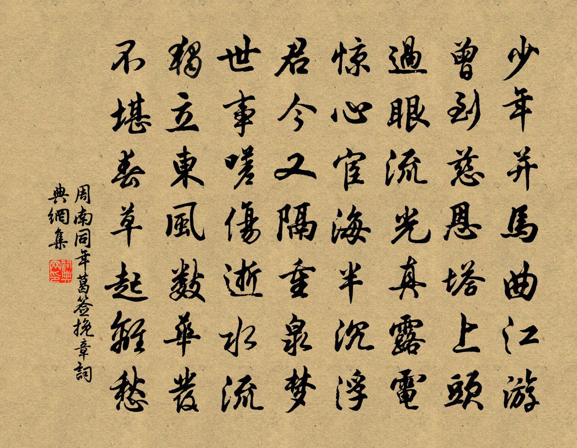 詩詞名句歷史字典書法欣賞書法字典國語詞典說文解字康熙字典古漢語字典標 題 作 者 詩 句 同年葛簽挽章作者:周南 朝代:宋代同年葛簽挽章原文少年並馬曲江游,曾到慈恩塔上頭。過眼流光真露電,驚心宦海半沉浮。君今又隔重泉夢,世事嗟傷逝水流。獨立東風數華發,不堪春草起離愁。詩詞問答問:同年葛簽挽章的作者是誰?答:周南問:同年葛簽挽章寫於哪個朝代?答:宋代周南同年葛簽挽章書法欣賞同年葛簽挽章書法作品詩詞推薦次韻何景山愛山亭李石〔宋代〕好山在樓頭,行人在樓下。愛山乃貴名,過者豈易假。而況主與客,君漫我亦且。九峰紫閣間,可玩不可把。嵐光無題釋行海〔宋代〕聽罷楊花聽竹枝,上樓偏是下樓遲。片雲歲晚皈何處,江水東流無盡時。夜聞杜鵑釋紹嵩〔宋代〕竹塢無塵水檻清,一更更盡到三更。杜鵑不管人殘夢,雨外飛來頭上聲。華嚴頂劉光第〔清代〕聞說金剛台外地,夜燈浮上獨茲峰。老猿抱子求僧飯,閒客看人打佛鐘。下界雲霞招杖屨,夕陽紅翠動杉松。風吹贈歌妓二首李商隱〔唐代〕水精如意玉連環,下蔡城危莫破顏。紅綻櫻桃含白雪,斷腸聲里唱陽關。白日相思可奈何,嚴城清夜斷經過。只知移居東村作王庭珪〔宋代〕避地東村深幾許?青山窟里起炊煙。敢嫌茅屋絕低小,淨掃土床堪醉眠。鳥不住啼天更靜,花多晚發地應偏。遙看父執德化陳宰叔概寧詩和之五邁〔宋代〕欲作好官易,與時同俯爺。欲作好人難,前修嚴矱矩。馬安為巧宦,孔光位宰輔,貽臭汗青中,詬罵之所聚。胡威江行李鹹用〔唐代〕瀟湘無事後,征棹復嘔啞。高岫留斜照,歸鴻背落霞。魚殘沙岸草,蝶寄洑流槎。共說干戈苦,汀洲減釣家。頌古三十一首釋玿〔宋代〕身世悠悠不繫舟,得隨流處且隨流。今朝有酒今朝醉,明日無錢明日愁。失鶴韓偓〔唐代〕正憐標格出華亭,況是昂藏入相經。碧落順風初得志,故巢因雨卻聞腥。幾時翔集來華表,每日沈吟看畫屏。為報宿禪智寺上方演大師院崔峒〔唐代〕石林高几許,金剎在中峰。白日空山梵,清霜後夜鍾。竹窗回翠壁,苔逕入寒松。幸接無生法,疑心怯所從。記夢陸游〔宋代〕環立江頭千萬峰,夢中於此倚枯筇。青冥誰見欹巾角,碧瀣閒將洗筆鋒。一卷素書雲笈貯,數升松麥水機舂。正呼博士王揚休碾密雲龍同事十三人飲之戲作黃庭堅〔宋代〕矞雲蒼璧小盤龍,貢包新樣出元豐。王郎坦腹飯床東,大官分物來婦翁。棘圍深鎖武成宮,談天進士雕虛空。鳴鳩戲聯回文體黃春伯〔宋代〕水連天渺渺,山映月亭亭。尾櫂依鳧渚,頭船過蓼汀。鬼神號暝壑,煙霧靄疎欞。美醖浮觴玉,輕衣拂劍星。和夷齊西山歌文天祥〔宋代〕彼美人兮,西山之薇矣。北方之人兮,為吾是非矣。異域長絕兮,不復歸矣。鳳不至兮,德之衰矣。題凝雪水仙圖王冕〔元代〕出門大江橫,銀濤數千頃。仙子御輕飈,環佩搖虛影。中宵月無光,天地冰壺淨。輕盈何所之?飛夢西湖冷。贈仙居宰陳述古鄭穆〔宋代〕我愛仙居宰,岩岩氣宇寬。百筳微出響,萬楫一生瀾。邑小天為壽,民愚地與安。經年不相見,已見欲躋難。太甲山汪應辰〔宋代〕君王自古幸游多,未必南從山澗阿。龍虎真藏金鼎火,鳳凰從食玉山禾。雲霞落日舒旗幟,琪樹西風響佩珂。伊尹余為建陽令遣小吏王堪為西山翁之役翁留之仙劉克莊〔宋代〕向來刀筆充書佐,歲晚衣巾學道流。畢竟賢於人一著,醉中夢裡忽回頭。晚春客路曾豐〔宋代〕流水綠相沸,落花紅自紛。乾坤容盎盎,草木意芸芸。布穀聲通俗,提壺語帶文。杜鵑相告處,益有激而雲。名句推薦誰知道,斷煙禁夜,滿城似愁風雨劉辰翁《永遇樂·璧月初晴》 寒食後,酒醒卻咨嗟。蘇軾《望江南·超然台作》 陶潛酷似臥龍豪,萬古潯陽松菊高龔自珍《己亥雜詩·其一百三十》 將軍發白馬,旌節度黃河。李白《發白馬》 何日請纓提銳旅,一鞭直渡清河洛。岳飛《滿江紅·登黃鶴樓有感》 漠漠輕寒上小樓,曉陰無賴似窮秋。淡煙流水畫屏幽秦觀《浣溪沙·漠漠輕寒上小樓》 荷葉羅裙一色裁,芙蓉向臉兩邊開。王昌齡《採蓮曲》 去意徊徨,別語愁難聽。周邦彥《蝶戀花·早行》 瀑布風前千尺影,疑瀉銀河一派。朱栴《念奴嬌·雪霽夜月中登樓望賀蘭山作》 不求同日生,只願同日死。施耐庵《水滸傳·第二回》