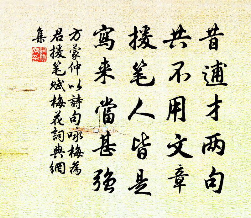 詩詞名句歷史字典書法欣賞書法字典國語詞典說文解字康熙字典古漢語字典標 題 作 者 詩 句 以詩句詠梅為君援筆賦梅花作者:方蒙仲 朝代:宋代以詩句詠梅為君援筆賦梅花原文昔逋才兩句,共不用文章。援筆人皆是,寫來當甚強。詩詞問答問:以詩句詠梅為君援筆賦梅花的作者是誰?答:方蒙仲問:以詩句詠梅為君援筆賦梅花寫於哪個朝代?答:宋代方蒙仲以詩句詠梅為君援筆賦梅花書法欣賞以詩句詠梅為君援筆賦梅花書法作品詩詞推薦自喻王安石〔宋代〕岸涼竹娟娟,水淨菱帖帖。蝦搖浮游須,魚鼓嬉戲鬣。釋杖聊一愒,褰裳如可涉。自喻適志歟,翩然夢中蝶。又同塵庵釋宗杲〔宋代〕塵無自性,攬真成立。擬和其光,同亦俱失。外既匪寬,內亦不窒。是義非虛,亦復非實。庵中主人,如玉處石。頌古十七首釋師觀〔宋代〕佛法王法,更無兩樣。直下一刀,未為諦當。高宗皇帝輓詞五首宋孝宗〔宋代〕不謂神仙窟,今時異昔時。鼎湖龍去遠,社首鳳來遲。顧畢三年制,驚聞七月期。痛心思繼代,不忘有聲詩。清平樂(次韻李提刑炁白笑詞並呈李參政壁)魏了翁〔宋代〕誰分天種。來上花鬘供。綠葉素雲姿雅重。那得愁心頻捧。他花自是無工。不關香淡香濃。才問為誰含笑,盈盈靴訪隱者不遇趙汝鐩〔宋代〕兩腋乘西風,送我上高岑。竹根一泉通,石徑萬木森。中有隱者居,敗屋莓苔侵。山空人不見,雲滿掛壁琴。兩鶴大酺 [永昌元年]杜審言〔唐代〕聖后乘乾日,皇明御歷辰。紫宮初啟坐,蒼璧正臨春。雷雨垂膏澤,金錢贈下人。詔酺歡賞遍,交泰睹惟新。李長者贊釋宗杲〔宋代〕以一毛端智,遍量法界空。智空無自性,空智在其中。炭步港觀螢孔武仲〔宋代〕九華之南蘆葦長,流螢夕起不計雙。爛如神仙珠玉闕,青羅掩映千明釭。空江沉沉未見月,近浦穿林起還滅。魚游四疊劉克莊〔宋代〕通宵璧月迷瓊樹,破曉霜葩糝玉枝。明艷能花老夫眼,溫柔不粟美人肌。西亭子言懷張謂〔唐代〕數叢芳草在堂陰,幾處閒花映竹林。攀樹玄猿呼郡吏,傍谿白鳥應家禽。青山看景知高下,流水聞聲覺淺深。官屬朱天永示仆二詩蓋有激而雲者因用其韻以廣之虞儔〔宋代〕是非得喪一毫輕,蠻觸何勞角上爭。未可輕量天下士,渠知不是彀中英。平生我亦輕餘子,到處君安得此名。勿對群荷晁公溯〔宋代〕群荷醫清瀾,不受明月光。明月每下照,但見露瀼瀼。炯如翠蓋中,珠璣爛熒煌。我起欲挹之,傾瀉入方塘。減字木蘭花(送別)蘇軾〔宋代〕玉觴無味。中有佳人千點淚。學道忘憂。一念還成不自由。如今未見。歸去東園花似霰。一語相開。匹似當初本不次前韻蘇轍〔宋代〕閉門何所事,毛髮日青青。齒折登山屐,塵生貰酒瓶。調心開貝葉,救病讀《難經》。定起無人見,寒燈一點星。送友人建康入道連文鳳〔宋代〕鬱郁文章不稱時,豈堪寂寞寄人籬。早知亂後為儒誤,始恨年來入道遲。春晚茅山猶有術,秋深商嶺已無芝。何當次韻曾吉父食酥二首王洋〔宋代〕聞道金城煮{左酉右冥}{左酉右蠡},貢包長伴雨兒梨。好今萬里風流在,浙水東頭又浙西。人我張伯端〔宋代〕我不異人,人心自異。人有親疏,我無彼此。水陸飛行,等觀一體。貴賤尊卑,首足同己。我尚非我,何嘗有你。觀雲寄簡講師樓鑰〔宋代〕蒼狗俄然又白衣,來從何處去何歸。無心出岫還歸去,莫向秋風說是非。月夜觀花陳文蔚〔宋代〕底事更深睡不感,惜花愛月兩關情。黑甜一枕雖雲美,未省人間有此清。名句推薦花意爭春,先出歲寒枝。辛棄疾《江神子·賦梅寄余叔良》 霜草蒼蒼蟲切切,村南村北行人絕。白居易《村夜》 憶共人人睡魂蝶亂,夢鸞孤。趙長卿《更漏子·燭消紅》 未必素娥無悵恨,玉蟾清冷桂花孤。晏殊《中秋月》 坐開桑落酒,來把菊花枝。杜甫《九日楊奉先會白水崔明府》 人間萬事,毫髮常重泰山輕。辛棄疾《水調歌頭·壬子三山被召陳端仁給事飲餞席上作》 流光容易把人拋,紅了櫻桃,綠了芭蕉。蔣捷《一剪梅·舟過吳江》 井中之無大魚也,新林之無長木也。呂不韋《呂氏春秋·覽·有始覽》 名不徒生,而譽不自長。功成名遂。墨子《墨子·02章 修身》 明朝且做莫思量,如何過得今宵去。周紫芝《踏莎行·情似遊絲》