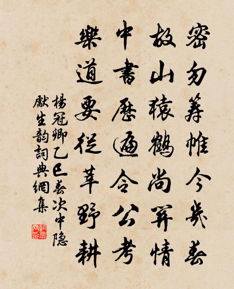 詩詞名句歷史字典書法欣賞書法字典國語詞典說文解字康熙字典古漢語字典標 題 作 者 詩 句 乙巳春次中隱先生韻作者:楊冠卿 朝代:宋代乙巳春次中隱先生韻原文密勿籌帷今幾春,故山猿鶴尚關情。中書歷遍令公考,樂道要從莘野耕。詩詞問答問:乙巳春次中隱先生韻的作者是誰?答:楊冠卿問:乙巳春次中隱先生韻寫於哪個朝代?答:宋代楊冠卿乙巳春次中隱先生韻書法欣賞乙巳春次中隱先生韻書法作品詩詞推薦何家港舍舟步至新河口崔敦禮〔宋代〕夾岸蘆蒿障日微,拍堤波浪濺人衣。隔江喚得漁船守,貫柳雙鱸自買歸。水調歌頭王罙高〔宋代〕今夕是何夕,南極見祥光。自天飄下佳氣,五色覆黃堂。為借鹽梅妙手,暫對褲襦歡頌,森戟護凝香。餘事剩吟詠用前韻作雪詩留景文蘇軾〔宋代〕萬松嶺上黃千葉,載酒年年踏松雪。劉郎去後誰復來,花下有人心斷絕。東齋夜坐搜雪句,兩手龜坼霜須折。無情聽箏姜特立〔宋代〕鶢鶋設鐘鼓,固已非所樂。我今對秦箏,聽之亦藐藐。老人難遣日,藉此慰牢落。此意只有知,勿令兒輩覺。詩一首呂希純〔宋代〕夢寐西山結草廬,逝將臨水詠游魚。何人見卵求時夜,更著間言問紫姑。頌十玄談塵異釋印肅〔宋代〕濁者自濁清自清,一輪堅白不容塵。鏡中妍醜誰分別,水月融光爭法身。君用承事載酒筠溪上分韻得竹字李彌遜〔宋代〕高荷蓋水臨風曲,美人卻扇耀紅玉。溪翁愛這看不卟,密竹陰中坐幽獨。南鄰新醅手自灑,貯以鴟夷轉山腹。折松望江南張繼先〔宋代〕西源好,雨霽斂紅紗。碧水靜搖招釣叟,綠苔寒迫起漁家。攜駕會春茶。風浩浩,錦蔭石屏華。濯鼎上方敲翠竹,醉仙崖魯百能〔宋代〕高倚青冥插酒星,山崖誰作醉仙形。從來天地為衾枕,應笑人間有獨醒。宿杭州虛白堂李郢〔唐代〕秋月斜明虛白堂,寒蛩唧唧樹蒼蒼。江風徹曉不得睡,二十五聲秋點長。頌古一百首釋智愚〔宋代〕力難抬處為君言,神駿保勞更著鞭。一躍洞天三十六,到時凡骨也成仙。踏莎行胡翼龍〔宋代〕合數冰蓮,注情金葉。臂痕猶記嗔時跡。小樓幾個月黃昏,荷香柳影都知得。問字燈深,學書窗黑。衣襟詩卷留殘慶建州葉守劉克莊〔宋代〕袖中凝香未必非,建人惟恐我公歸。安知世有孤寒士,側聽黃麻侍袞衣。禪人並化主寫真求贊釋正覺〔宋代〕妙了常存,幽靈不昏。偏正旋樞臼,離微見道根。微塵 * 大經出,冷口開時諸佛吞。隨緣歷歷,得用門門。成褫挽曹侍郎方岳〔宋代〕筆橐上嚴宸,真為侍從臣。袖中周禮在,言外孔堂春。亟草閒居賦,寧慚勇退人。空餘文作冢,書帶已成塵。聞杜鵑有感王遂〔宋代〕人物同為氣所乘,良心露處即良能。天津有此驚康節,西蜀無之感少陵。秋懷六首洪邁〔宋代〕真儒六經學,文字聊解紛。長孺棄諸侯,漢庭相公孫。兒口乳未乾,妄作黑白分。誰能領斯會,事往風中雲。為長溪令夢中作楊備〔宋代〕月俸蚨錢數甚微,不知從宦幾時歸。東吳一片輕波在,欲問何人買釣磯。木蘭花慢 送親衛劉副使遷成都統軍,公號舜劉敏中〔元代〕燦星纏寶校,跨天駟、日華邊。看嶺表孤松,峰尖秋隼,誰與爭先。君王識公英武,便除書、飛下九重天。內府彤又代賀皇太子生日詩二首李劉〔宋代〕粲粲祥煙繞虎闈,歡聲催捧未央卮。干戈東序承平日,袞冕南郊負見時。行中鸞和真合禮,宴陪魚藻舊聞詩。宮僚名句推薦人者多欲,其性尚私。來俊臣《羅織經·閱人卷第一》 平林漠漠煙如織,寒山一帶傷心碧。李白《菩薩蠻·平林漠漠煙如織》 市恩不如報德之為厚,要譽不如逃名之為適,矯情不如直節之為真。陳繼儒《小窗幽記·集醒篇》 愁損翠黛雙蛾,日日畫闌獨憑。史達祖《雙雙燕·詠燕》 對朝雲靉靆,暮雨霏微,亂峰相倚。黃庭堅《醉蓬萊》 胡瓶落膊紫薄汗,碎葉城西秋月團。王昌齡《從軍行七首》 水光瀲灩晴方好,山色空濛雨亦奇。蘇軾《飲湖上初晴後雨二首·其二》 江南三月聽鶯天,買酒莫論錢。吳錫麒《少年游·江南三月聽鶯天》 雲無心以出岫,鳥倦飛而知還。陶淵明《歸去來兮辭·並序》 春愁凝思結眉心,綠綺懶調紅錦薦。顧敻《玉樓春·拂水雙飛來去燕》