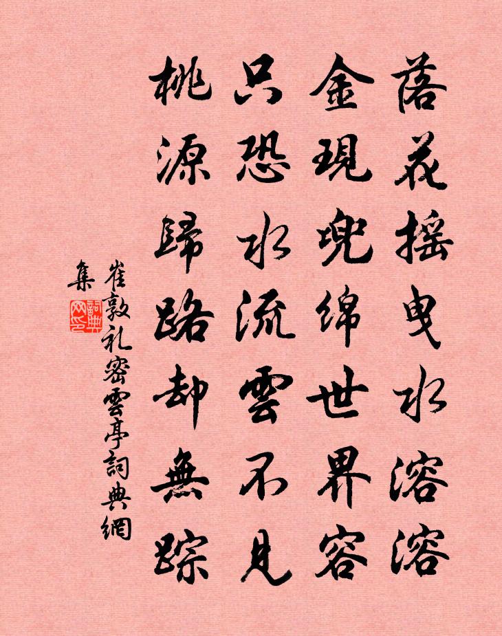 詩詞名句歷史字典書法欣賞書法字典國語詞典說文解字康熙字典古漢語字典標 題 作 者 詩 句 密雲亭作者:崔敦禮 朝代:宋代密雲亭原文落花搖曳水溶溶,金現兜綿世界容。只恐水流雲不見,桃源歸路卻無蹤。詩詞問答問:密雲亭的作者是誰?答:崔敦禮問:密雲亭寫於哪個朝代?答:宋代崔敦禮密雲亭書法欣賞密雲亭書法作品詩詞推薦某用家弟韻賦絕句上浼清視蕪詞累句非敢以為陳與義〔宋代〕萬里平生幾蛇足,九州何路不羊腸。只應綠士蒼官輩,卻解從公到雪霜。亮知客釋普寧〔宋代〕主中賓句驗來端,四海禪流總被瞞。鐵磨機輪難經擬,逢人即出舌翻瀾。大安二年夏四月大將軍出祖王羊二公於城南堂陸雲〔魏晉〕攸攸昊天。南正興言。朱明有曄。萬葉翠繁。昌雲垂天。凱風熙顏。王臣在此。貽宴於歡。明老惠炭戲以二小詩韓元吉〔宋代〕雪裡難逢送炭人,地爐炙手便生春。酸寒東野真堪笑,解道曲身成直身。題浯溪胡寅〔宋代〕戎馬胡為踐神京,翠華東巡朝太清。扶桑大明涌少海,虎符百萬屯雲興。皇威意無窮髮北,老傅坐籌自巾幗。謀臣望靈山喜而又作陳文蔚〔宋代〕白雲深處認靈山,喜氣津津眉宇間。別去庭闈今八月,且欣明日慰新顏。詠雪董思恭〔唐代〕天山飛雪度,言是澆花朝。惜哉不我與,蕭索從風飄。鮮潔凌紈素,紛糅下枝條。良時竟何在,坐見容華銷。西江月晁端禮〔宋代〕去路湘桃破萼,歸時乳燕巢梁。不成一事又還鄉。也是經春遊盪。香爐重燃鸂鶒,羅衾再拂鴛鴦。今宵應解話愁腸寄泉州孝忠光禪師李邴〔宋代〕曩歲曾經度厄津,深將法力荷雲門。如今稍覺神明復,擬欲酬師不報恩。送洛陽韓丞東遊韋應物〔唐代〕仙鳥遊戲何飄颻,遊戲綠衣翠為遊戲襟。顧我差池羽,咬咬懷好音。徘徊洛陽中,遊戲清川潯。神交不在結,歡愛見遠亭魏某〔宋代〕金山鰲聳壓蓬宮,見遠堂開萬象空。心與天游身世外,眼隨雲到有無中。嶺頭樹接蒼梧北。海面帆來日本東。此景政黃牛贊釋了惠〔宋代〕屈膝跨牛腰,山遙水更遙。有詩吟未就,白鷺下溪橋。蜀使歸寄青城上官道人陸游〔宋代〕輕別青城十二年,至今客枕夢林泉。一杯松屑齋前進,兩卷丹經肘後傳。欲與公為塵外侶,幾時身上峽中船?世間宮怨李益〔唐代〕露濕晴花春殿香,月明歌吹在昭陽。似將海水添宮漏,共滴長門一夜長。江行有惠梅花者因憶杜少陵雲江上被花惱不徹袁說友〔宋代〕去年短櫂孤山閣,尋得橫斜在籬落。帶花飲酒六七人,醉傍錢塘城下泊。今年江上花惱時,無處告訴狂如痴。一枝晨起陸游〔宋代〕晨起梳頭拂面絲,行年七十豈前期。此生猶著幾兩屐?長日惟消一局棋。空釜生魚忍貧慣,閒門羅雀與秋宜。區區不顯名大檀越請偈釋慧遠〔宋代〕單提直指若為參,貝葉靈文滿寶函。無我無人無壽者,塵塵剎剎是瞿曇。賀新涼/賀新郎姚勉〔宋代〕窗月梅花白。夜堂深、燭搖紅影,繡簾垂額。半醉金釵嬌應坐,寒處也留春色。深意在、四弦輕摘。香塢花行聽啄人日懷成父弟趙蕃〔宋代〕人日雨連元日陰,杜陵時節已如今。苔迷草色閒多思,竹倚梅花瘦不禁。徵事還愆退之集,題詩漫有蜀州心。溪南應真二首劉克莊〔宋代〕支解讎人毒,香塗施主恩。對天剖腸胃,倒海洗親冤。名句推薦論山水,則循聲而得貌;言節侯,則披文而見時。劉勰《文心雕龍·辨騷》 前哲以善人爲寶,不以珠玉爲寶李大師、李延壽《南史·列傳·卷十三》 自是荷花開較晚,孤負東風。幼卿《浪淘沙·極目楚天空》 河水縈帶,群山糾紛。李華《弔古戰場文》 口之宣言也,善敗於是乎興左丘明《國語·周語·邵公諫厲王弭謗》 中年親友難別,絲竹緩離愁。蘇軾《水調歌頭·安石在東海》 秋聲萬戶竹,寒色五陵松。李頎《望秦川》 枕上潛垂淚,花間暗斷腸。魚玄機《贈鄰女 / 寄李億員外》 千萬恨,恨極在天涯。溫庭筠《夢江南·千萬恨》 山上層層桃李花,雲間煙火是人家。劉禹錫《竹枝詞九首·其九》