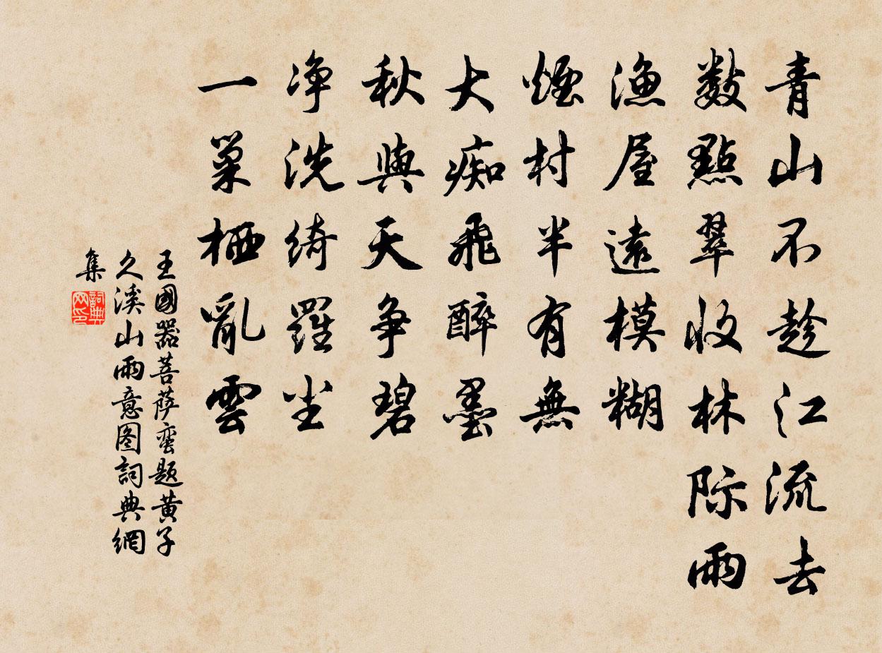 詩詞名句歷史字典書法欣賞書法字典國語詞典說文解字康熙字典古漢語字典標 題 作 者 詩 句 菩薩蠻 題黃子久溪山雨意圖作者:王國器 朝代:元代原文青山不趁江流去。數點翠收林際雨。漁屋遠模糊。煙村半有無。大痴飛醉墨。秋與天爭碧。淨洗綺羅塵。一巢棲亂雲。詩詞問答問:《菩薩蠻 題黃子久溪山雨意圖》的作者是誰?答:王國器問:該詩寫於哪個朝代?答:元代問:該詩是什麼體裁?答:詞書法欣賞菩薩蠻 題黃子久溪山雨意圖書法作品詩詞推薦滿江紅石孝友〔宋代〕簾卷南薰,微雨過、天容似沐。開綺燕,紅蕖別館,綠槐高屋。靈壽杖橫龍脊瘦,長年酒釀鵝兒熟。喚飛瓊、親捧沉綿陸游〔宋代〕沉綿久未平,寂寞閉柴荊。危葉先霜墜,殘螢冒雨明。記書由默誦,得食出躬耕。此事吾親驗,方當告後生。贈鄭季洪季洪屢以詩文見示王洋〔宋代〕近無鄰曲雜塵氛,遠有聲名海內聞。白雪兩眉誰顧我,青銅三百擬邀君。波濤人筆潮千尺,義勇橫胸士六軍。早辨文宣王及其弟子贊宋高宗〔宋代〕易之為書,彌合天地。五十乃學,師則有是。子能受授,洗心傳世。知機其神,宜被厥祀。寄劉八山中皇甫冉〔唐代〕東皋若近遠,苦雨隔還期。閏歲風霜晚,山田收穫遲。茅檐燕去後,樵路菊黃時。平子游都久,知君坐見嗤。再涉南羅渡賀鑄〔宋代〕滯水生苔沒馬蹄,漲沙隱約見金堤。禹功寖久人無繼,未信東流不復西。再游虎丘二首陳造〔宋代〕闔廬歸骨地,僧宇庇高丘。又趁能詩伴,來為弔古游。英雄餘幅紙,歲月莽東流。未解山前客,相逢更說愁。劉商觀奕圖石刻本王冕〔元代〕棋畔樵人斧柯爛,正與劉商舊畫同。粉默消磨雕刻在,神仙飄忽有無中。青霞惟見兩童子,白髮吾鄰四老翁。休把早發斜溝道中寄王有元賀鑄〔宋代〕處處春林有鳥啼,恨無芳酒一樽攜。何緣復得彭城夢,日日東風送我西。杏塠莊雜詠閻爾梅〔清代〕早歲狂歌晚歲僧,名山賞過幾千層。滄桑風景隨時幻,兀坐荒林對一燈。舟出江陵南浦,奉寄鄭少尹(審)杜甫〔唐代〕更欲投何處,飄然去此都。形骸元土木,舟楫復江湖。社稷纏妖氣,干戈送老儒。百年同棄物,萬國盡窮途。雨洗題龍歸寺壁楊萬里〔宋代〕題字才前歲,沖寒又此行。竹能知雨至,窗不隔江清。走檄還曾了,禁人未肯晴。息肩更須喜,問路可憐生?丹青閣徐璣〔宋代〕翠靄空霏忽有無,筆端誰著此工夫。溪山本被人圖畫,卻道溪山是畫圖。合溪座上錢時〔宋代〕深碧沉沉冷欲秋,此時亭上飽追游。溪分溪合關何事,尚欠圜機訂九流。斷句劉昶〔南北朝〕白雲滿鄣來,黃塵暗天起。關山四面絕,故鄉幾千里。閒興姜特立〔宋代〕天氣正清和,人清物意嘉。綠樹蔭屋角,微風起檐牙。挾書仲舒園,種菊淵明家。逍遙無一事,遠志凌青霞。鎮江文天祥〔宋代〕鐵甕山河舊,金甌宇宙非。昔隨西日上,今見北軍飛。豪傑非無志,功名自有機。中流懷士稚,風雨濕雙扉。楊州官滿辭后土題玉立亭崔與之〔宋代〕天上人間一樹花,五年於此駐高牙。不隨紅藥矜春色,為愛霜筠耐歲華。四塞風沈天籟寂,半庭月冷市塵賒。臨行次陸倅韻三首崔敦禮〔宋代〕暖煙和氣滿西州,載酒當輕萬戶侯。官事水知何日了,風光宜及早春遊。簿書叢里偷閒去,景物妍時到處留。莫被讀史范成大〔宋代〕百歲虧成費械機,烏鳶螻蟻竟同歸。一檠燈火挑明滅,兩眼昏花管是非。名句推薦賈生年少虛垂淚,王粲春來更遠遊。李商隱《安定城樓》 惟上惟己,去表求實,奸者自見矣。來俊臣《羅織經·察奸卷第八》 蠻姜豆蔻相思味。算卻在、春風舌底。吳文英《杏花天·詠湯》 四月十七,正是去年今日,別君時。韋莊《女冠子·四月十七》 妾身獨自眠,月圓人未圓。王元鼎《憑欄人·閨怨》 晴煙漠漠柳毿毿,不那離情酒半酣。韋莊《古離別》 磧里征人三十萬,一時回向月明看。李益《從軍北征》 城中桃李愁風雨,春在溪頭薺菜花。辛棄疾《鷓鴣天·陌上柔桑破嫩芽》 有不可及之志,必有不可及之功王永彬《圍爐夜話·第一三O則》 今朝有酒今朝醉,明日愁來明日憂。佚名《增廣賢文·上集》