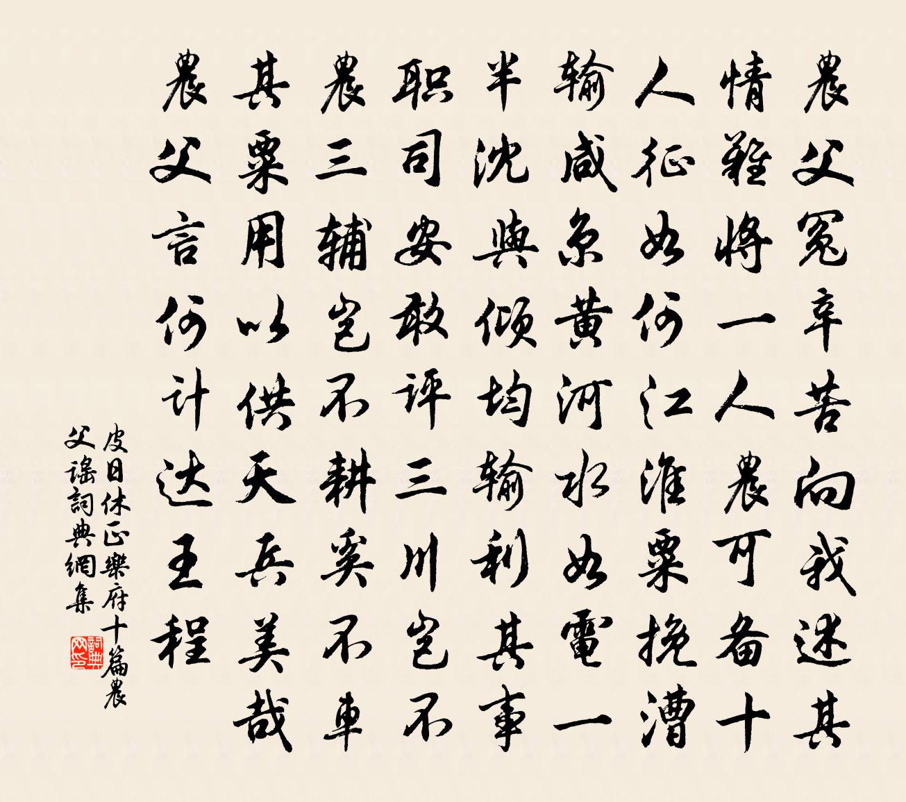 詩詞名句歷史字典書法欣賞書法字典國語詞典說文解字康熙字典古漢語字典標 題 作 者 詩 句 正樂府十篇農父謠作者:皮日休 朝代:唐代正樂府十篇農父謠原文農父冤辛苦,向我述其情。難將一人農,可備十人征。如何江淮粟,挽漕輸鹹京。黃河水如電,一半沈與傾。均輸利其事,職司安敢評。三川豈不農,三輔豈不耕。奚不車其粟,用以供天兵。美哉農父言,何計達王程。詩詞問答問:正樂府十篇農父謠的作者是誰?答:皮日休問:正樂府十篇農父謠寫於哪個朝代?答:唐代皮日休正樂府十篇農父謠書法欣賞正樂府十篇農父謠書法作品注釋全唐詩:卷608-13詩詞推薦同諸公秋日游昆明池思古儲光羲〔唐代〕僕人理車騎,西出金光逵。蒼蒼白帝郊,我將游靈池。太陰連晦朔,雨與天根違。淒風披田原,橫污益山陂。農畯減蘭朱彝尊〔清代〕犀梳在手,逋髮未撩勻面後。眉語心知,引過閒房步步隨。頹香暖玉,牽拂腰巾帶重來。一段歸雲,誰驗蛇醫臂上夏夜陸游〔宋代〕鳴蜩斷復續,宿鳥久始安。觸熱汗沾衣,暮夜猶未乾。梧桐獨知秋,一葉墮井闌。行矣戒碪杵,四序環無端。題郴陽道中一古寺壁二絕秦觀〔宋代〕門掩荒寒僧未歸,蕭蕭庭菊兩三枝。行人到此無腸斷,問爾黃花知不知。菩薩蠻范成大〔宋代〕彤樓鼓密催金輪。沈沈青瑣重重幕。宣喚晚朝天。五雲籠暝煙。風急東華路。暖扇遮微雨。香霧撲人衣。上林烏滿水龍吟(壽吳尉·七月初一)程霽岩〔宋代〕夏秋晦朔之間,伊誰為作交承主。顒昂仙伯,挺生此日,賓涼餞暑。絳縣老人,問將甲子,恰今歲數。舉香山晏會愧謝詩河湄鬼〔唐代〕我本邯鄲士,祇役死河湄。不得家人哭,勞君行路悲。大風雷雨袁說友〔宋代〕雷風一息到山西,欹側村花不自持。際晚甘霖如倒峽,今年香雪可翻匙。綠秧蘸腳元非揠,白水齊腰不恨遲。浪說戲贈嘉興朱宰同年王禹偁〔宋代〕縣前蘇小舊荒墳,應作行雲入夢頻。猶勝白公尉盩厔,庭花剛喚作夫人。長門怨劉皋〔唐代〕營營孤思通,寂寂長門夜。妾妒亦知非,君恩那不借。攜琴就玉階,調悲聲未諧。將心寄明月,流影入君懷。十分吟邵雍〔宋代〕所謂十分人,須有十分事。事苟不十分,終是未完備。事父盡其心,事兄盡其意。事君盡其忠,事師盡其義。夏日題老將林亭張蠙〔唐代〕百戰功成翻愛靜,侯門漸欲似仙家。牆頭雨細垂纖草,水面風回聚落花。井放轆轤閒浸酒,籠開鸚鵡報煎茶。幾人別盧綸暢當〔唐代〕故交君獨在,又欲與君離。我有新秋淚,非關宋玉悲。送張支使陳師道〔宋代〕曠度逢知晚,高才處下難。清秋一鶚上,拭目萬人看。白酒初同醉,黃花已戒寒。憑將衰老事,一一報長安。聽鶯曲韋應物〔唐代〕東方欲曙花冥冥,啼鶯相喚亦可聽。乍去乍來時近遠,才聞南陌又東城。忽似上林翻下苑,綿綿蠻蠻如有情。欲囀送杜使君朝覲貫休〔唐代〕借寇借不得,清聲徹帝聰。坐來千里泰,歸去一囊空。遺愛封疆熟,扳轅草木同。路遙山不少,江靜思無窮。花舸偈頌一百三十六首釋惟一〔宋代〕雨暗西山,雲飛南浦。老盧仙腰纏騎鶴,朝度黃茅八凸。獨秀峰草木泉石為之鼓舞。因甚如此,家貧原鄰富。與錢孝先游洞霄韓松〔宋代〕芒鞋踏明月,入谷聞泉聲。了知非人間,泠然毛骨輕。夜投羽士宮,道話留三更。凌晨訪幽洞,岩穴何崢嶸。仙凡送曾公善赴定武吳則禮〔宋代〕關河熊落落孤鴻熊飛,燕然山南霜草齊。邊笳戍角自悲壯,千里不聞邊馬嘶。刁斗夜急虎帳靜,皎皎隴月臨牙旗。宿農家戴復古〔宋代〕宿此屋頭閣,瓦窗通月明。夜深鸜鵒噪,人靜桔槔聲。村落有古意,田園關客情。儒衣成底事,所得是虛名。名句推薦日落謝家池館,柳絲金縷斷。韋莊《歸國遙·春欲晚》 物莫非指,而指非指。公孫龍《公孫龍子·指物論》 讀書破萬卷,下筆如有神。杜甫《奉贈韋左丞丈二十二韻》 股肱體合,則四海和平;上下猜貳,則封疆幅裂。姚察、姚思廉《梁書·列傳·卷五十六》 雨恨雲愁,江南依舊稱佳麗。王禹偁《點絳唇·感興》 耽於女樂,不顧國政,則亡國之禍也。韓非及後人《韓非子·十過》 非懷北歸興,何用勝羈愁韓愈《洞庭湖阻風贈張十一署·時自陽山徙掾江陵》 差之毫厘,失之千里。佚名《增廣賢文·上集》 相思處、青年如夢,乘鸞仙闕。文天祥《滿江紅·和王夫人滿江紅韻以庶幾後山妾薄命之意》 西湖到日,重見梅鈿皺。吳文英《瑞龍吟·送梅津》