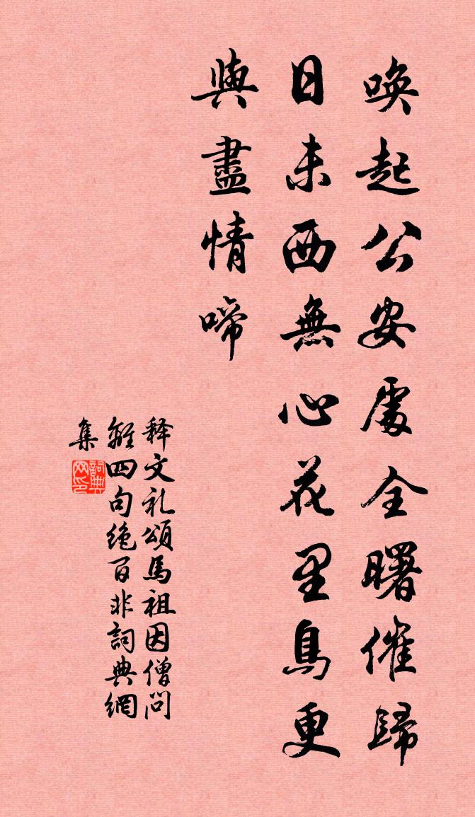 詩詞名句歷史字典書法欣賞書法字典國語詞典說文解字康熙字典古漢語字典標 題 作 者 詩 句 頌馬祖因僧問離四句絕百非作者:釋文禮 朝代:宋代頌馬祖因僧問離四句絕百非原文喚起公1*1安處全曙,催歸日未西。無心花里鳥,更與盡情啼。詩詞問答問:頌馬祖因僧問離四句絕百非的作者是誰?答:釋文禮問:頌馬祖因僧問離四句絕百非寫於哪個朝代?答:宋代釋文禮頌馬祖因僧問離四句絕百非書法欣賞頌馬祖因僧問離四句絕百非書法作品詩詞推薦為簡公約賦素琴堂郟僑〔宋代〕素琴之堂虛且清,素琴之韻淪杳冥。神閒意定默自鳴,宮商不動誰與聽。堂中道人骨不俗,貌龐形端顏瑩玉。我嘗徐稚山給事慶八十樂語口號陸游〔宋代〕欲知主聖本臣忠,傾盡嘉謨沃舜聰。同載方如周呂尚,安車不數漢申公。日烘盎盎花光暖,燭映鱗鱗酒浪紅。白首送汪莊仲赴江東倉幕強仲荊門簽判樓鑰〔宋代〕之子游何許,平州更玉州。山川稱勝絕,幕府信風流。翠巘寒逾秀,金蓮夜不收。天涯念鄉國,少上仲宣樓。開東園路北至山腳因治路傍隙地雜植花草陸游〔宋代〕病眼逢人每嬾開,正須此地洗氛埃。數枝梅向林梢出,一脈泉從嶺背來。藤杖有時緣石磴,風爐隨處置茶杯。殘軀魏漕彥成昔宰弋陽政績上聞召對改秩予適當詞胡寅〔宋代〕解到周公謂魯公,尚書深見古人風。流傳頓廣誰之力,千古須知魏與洪。雜詠一百首廣成子劉克莊〔宋代〕不能戰涿鹿,聊復隱崆峒。揮手謝軒帝,毋煩順下風。昌言見督詩債戲絕句司馬光〔宋代〕學餒才貧杼軸勞,逾年避債負詩豪。倒囊不惜償虛券,未敵瓊瑤舊價高。到家方岳〔宋代〕路遠都無信,燈花亦未知。晴看寒食近,歸及牡丹時。親卻俱差健,兒猶不解痴。在家貧亦好,雪夢幾相思。送文慧師歸眉山司馬光〔宋代〕至人心如雲,去住叭所適。飄搖涉四海,豈復校喧寂。朅來王城游,紅塵暖晨夕。忽思還故峰,不可留宿昔。離合訪道者不遇(一作訪僧不遇)於武陵〔唐代〕人間惟此路,長得綠苔衣。及戶無行跡,遊方應未歸。平生無限事,到此盡知非。獨倚松門久,陰雲昏翠微。臨江仙姚述堯〔宋代〕憶昨曾將明使指,軺車踏遍東城。重來遊戲擁雙旌。江山皆故部,英俊盡門生。杖策翩然歸去也,送行滿坐簪纓。到桂州黃庭堅〔宋代〕桂嶺環城如雁盪,平地蒼玉忽嶒峨。李成不在郭熙死,奈此百嶂千峰何。答問詩十二篇寄呈滿子權其三耒問鎛王令〔宋代〕一畦失之荒,爾力亦可耨。天下方漫蕪,爾功亦何有。雜興張鎡〔宋代〕風月屬漁樵,真味豈能領。雍容補國手,斯宜理煙艇。樂天未歸時,極口獻忠鯁。十上九不行,回身避機穽。酒徒登育王山示現塔贈鄉璉與三上人王銍〔宋代〕危岫戴寶塔,亭亭起虛空。金鐸韻廣樂,日夜鏘天風。氣真逼雲漢,興逸追鸞鴻。嘉有三禪子,超曠棲禪宮。相追宿清虛庵二首董嗣杲〔宋代〕來此看雲內欲仙,竹窗秋霧蓊爐煙。西風正滿溪頭樹,直送寒聲到枕前。公無渡河白玉蟾〔宋代〕君不見猿啼蒼梧煙,風捲瀟湘水。雙蛾無處挽重瞳,粉篁點點凝春淚。又不見鶴飲瑤池月,露泣龜台花。百官極目竹溪直院盛稱起予草堂詩之善暇日覽之多有可劉克莊〔宋代〕□□□琴癖,淵明獨不然。所藏聊備物,欲拊更無弦。焦尾珍無價,朱絲絕有年。曾參徽外趣,肯向譜中傳。抱在過李將軍南鄭林園觀妓劉長卿〔唐代〕郊原風日好,百舌弄何頻。小婦秦家女,將軍天上人。鴉歸長郭暮,草映大堤春。客散垂楊下,通橋車馬塵。落成王朝奉廟以薄恙不獲預謝謝劉宰並諸鄉丈陳傅良〔宋代〕橫塘一字比南金,滿紙書勞屬意深。太史不知收拾未,邦人父老淚漸襟。名句推薦不說自己井繩短,反說他人箍井深。佚名《增廣賢文·下集》 賞罰不可輕行,用人彌須慎擇。吳兢《貞觀政要·卷三·論擇官》 九曲黃河萬里沙,浪淘風簸自天涯。劉禹錫《浪淘沙·九曲黃河萬里沙》 永豐柳,無人盡日飛花雪。張先《千秋歲·數聲鶗鴂》 孔子亦矙其亡也,而往拜之。孟子《孟子·滕文公章句下·第七節》 杯酒相延,今夕不應慳。陳著《江城子·中秋早雨晚晴》 失之東隅,收之桑榆。范曄《後漢書·列傳·馮岑賈列傳》 力田已告成,計日宜收藏。黃燮清《秋日田家雜詠》 汀洲采白苹,日落江南春。柳惲《江南曲》 箭在弦上,不得不發羅貫中《三國演義·第三十二回》