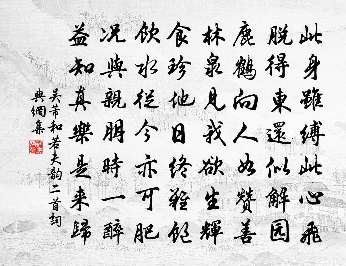 詩詞名句歷史字典書法欣賞書法字典國語詞典說文解字康熙字典古漢語字典標 題 作 者 詩 句 和若夫韻二首作者:吳芾 朝代:宋代和若夫韻二首原文此身雖縛此心飛,脫得東還似解園。鹿鶴向人如贊善,林泉見我欲生輝。食珍他日終難飽,飲水從今亦可肥。況與親朋時一醉,益知真樂是來歸。詩詞問答問:和若夫韻二首的作者是誰?答:吳芾問:和若夫韻二首寫於哪個朝代?答:宋代吳芾和若夫韻二首書法欣賞和若夫韻二首書法作品詩詞推薦春懷寄秣陵知友儲嗣宗〔唐代〕廬江城外柳堪攀,萬里行人尚未還。借問景陽台下客,謝家誰更臥東山。朝中措 與石子璋別,求作樂府,得麻字元好問〔金代〕驚弦裂石筆生華。清興入悲笳。為愛南山夜獵,笑人杜曲桑麻。高歌醉眼,千金駿馬,八月仙槎。都把平生湖海,謝程帥袁制使陳造〔宋代〕世人事誇毗,失得紛滅起。回思少年日,失腳幾墮此。尚友千載人,得已吾徑已。高眠北窗風,賢否付一指。送文著上人游越姚合〔唐代〕水石隨緣豈計程,東吳相遇別西京。夜禪月下袈裟濕,曉上山巔錫杖鳴。念我為官應易老,羨師依佛學無生。越中水龍吟丁宥〔宋代〕雁風吹裂雲痕,小樓一線斜陽影。殘蟬抱柳,寒蛩入戶,淒音忍聽。愁不禁秋,夢還驚客,青燈孤枕。未更深,早緣識宋太宗〔宋代〕深秋雲物冷,經雨斗添寒。盡日緣情坐,霜葉易燋右乾。偈傾一百三十三首釋法薰〔宋代〕和尚子,莫妄想。懷州牛吃禾,益州馬腹脹。南山饒你七穿八穴,也未兔手中痛棒。偶書黃庚〔宋代〕豪氣消磨盡,攜書客海濱。文章難遇主,天地不鄰貧。家累依劉表,妻兒笑買臣。彼蒼還可問,吾道幾時春。嘉泰三年皇后冊寶十三首佚名〔宋代〕虹輝璨爛,雲篆綢繆。絳節前導,瑞光上浮。瑤階玉扉,既集長秋。欽承天寵,永荷帝休。酒泉太守席上醉後作岑參〔唐代〕酒泉太守能劍舞,高堂置酒夜擊鼓。胡笳一曲斷人腸,座上相看淚如雨。雜興十首劉克莊〔宋代〕策免身常佚,登庸貌轉癯。富公忘杖起,迂叟要人扶。偈六十三首釋道寧〔宋代〕兵隨印轉,將逐符行。把斷要關,不通音信。山寺老僧李洞〔唐代〕雲際眾僧里,獨攢眉似愁。護茶高夏臘,愛火老春秋。海浪南曾病,河冰北苦游。歸來諸弟子,白遍後生頭。高士詠於陵夫妻吳筠〔唐代〕皎皎於陵子,己賢妻亦明。安茲道德重,顧彼浮華輕。琴書不為務,祿位不可榮。逃跡終灌園,誰能達世情。春來聞故舊多雲亡者作詩示同志曾幾〔宋代〕雁足曾無一字收,有時書到卻生愁。故人疊疊半黃壤,今我蕭蕭全白頭。大抵百年皆逝水,可憐萬事只浮漚。朝聞石榴蘇軾〔宋代〕風流意不盡,獨自送殘芳。色作裙腰染,名隨酒盞狂。和子瞻西太一宮祠二首張耒〔宋代〕玉斝清晨薦酒,天風靜夜飄香。鳳吹管截孤竹,琴弦曲奏瀟湘。題近藁二首劉克莊〔宋代〕吾年開八秩,形槁更心灰。禪縛病居士,詩殃凍秀才。無功上麟閣,有案在烏台。攻苦三千首,誰曾著價來。送李著作赴四明趙湘〔唐代〕暫辭芸閣伴,欲上海邊城。地近瀛州見,山連越水迎。駐帆寒草動,移旆曉霞明。到日新題出,登高待雪晴。宿芙蓉驛方岳〔宋代〕鳳皇山下芙蓉驛,零落殘碑半蝕苔。黃鳥有時穿戶過,青山地數摺溪回。麥秋天氣半明暗,蠶月人家忌往來。俯仰名句推薦君以為易,其難也將至矣。左丘明《國語·晉語·郭偃論治國之難易》 王師北定中原日,家祭無忘告乃翁。陸游《示兒》 舊山松竹老,阻歸程。岳飛《小重山·昨夜寒蛩不住鳴》 浮雲一別後,流水十年間。韋應物《淮上喜會梁川故人 / 淮上喜會梁州故人》 金鞍玉勒尋芳客,未信我廬別有春。于謙《觀書》 垂柳覆金堤,蘼蕪葉復齊。薛道衡《昔昔鹽》 俄而未霰零,密雪下。謝惠連《雪賦》 恨身翻不作車塵,萬里得隨君。歐陽炯《巫山一段雲·春去秋來也》 軍井成而後飲,軍食熟而後飯,軍壘成而後舍,勞佚必以身同之。尉繚《尉繚子·戰威》 千里搭長棚,沒有不散的筵席。曹雪芹《紅樓夢·第七十二回》
