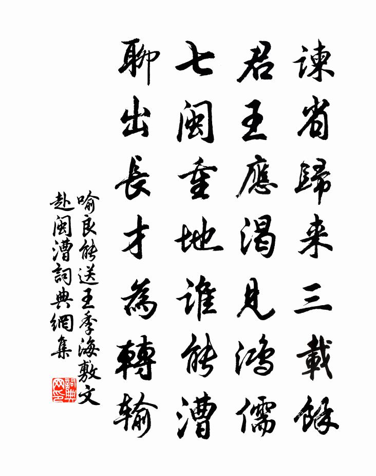 詩詞名句歷史字典書法欣賞書法字典國語詞典說文解字康熙字典古漢語字典標 題 作 者 詩 句 送王季海敷文赴閩漕作者:喻良能 朝代:宋代送王季海敷文赴閩漕原文諫省歸來三載餘,君王應渴見鴻儒。七閩重地誰能漕,聊出長才為轉輸。詩詞問答問:送王季海敷文赴閩漕的作者是誰?答:喻良能問:送王季海敷文赴閩漕寫於哪個朝代?答:宋代喻良能送王季海敷文赴閩漕書法欣賞送王季海敷文赴閩漕書法作品詩詞推薦釋奠詩應令江總〔隋代〕奠余幣久。辰良景暮。黍稷非馨。苹蘩式昨。崇敬台保。昭彰審諭。翠蓋移陰。斑輪徐渡。題資州東岩鄭鋼〔宋代〕逕轉得幽谷,雲岩屹相向。谽谺偃重檐,彎環依疊嶂。緬想融結初,鐫鑱自天匠。了無斧鑿跡,但覺盤根壯。深可記十五日夜星犯月李曾伯〔宋代〕兩月之間星入斗,疇昔之夜星入月。入斗前史驗虜走,入月韓詩應虜滅。昭然垂象不輕示,適驗天心厭胡羯。此胡惠昭皇太子輓歌詞二首權德輿〔唐代〕前星落慶霄,薤露逐晨飆。宮仗黃麾出,仙遊紫府遙。空嗟鳳吹去,無復雞鳴朝。今夜西園月,重輪更寂寥。東朝題僧院引泉姚合〔唐代〕泉眼高千尺,山僧取得歸。架空橫竹引,鑿石透渠飛。洗藥溪流濁,澆花雨力微。朝昏長繞看,護惜似持衣。雪中陸游〔宋代〕忽忽悲窮處,悠悠感歲華。暮雲如潑墨,春雪不成花。眼澀燈生暈,詩成字半斜。殘尊已傾盡,試起問東家。頌一百則釋重顯〔宋代〕列聖叢中作者知,法王法令不如斯。會中若有仙陀客,何必文殊下一搥。對菊花二首張耒〔宋代〕官閒身世兩悠悠,種竹栽花一散愁。 * 叢邊對疏雨,一年懷抱此時秋。留題李休山居林逋〔宋代〕俗口喧喧利與名,到君風品即難憑。曾將五老關秋夢,只愛南薰是正聲。鳥戀藥棚長獨立,樹欺詩壁半旁生。公車次韻朱少章潭雷鋒馬上口占洪皓〔宋代〕燕國由來士女都,家家行樂集城隅。豈無魚鳥如靈沼,若有傳鱸似太湖。我縶南冠嘗獨到,君邀北使欲相呼。驅車詠快活三首陳藻〔宋代〕小船密坐頸難伸,儘是饑寒不遇身。快活幾聲天地里,相看疑我是顛人。和曾谹父庚伏書懷六首王洋〔宋代〕垣衣侵砌竹穿牆,日日蕭條氣運涼。急雨滿池鳴兩部,幽奇不獨水雲鄉。陳子西投贈長句走筆次韻奉酬張鎡〔宋代〕作詩我恨無新功,良田所積未始豐。君侯保事有此癖,判卻不費平生窮。容台故人作書至,百篇古體緘幐中。剪裁挽宜人李氏曾豐〔宋代〕養成中饋德,留與後人言。翰墨其餘事,詩書蓋上根。不徒為大母,猶復見曾孫。蕭瑟堂前意,青蔥雨後萱。念奴嬌(和陳元載中秋小集)劉一止〔宋代〕燕台暮集,對秋容淒緊,松陰冪冪。徙倚闌邊臨翠壑,千頃風煙橫出。坐待冰輪,天空雲散,一色如蒼璧。姮娥有曉起聞雨范成大〔宋代〕老來稍喜睡魔清,兀坐枯株聽五更。蕭索輪囷憐燭燼,飛揚跋扈厭蚊聲。登高事了從教雨,刈熟人忙卻要晴。莫教贈劉琨詩二十首 十三盧諶〔魏晉〕相彼反哺。尚在翔禽。孰是人斯。而忍斯心。每憑山海。庶覿高深。遐眺存亡。緬成飛沉。曉雨錢時〔宋代〕一路慳慳五日晴,曉來煙雨又籠春。蓬窗只是添詩句,煙雨何曾惱得人。秋江寫望林逋〔宋代〕蒼茫沙嘴鷺鷥眠,片水無痕浸碧天。最愛蘆花經雨後,一蓬煙火飯魚船。杜詩晁說之〔宋代〕古人愁在吾愁里,庾信江淹可共論。孰似少陵能嘆息,一身牢落識乾坤。名句推薦齊有倜儻生,魯連特高妙。李白《古風·齊有倜儻生》 不是花中偏愛菊,此花開盡更無花。元稹《菊花》 嘆十年心事,休休莫莫。吳潛《滿江紅·豫章滕王閣》 兩情若是久長時,又豈在朝朝暮暮。秦觀《鵲橋仙·纖雲弄巧》 銅華滄海,愁霾重嶂,燕北雁南天外。吳文英《永遇樂·乙巳中秋風雨》 橫戈從百戰,直為銜恩甚。李白《塞下曲六首》 矜高倨傲,無非客氣降伏得,客氣下而後正氣伸洪應明《菜根譚·概論》 君子以行言,小人以舌言佚名《孔子家語·顏回》 好景落誰詩句里,蹇驢馱我畫圖間。趙渢《黃山道中》 語來江色暮,獨自下寒煙。李白《尋雍尊師隱居》