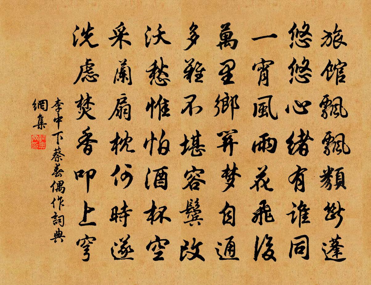 詩詞名句歷史字典書法欣賞書法字典國語詞典說文解字康熙字典古漢語字典標 題 作 者 詩 句 下蔡春偶作作者:李中 朝代:唐代下蔡春偶作原文旅館飄飄類斷蓬,悠悠心緒有誰同。一宵風雨花飛後,萬里鄉關夢自通。多難不堪容鬢改,沃愁惟怕酒杯空。采蘭扇枕何時遂,洗慮焚香叩上穹。詩詞問答問:下蔡春偶作的作者是誰?答:李中問:下蔡春偶作寫於哪個朝代?答:唐代問:下蔡春偶作是什麼體裁?答:七律李中下蔡春偶作書法欣賞下蔡春偶作書法作品注釋全唐詩:卷748-28詩詞推薦呈葛撫州二首趙蕃〔宋代〕試說臨川郡,江西第一州。晏王今邑子,顏謝古諸侯。未覺流風遠,端知物望優。峴山猶得擬,湛輩肯容不。題陽義溪亭壁佚名〔宋代〕碧雲亭上碧雲飛,竟日迴環面翠微。梅萼破香知我盡,柳梢含綠認春歸。風前古潤琴天疊,雪後群峰玉一圍。遙想晚投南村衛葉〔唐代〕客行逢日暮,原野散秋暉。南陌人初斷,西林鳥盡歸。暗蓬沙上轉,寒葉月中飛。村落無多在,聲聲近搗衣。少年游歐陽修〔宋代〕肉紅圓樣淺心黃。枝上巧如裝。雨輕煙重,無憀天氣,啼破曉來妝。寒輕貼體風頭冷,忍拋棄、向秋光。不會深心和張可投詩十首王洋〔宋代〕楚楚才名六尺身,此間襟度有殊珍。瓶無餘粟難論富,篋有風光不似貧。蘇州十詠其八伍相廟范仲淹〔宋代〕胥也應無憾,至哉忠孝門。生能酬楚怨,死可報吳恩。直氣海濤在,片心江月存。悠悠當日者,千載祗慚魂。梧葉兒吳西逸〔元代〕香隨夢,肌褪雪,錦字記離別。春去情難再,更長愁易結。花外月兒斜,淹粉淚微微睡些。西齋睡起楊萬里〔宋代〕小睡西齋聽雨涼,竹雞聲里夢難長。開門山色都爭入,只放青蒼一冊方。古意王昌齡〔唐代〕桃花四面發,桃葉一枝開。欲暮黃鸝囀,傷心玉鏡台。清箏向明月,半夜春風來。劉伯川席上作楊士奇〔明代〕飛雪初停酒未消,溪山深處踏瓊瑤。不嫌寒氣侵入骨,貪看梅花過野橋。安道再登制科石介〔宋代〕雄辭磅礴壓群英,再戰戈矛稅更精。裴度韜鈐無失律,武侯節制是神兵。千人盡服徂丘議,九合誰乾小白盟。帝宋蟬李劉〔宋代〕露滿枯腸蛻頓輕,山林那有不平鳴。薰弦寂寞無人續,故揖清風作頌聲。挽陳運管安人孫氏薛嵎〔宋代〕舅家如母在,慟哭淚沾襟。平日經聲斷,茲晨佛力深。墓廬猶手構,梱則是夫箴。山上半慈竹,從知契夙心。送趙明叔分教潮陽胡仲弓〔宋代〕昌黎遺俗在,興教更煩君。地產無名木,春生半水芹。詩歌麟趾化,筆補鱷魚文。莫厭官氈冷,相期粉省芸。送葉秀才王初〔唐代〕快騎璁瓏刻玉羈,河梁返照上征衣。層冰春近蟠龍起,九澤雲閒獨鶴飛。行想北山清夢斷,重遊西洛故人稀。漢庭次韻趙雲中飲呈孟君復二首方回〔宋代〕可遨昆閬步瀛萊,只愛鑽腮笑靨開。暮雨朝雲元易散,昏鍾曉鼓故相催。身如病鶴猶遺骨,心似焦桐亦未灰。縱使墨梅 其四王冕〔元代〕莫厭緇塵染素衣,山間林下自相宜。玉堂多少閒風月,老子熟眠殊不知。和元常侍除浙東留題路貫〔唐代〕謝安致理逾三載,黃霸清聲徹九重。猶輟珮環歸鳳闕,且將仁政到稽峰。林間立馬羅千騎,池上開筵醉一鍾。共喜貞女吟文同〔宋代〕身外無一簪,何以供鉛華。飾行不飾容,濁水白藕花。藕心亂如絲,妾心圓如珠。絲亂端緒多,珠圓瑕纇元。焉得元稹徐鈞〔宋代〕元和詩體夙馳聲,巧致公台只暫榮。綠野主人天下望,不應疏外負平生。名句推薦夜覺曉非,今悔昨失顏之推《顏氏家訓·序致篇》 語來江色暮,獨自下寒煙。李白《尋雍尊師隱居》 泥融飛燕子,沙暖睡鴛鴦。杜甫《絕句二首》 竹竿有甘苦,我愛抱苦節。孟郊《苦寒吟》 年少辭家從冠軍,金鞍寶劍去邀勛。王涯《塞下曲二首·其二》 一曲新詞酒一杯,去年天氣舊亭台。晏殊《浣溪沙·一曲新詞酒一杯》 秋風夜渡河,吹卻雁門桑。王昌齡《塞下曲·秋風夜渡河》 以近知遠,以一知萬,以微知明。荀子《荀子·非相》 桃李不言,下自成蹊。司馬遷《史記·李將軍列傳》 朔吹飄夜香,繁霜滋曉白。柳宗元《早梅》