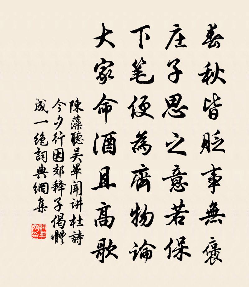 詩詞名句歷史字典書法欣賞書法字典國語詞典說文解字康熙字典古漢語字典標 題 作 者 詩 句 聽吳畢聞講杜詩今夕行因郊釋子偈體成一絕作者:陳藻 朝代:宋代原文春秋皆貶事無褒,莊子思之意若保。下筆便為齊物論,大家命酒且高歌。詩詞問答問:《聽吳畢聞講杜詩今夕行因郊釋子偈體成一絕》的作者是誰?答:陳藻問:該詩寫於哪個朝代?答:宋代書法欣賞聽吳畢聞講杜詩今夕行因郊釋子偈體成一絕書法作品詩詞推薦後催租行范成大〔宋代〕老父田荒秋雨里,舊時高岸今江水。傭耕猶自抱長飢,的知無力輸租米。自從鄉官新上來,黃紙放盡白紙催。賣衣府尹歐陽公以臨書智信篇為貺謹以長句酬謝蘇頌〔宋代〕八法能工世罕精,帥鈐多暇錄遺經。言稱智信文毋害,體具真行筆不停。勢似公權題殿壁,心希逸少寫黃庭。下僚題俞時琰杏山堂醫許月卿〔宋代〕妖冶來奔夜色昏,毅然絕谷有神明。春融庭畔一簾柳,秋滿湖邊萬頃雲。蕩滌胃腸無穢濁,洞明空色有真清。陳樓奉使鎮州,行次承天行營,奉酬裴司空韓愈〔唐代〕竄逐三年海上歸,逢公復此著征衣。旋吟佳句還鞭馬,恨不身先去鳥飛。天人吟邵雍〔宋代〕知盡人情天豈異,未知何啻隔天地。少時氣銳未更諳,不信人間有難事。知盡人情與天意,合而言之安有二。能推游華岳歸道中望仙掌晁補之〔宋代〕深岩踏遍尋歸路,仙掌依然在碧虛。無限遊人重駐馬,豈惟狂客倒騎驢。掛圖天漢朝霞上,落影秦關夕照余。千古水調歌頭蔣士銓〔清代〕偶為共命鳥,都是可憐蟲。淚與秋河相似,點點注天東。十載樓中新婦,九載天涯夫婿,首已似飛蓬。年光愁病里絕句杜甫〔唐代〕兩個黃鸝鳴翠柳,一行白鷺上青天。窗含西嶺千秋雪,門泊東吳萬里船。絕句李流謙〔宋代〕霜乾木脫氣堅明,病骨驚寒亦強行。折得梅花全未吐,不慶於我尚含情。頌古八首釋雲〔宋代〕家人卦變作明夷,爻象分明不待推。無動無謀終吉慶,有求有用即迍危。華亭吳江道中偶作十絕朱長文〔唐代〕妖華傾國豈無情,忍復顰眉見越兵。若使將軍猶好色,安能三徙更成名。酬程近秋夜即事見贈韓翃〔唐代〕長簟迎風早,空城澹月華。星河秋一雁,砧杵夜千家。節候看應晚,心期臥亦賒。向來吟秀句,不覺已鳴鴉。江南五首劉克莊〔宋代〕宣勸猶疑鴆,龍顏笑引觴。絡鞍奉明主,執梃長降王。壬寅和謝拙逸寄芳洲韻徐瑞〔宋代〕調埃野馬謾勞形,遠相高標愧此生。已許過從陪杖屢,敢辭來往涉途程。幔亭山色長如畫,破衲秋風自有情。更待念欲春遊春既莫矣而在伯微恙不近杯勺作小詩趙蕃〔宋代〕屢有一杯約,況今三月來。屬君繙藥裹,而我欠詩材。楚塞稀紅蕊,僧坊剩綠苔。幾時能出郭,分韻與徘徊。山中秋夜喜周士閒見過陳羽〔唐代〕青山高處上不易,白雲深處行亦難。留君不宿對秋月,莫厭山空泉石寒。水調歌頭(武昌南樓落成,次王漕韻)李廷忠〔宋代〕撫景幾今古,遺恨此江山。百年形勝,但見幽草雜枯菅。多少名流登覽,賴有神扶壞棟,詩墨尚斑斑。風月要磨洗偈頌七十八首釋正覺〔宋代〕碧琉璃色水澄清,紫磨金光身瑩明。洗淨方知不受垢,釋迦老子此時生。【中呂】賣花聲 月夜李致遠〔元代〕雲消皎月篩簾影,夢破驚烏繞樹聲,挑燈起誦《太玄經》。竹軒風定,桂窗人靜,快詩人一襟清興。送同年朱元直監稅馮時行〔宋代〕會計牛羊道益光,幽蘭不佩亦芳香。前郎未必辭官小,我輩惟知作法涼。客抱只消潘鬢白,俸囊無奈朔身長。要知名句推薦夫謀必素見成事焉,而後履之左丘明《國語·吳語·越王勾踐命諸稽郢行成於吳》 坐看黑雲銜猛雨,噴灑前山此獨晴。崔道融《溪上遇雨二首》 鷦鷯尚存一枝,狡兔猶藏三窟羅貫中《三國演義·第六十回》 日暮漢宮傳蠟燭,輕煙散入五侯家。韓翃《寒食》 種豆南山下,草盛豆苗稀。陶淵明《歸園田居·其三》 布衣得暖真為福,千金平安即是春。佚名《增廣賢文·下集》 飛來山上千尋塔,聞說雞鳴見日升。王安石《登飛來峰》 野者上,園者次。陸羽《茶經·一之源》 兒女已在眼,眉目略不省。陳師道《示三子》 復恐匆匆說不盡,行人臨發又開封。張籍《秋思》